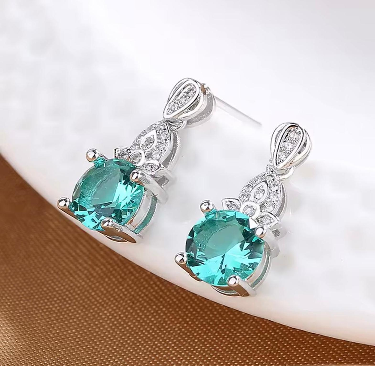 These striking silver-made drop earrings feature a deep aqua-colored, cushion-cut main stone suspended beneath a shimmering, ornamental bail. The vibrant gem and accent stones provide a luxurious burst of color and brilliant sparkle, ideal for special occasions.