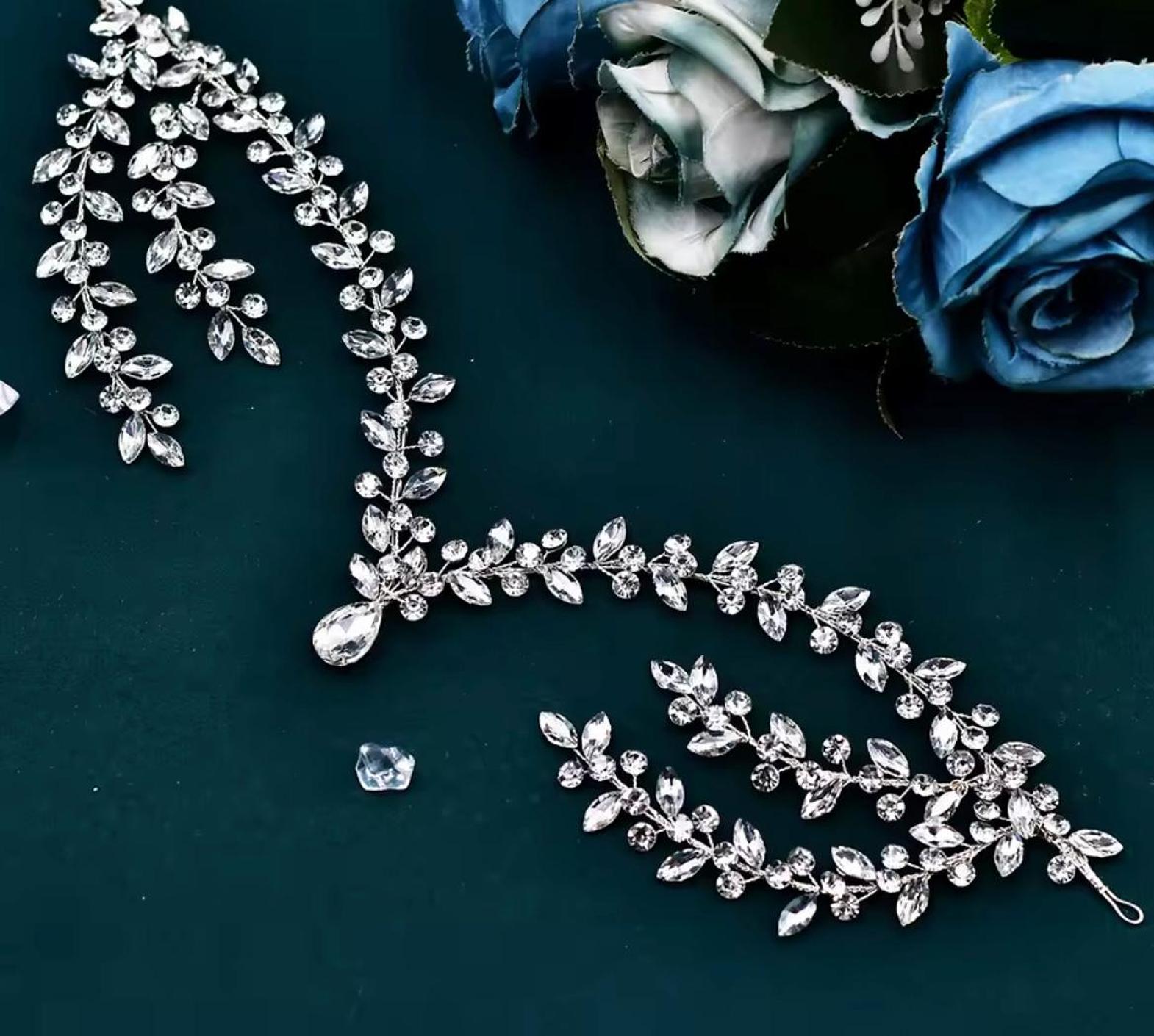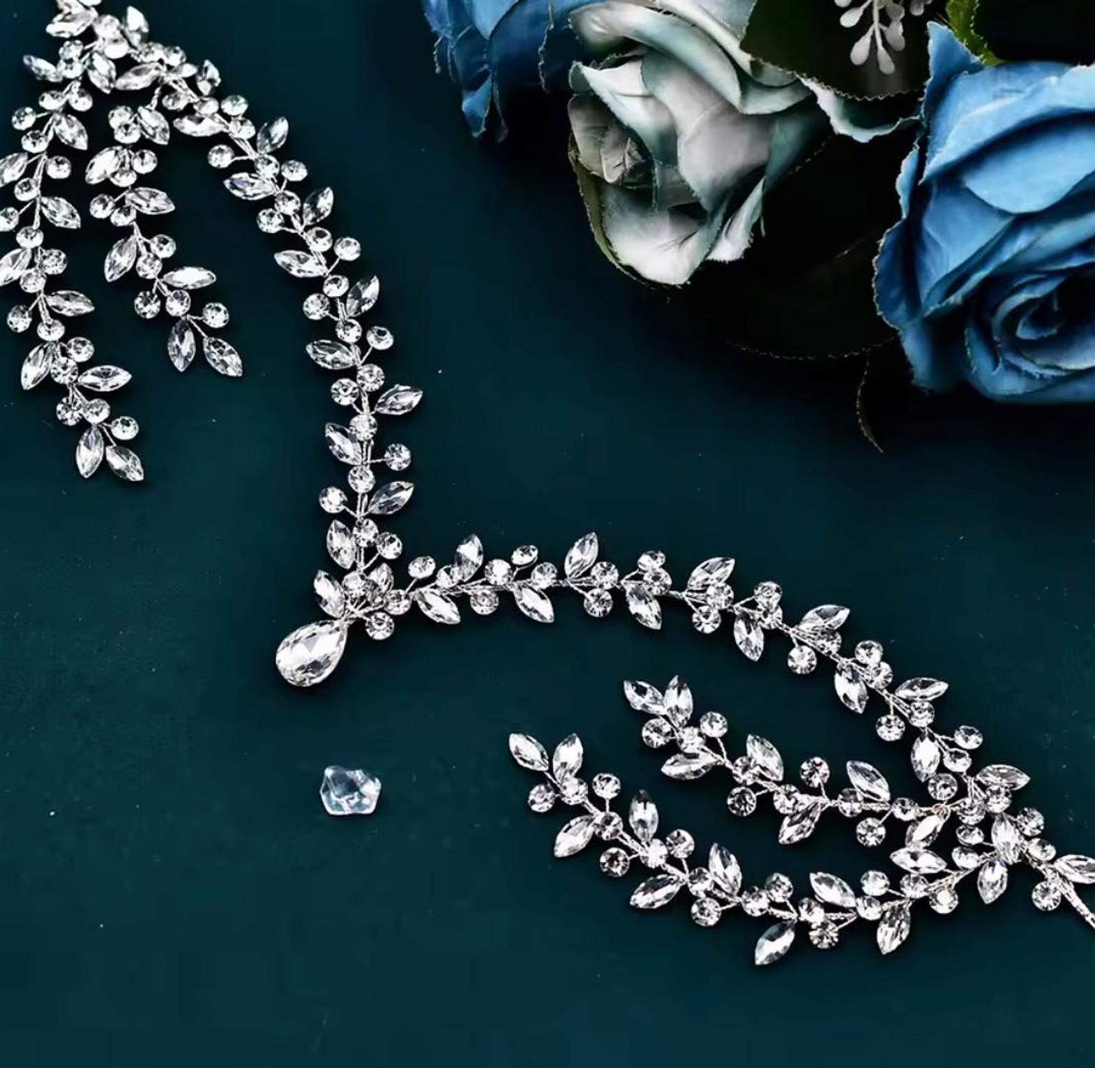 This magnificent, flexible hair vine is intricately detailed with a sweeping leafed pattern, featuring dozens of brilliant, clear crystals. Its versatile design allows it to be worn as an elegant brow band, woven into an updo, or used as a sash.