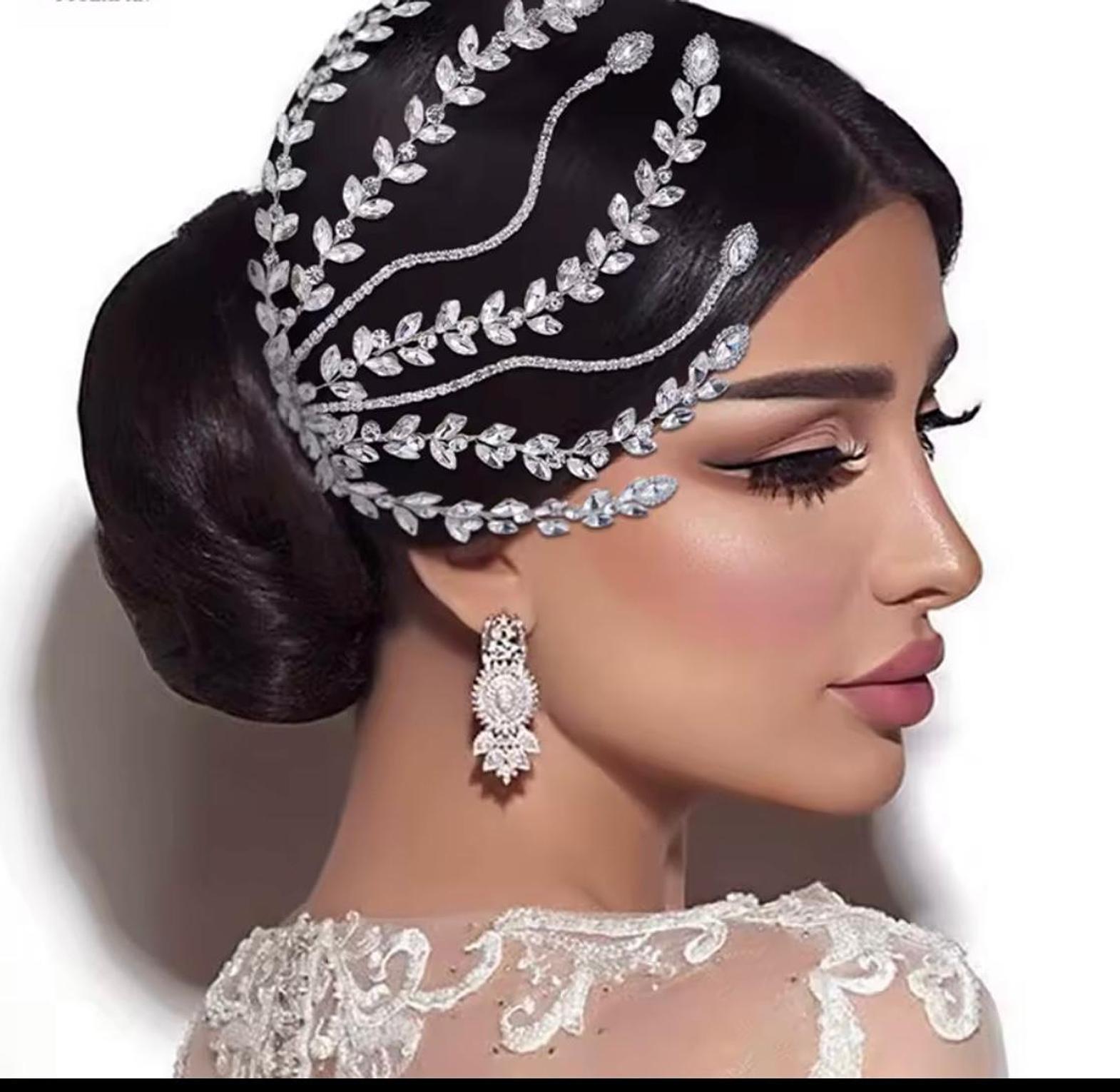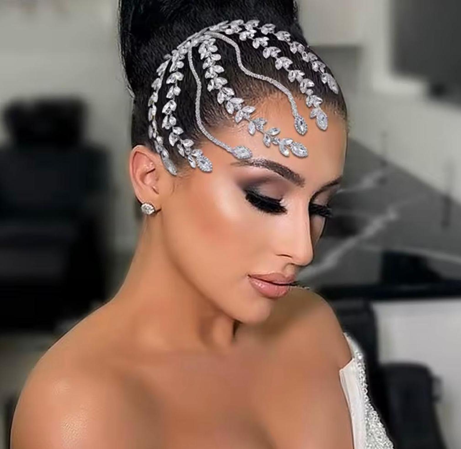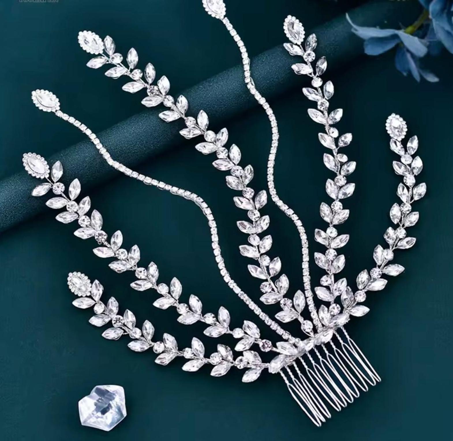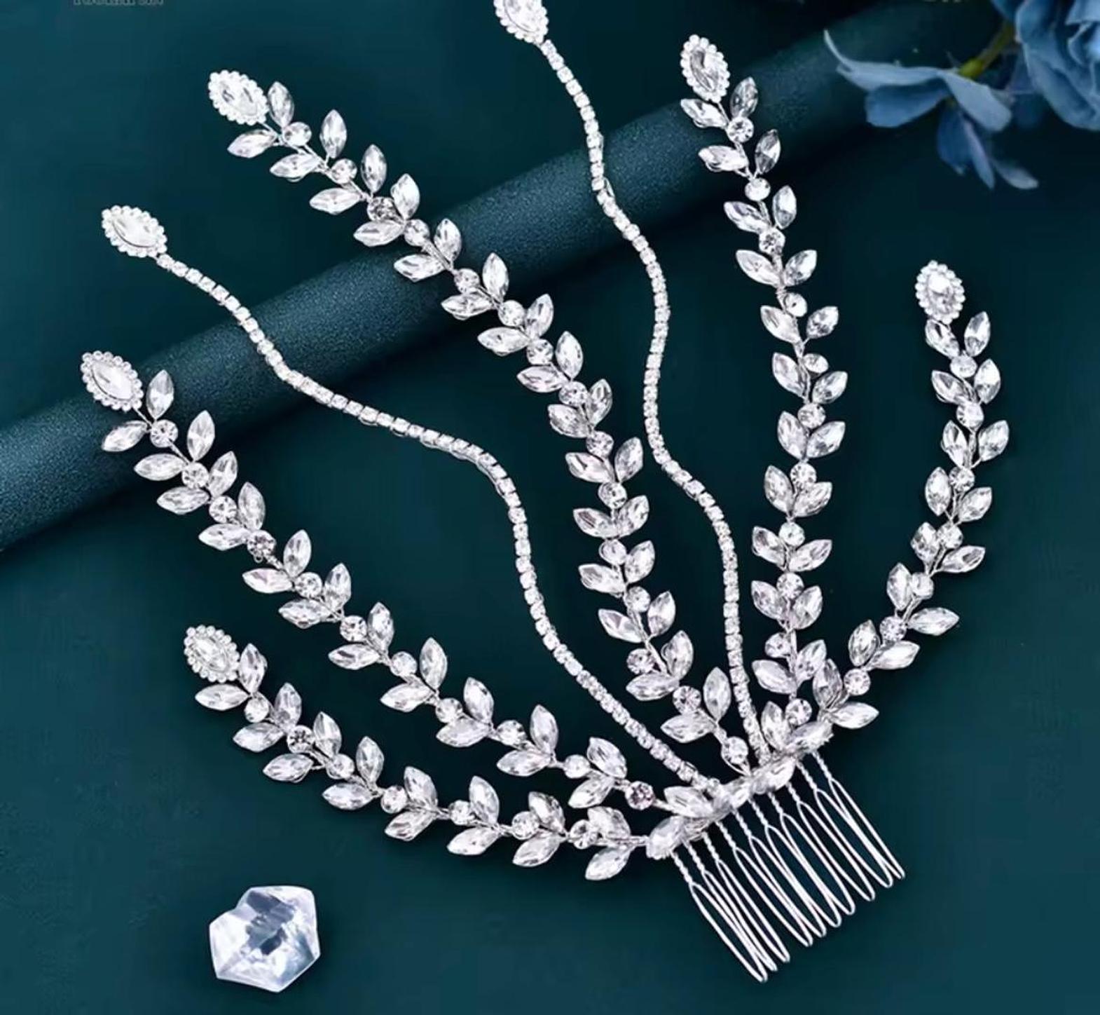 This magnificent bridal hair vine features five cascading, flexible strands beautifully crafted from leafs of brilliant marquise-cut crystals. The central comb design creates a stunning, fan-like silhouette, finished in a luminous white colour setting.