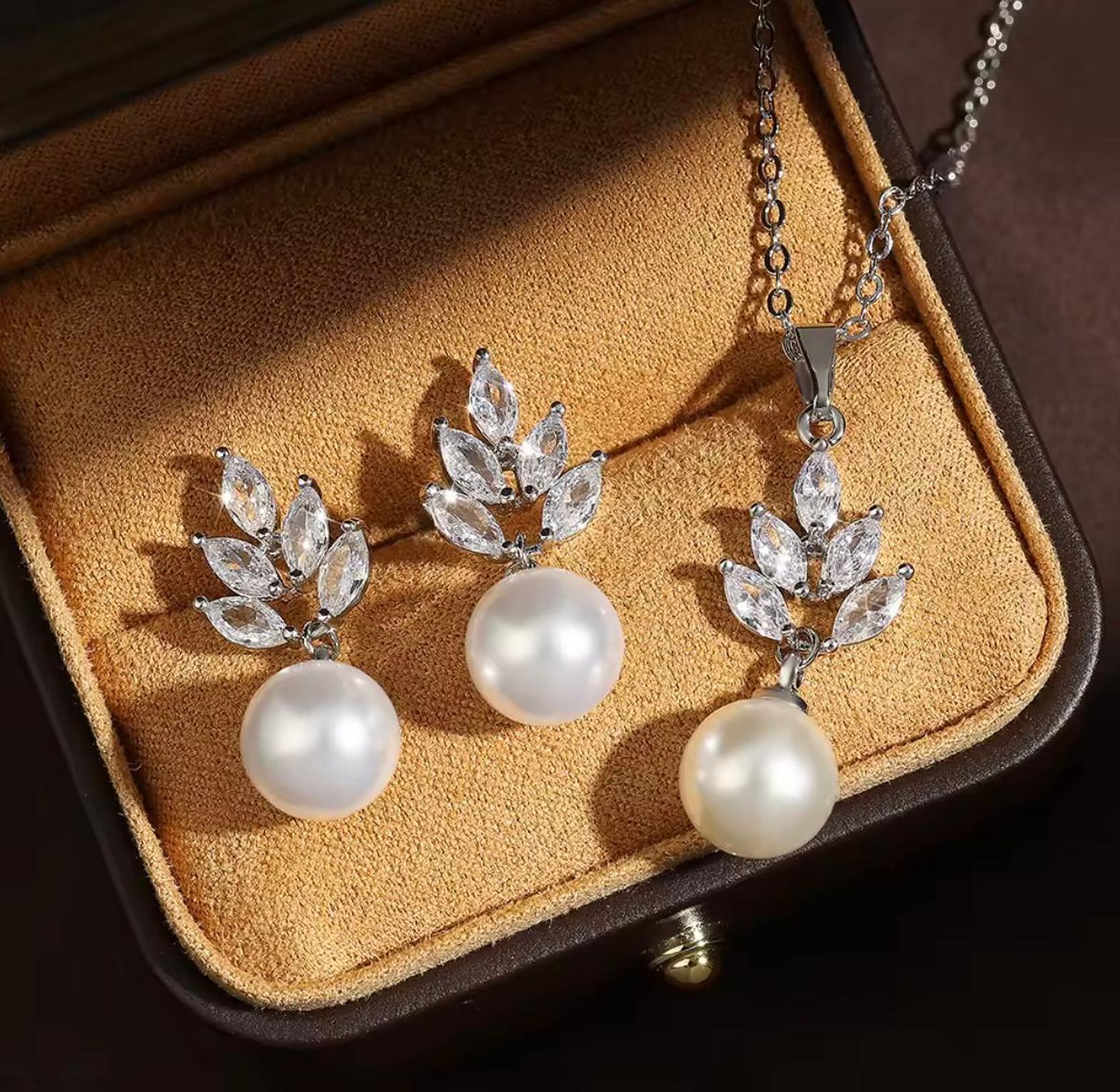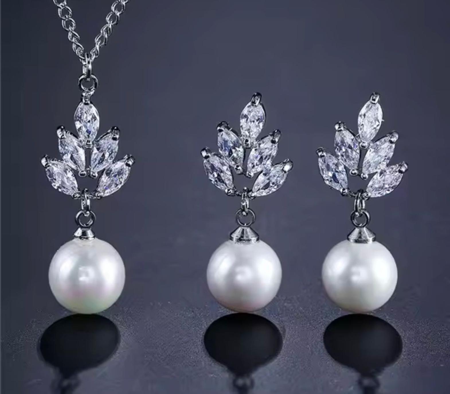 This breathtaking set features a cluster of marquise-cut stones shaped like delicate leaves, gracefully suspending a lustrous simulated pearl. It is a harmonious blend of natural beauty and refined glamour, available in stunning gold or elegant white-colored metal finishes.