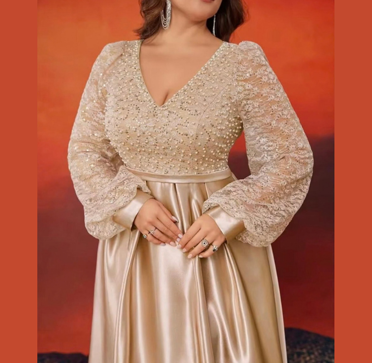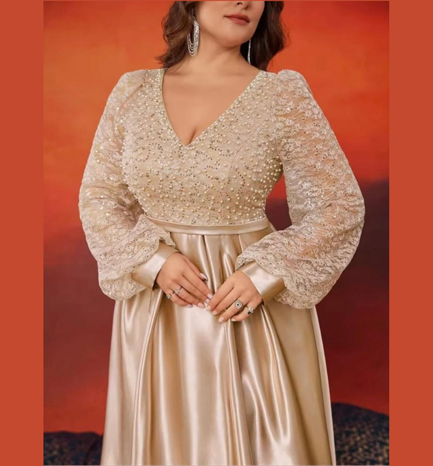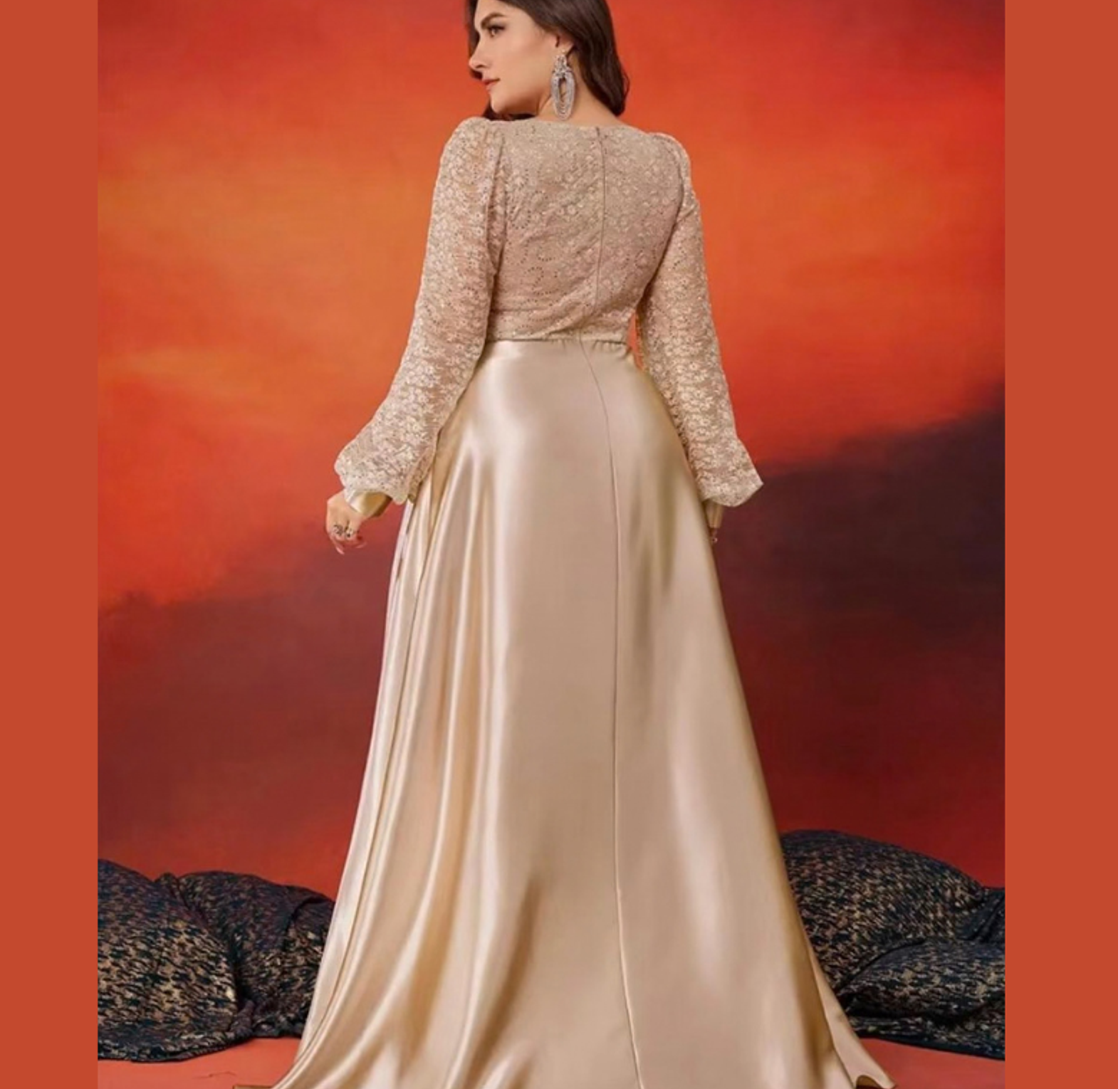 Styling Suggestion: Let the bodice be the star by pairing this gown with simple diamond drop earrings and a metallic gold clutch. Style your hair in soft, side-swept waves to complement the romantic aesthetic of the lace sleeves.