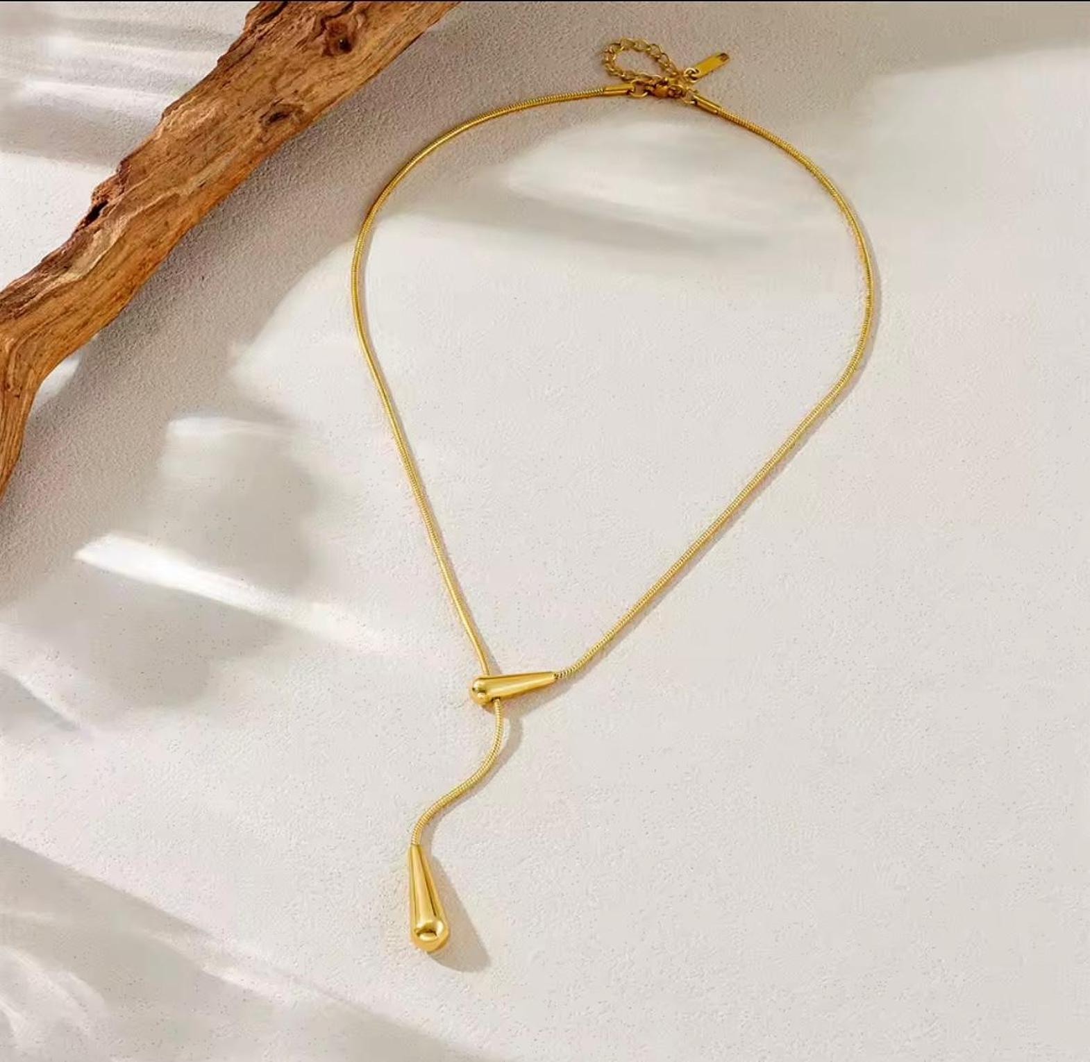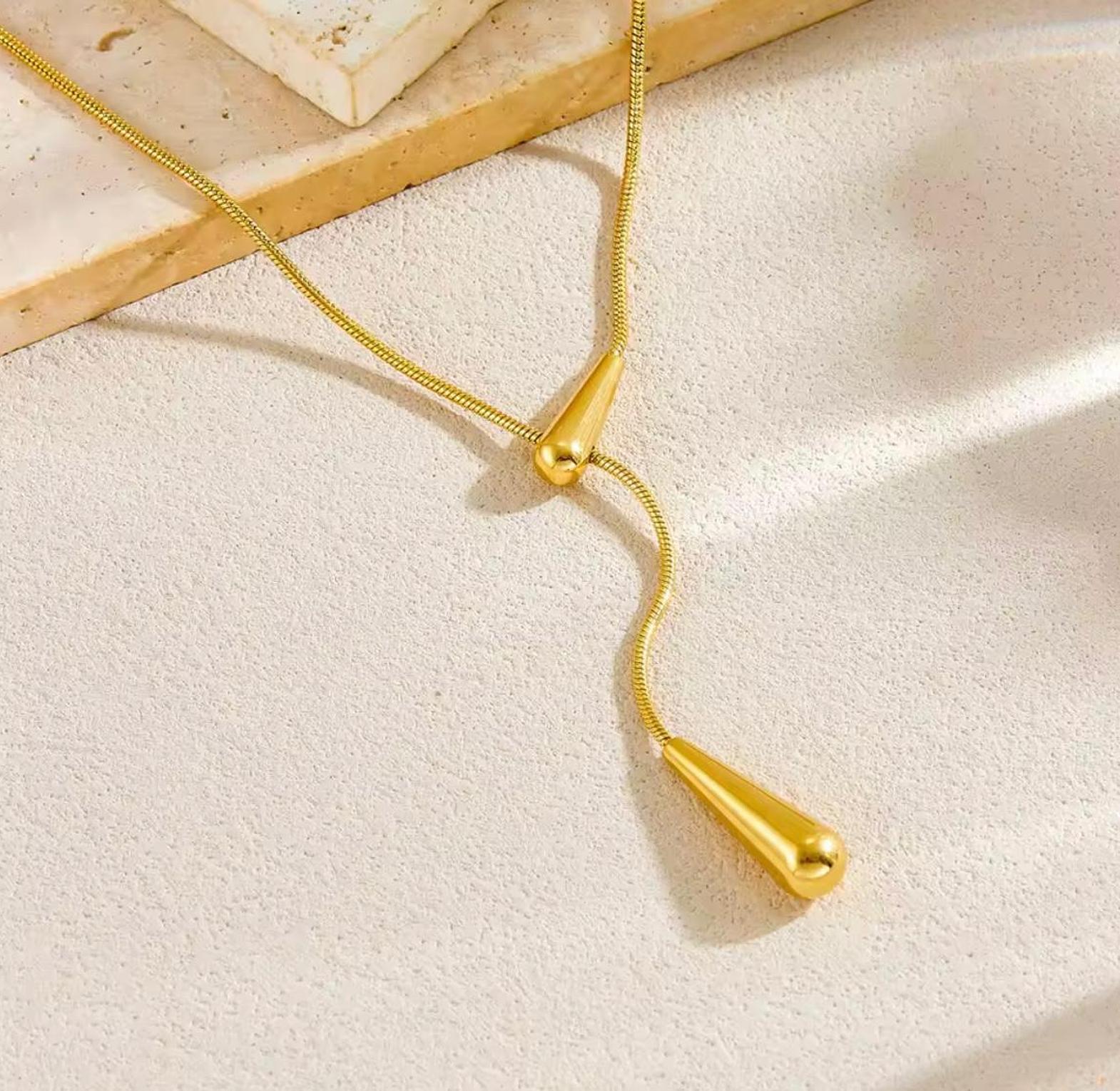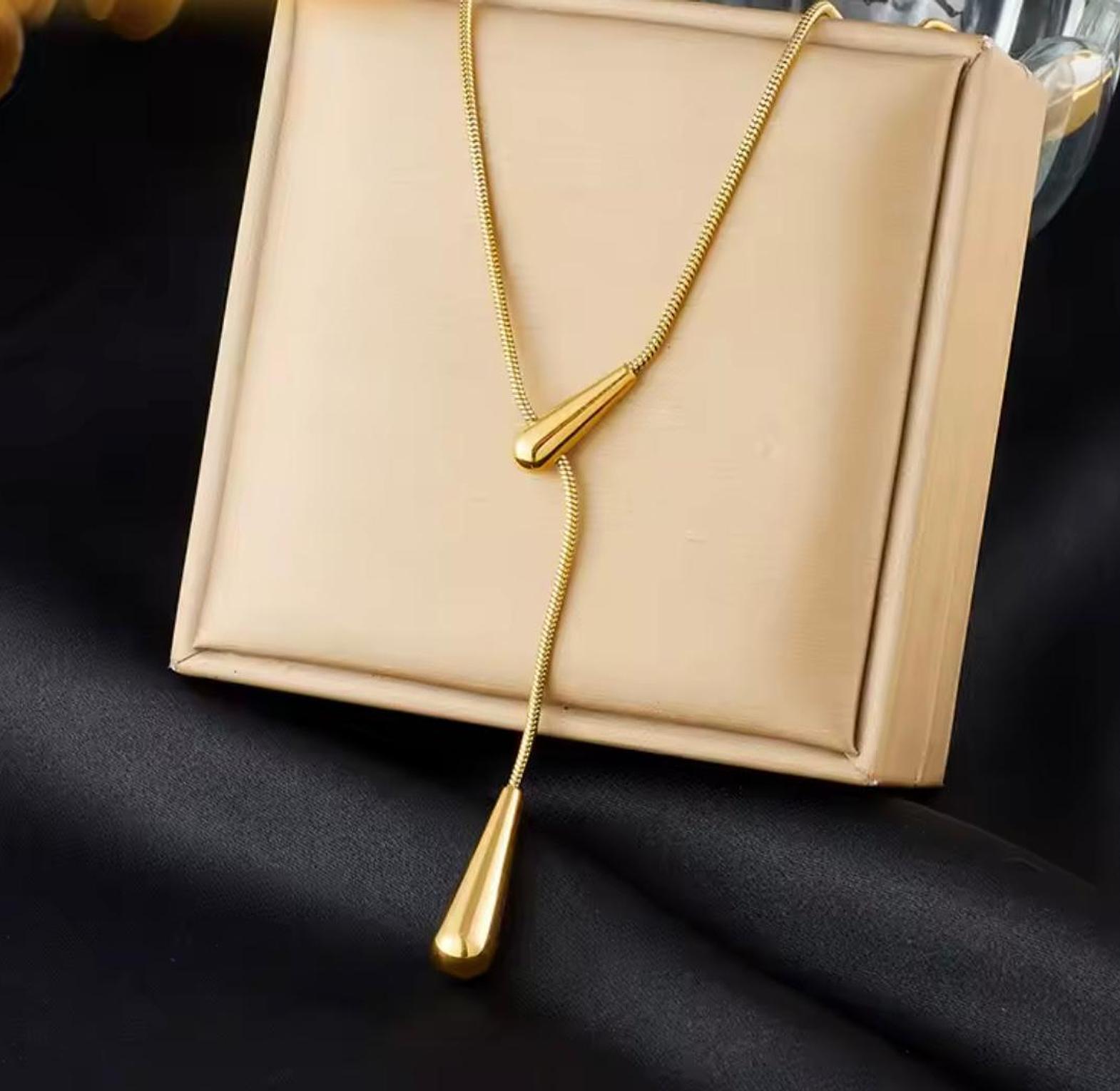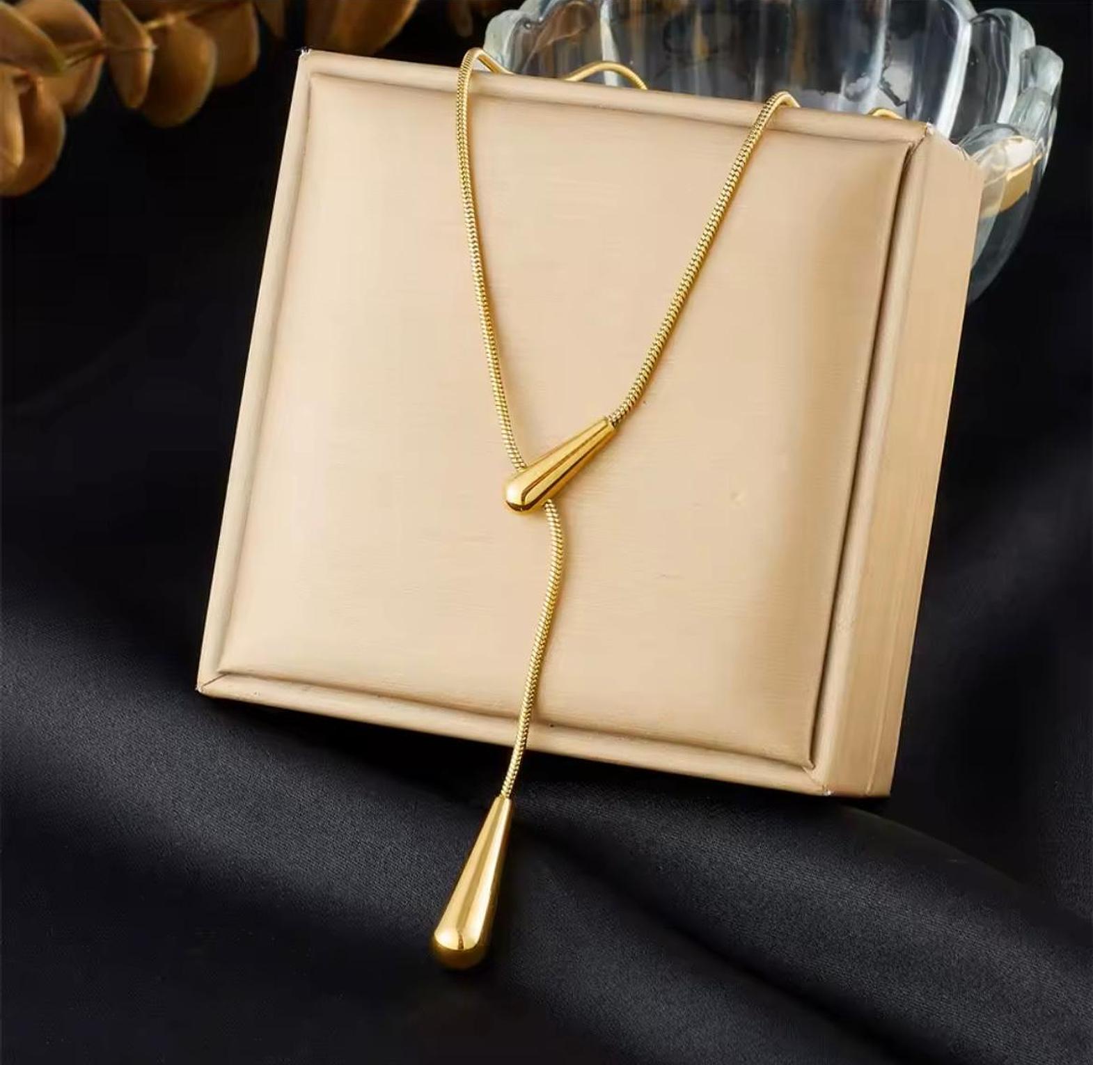 Elevate your silhouette with the fluid elegance of this golden lariat, featuring sculptural droplets that dance with every movement. A captivating statement of modern luxury designed for the woman who appreciates refined, effortless style.
