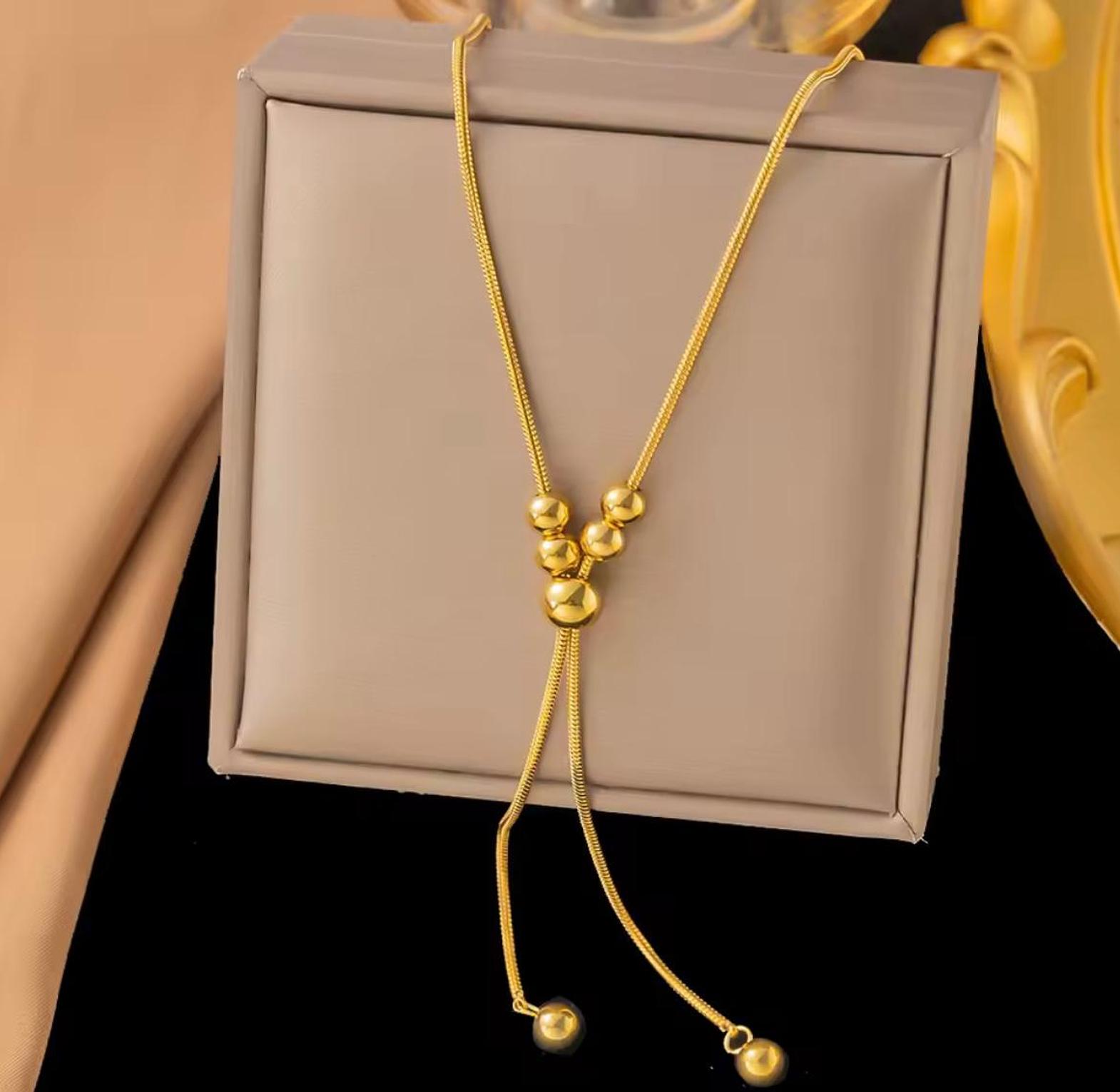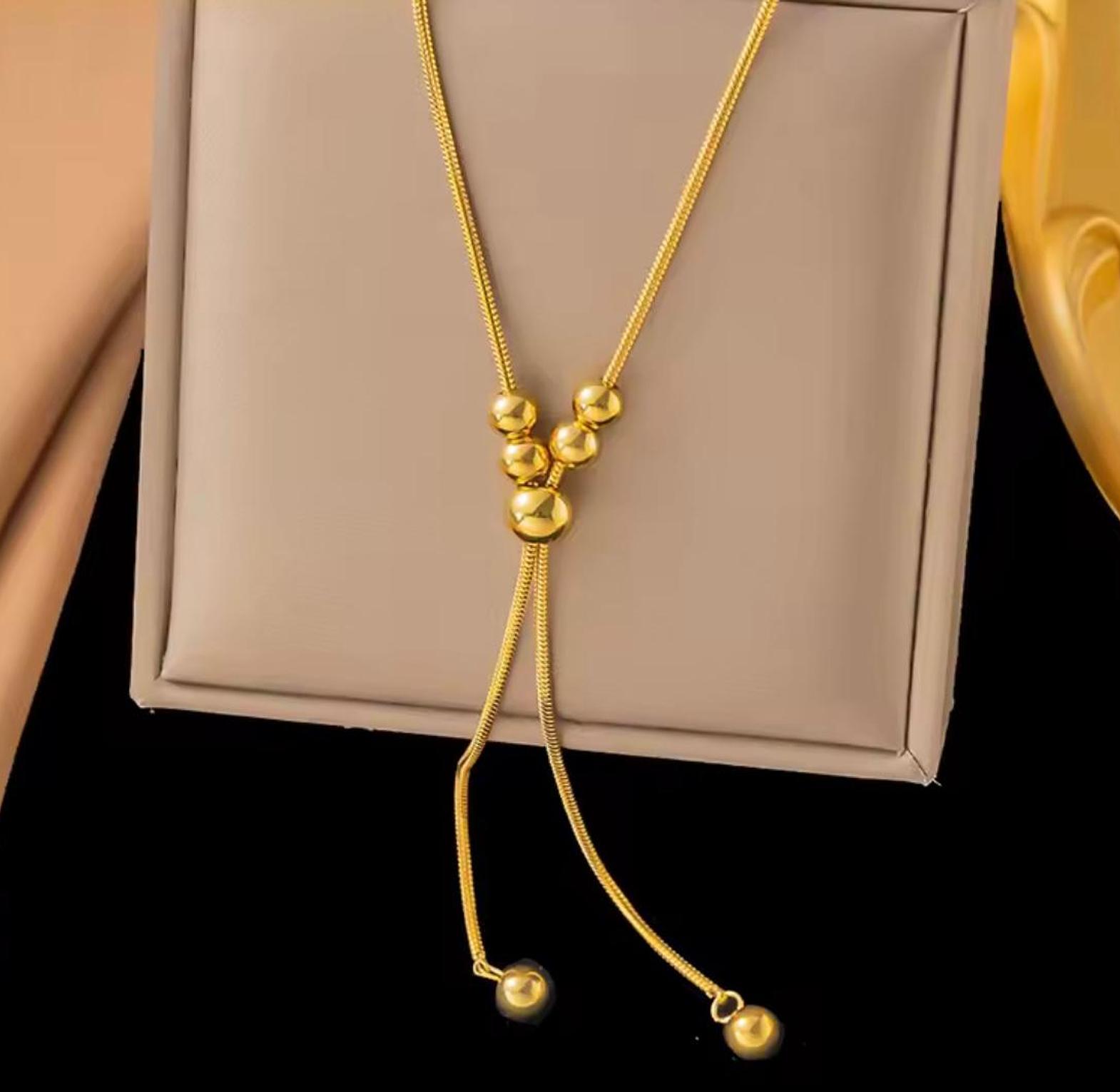 Redefine your silhouette with this stunning golden lariat, where fluid movement meets architectural brilliance. A captivating statement piece designed to trail elegantly and capture every eye in the room.