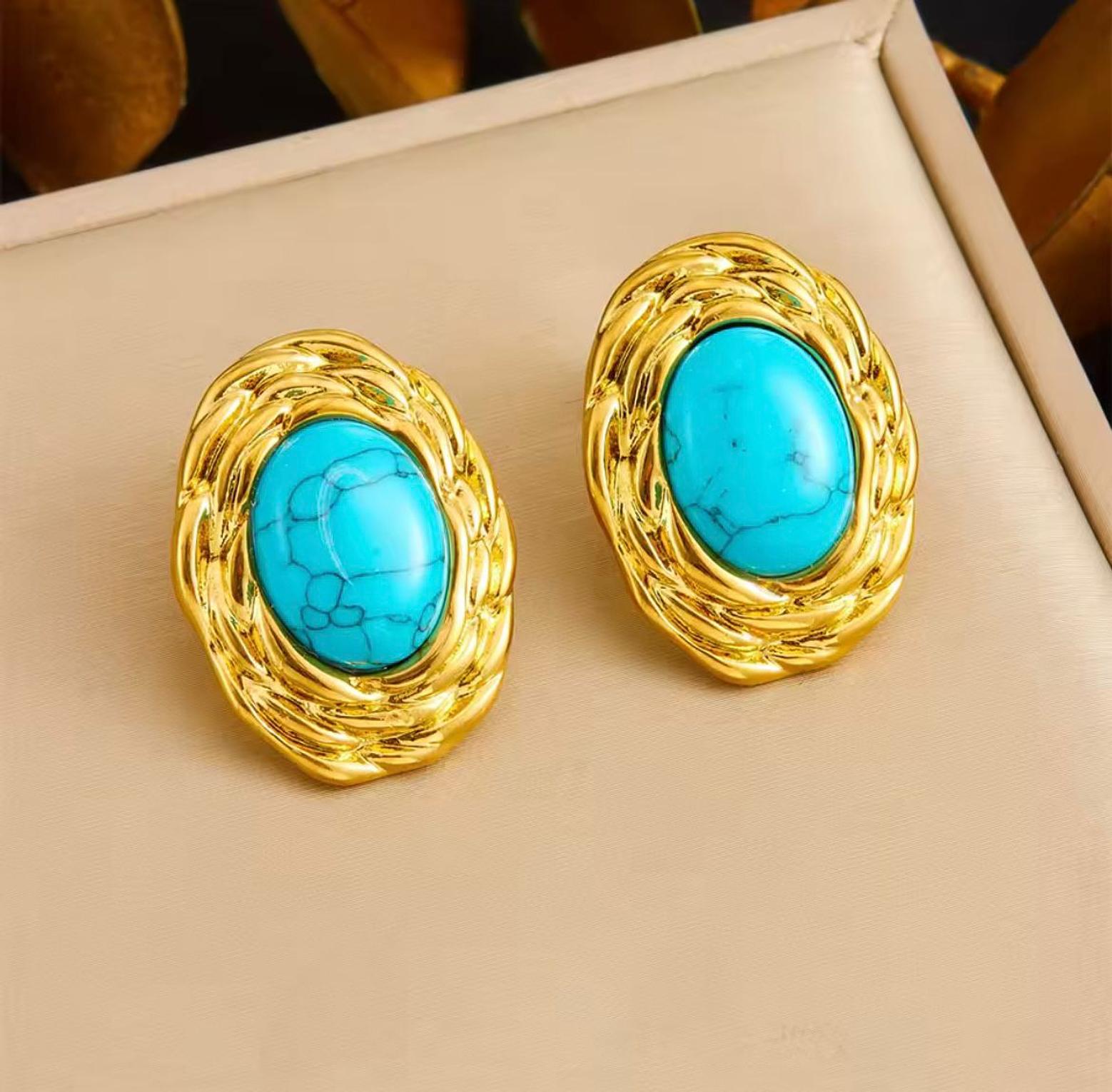 Embrace a look of timeless coastal elegance with this beautifully crafted three-piece set, featuring a matching pendant necklace, stud earrings, and an adjustable statement ring. At the heart of each piece lies a vivid, oval-cut turquoise stone, celebrated for its unique marbled veining and serene blue hue. Each stone is nestled within an intricately textured, swirling gold border that mimics the organic patterns of woven silk, creating a stunning contrast between the earthy gemstone and the radiant metallic finish.