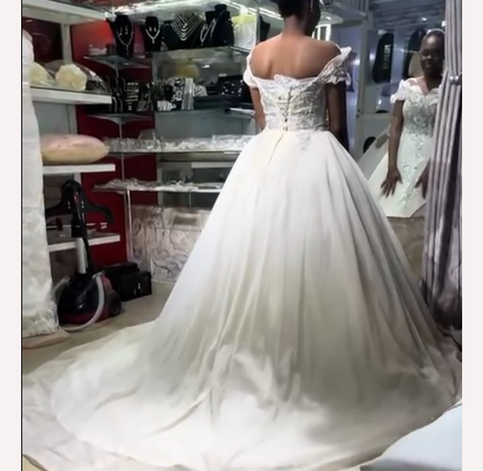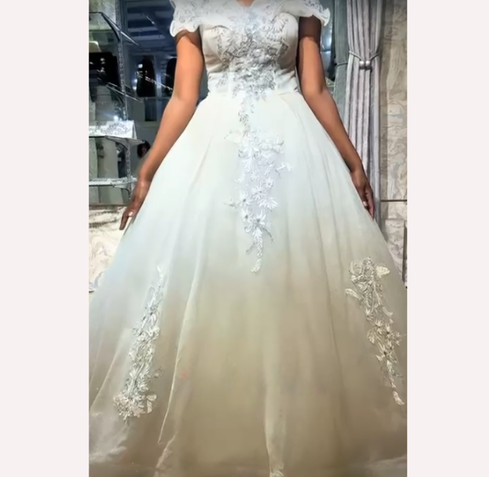 Embrace unparalleled romance in this stunning white gown, featuring a classic off-shoulder neckline and intricate silver-and-white floral embroidery cascading down the bodice and skirt. It's a timeless piece designed for the bride who desires both glamour and delicate artistry.