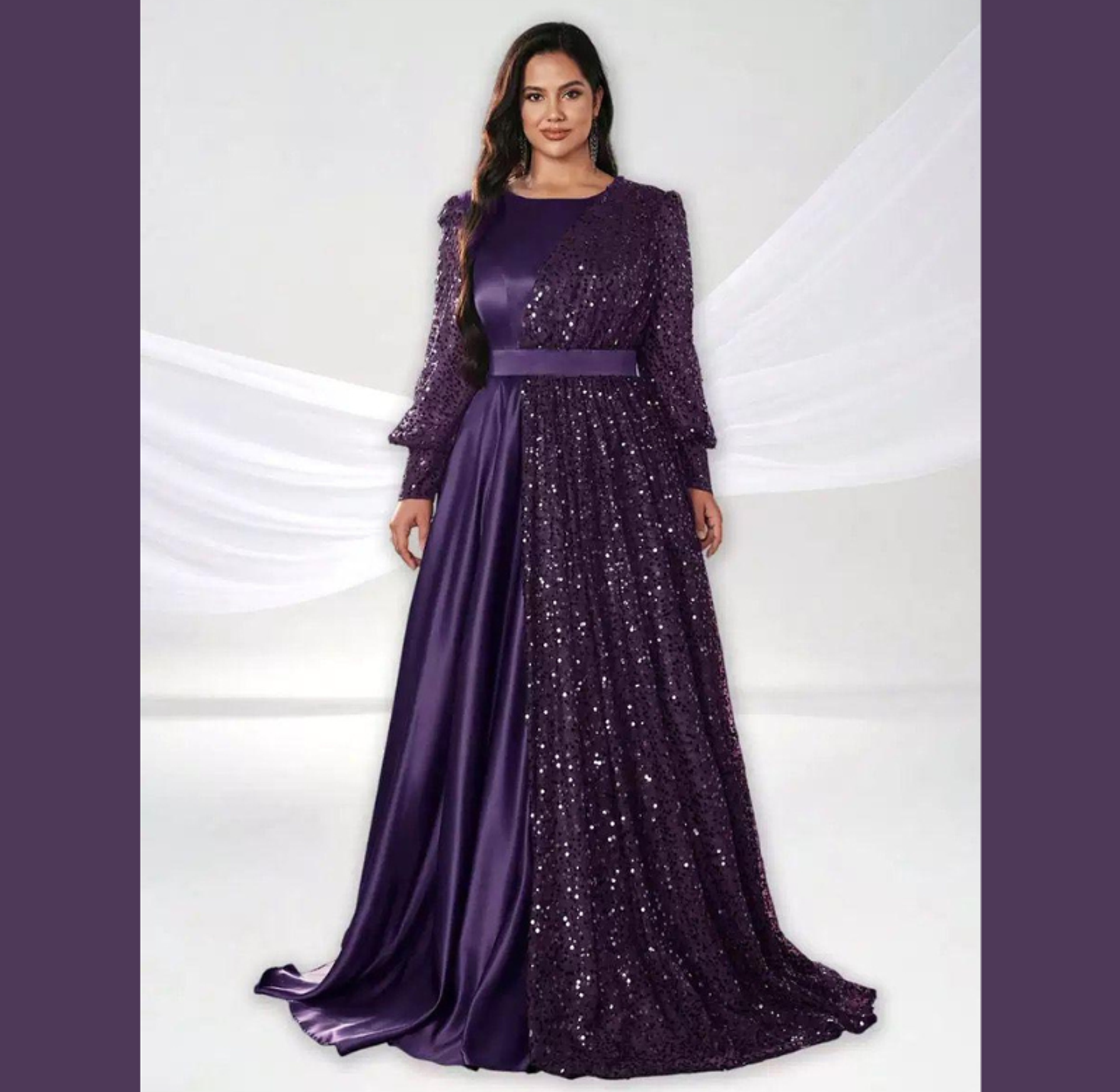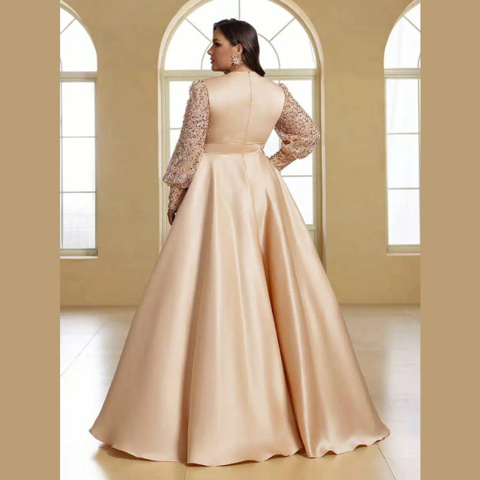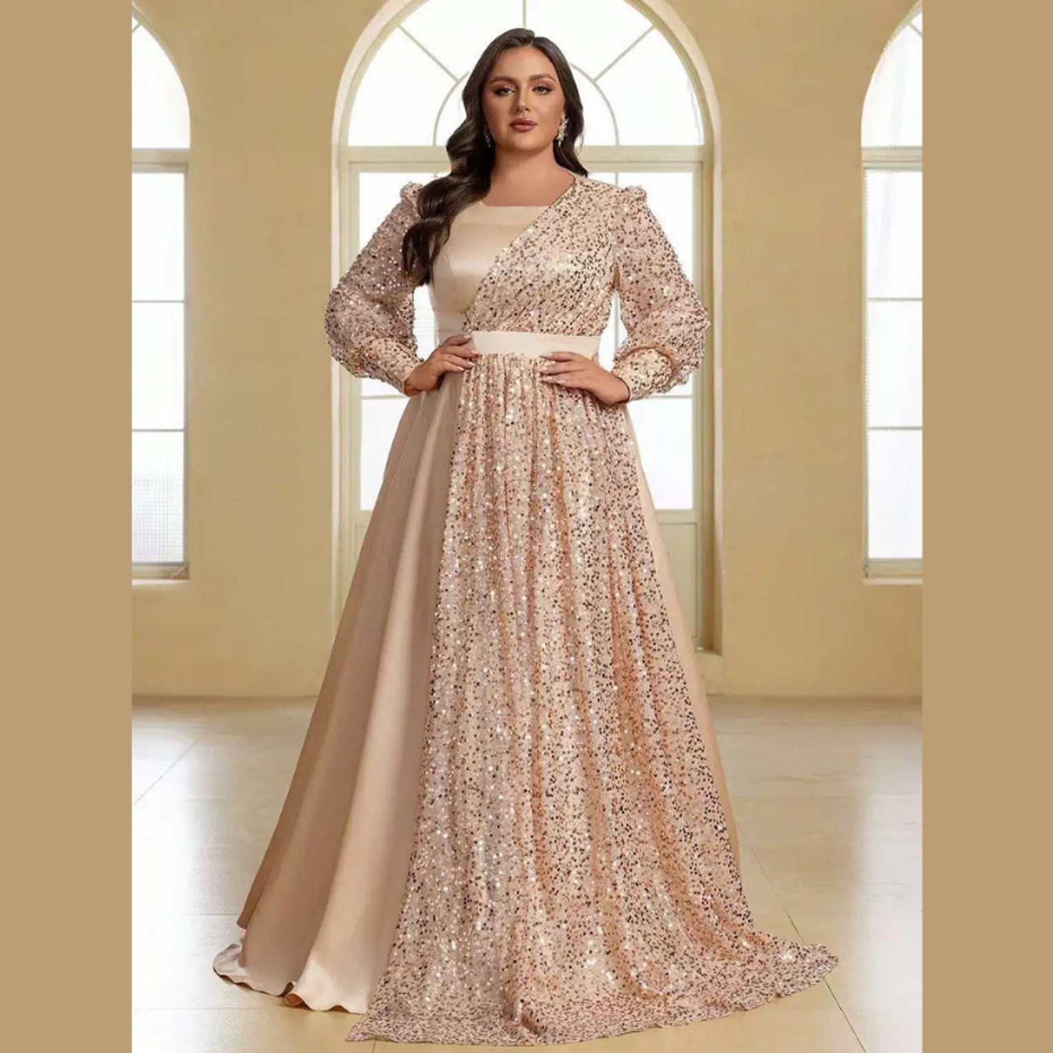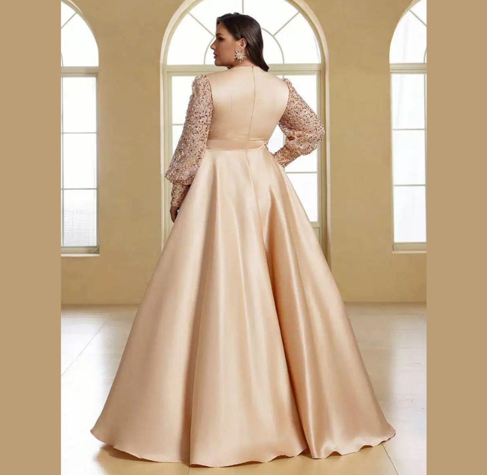 This majestic A-line gown, in a warm champagne hue, features a high neckline, a smooth satin skirt, and dramatic sheer sleeves fully embellished with shimmering baroque-style sequins. It offers a sophisticated, regal silhouette with a touch of glamorous texture.