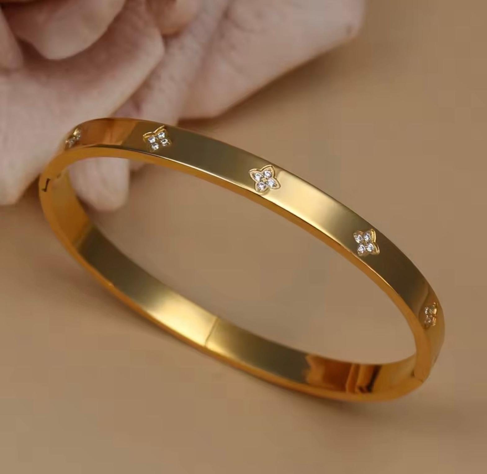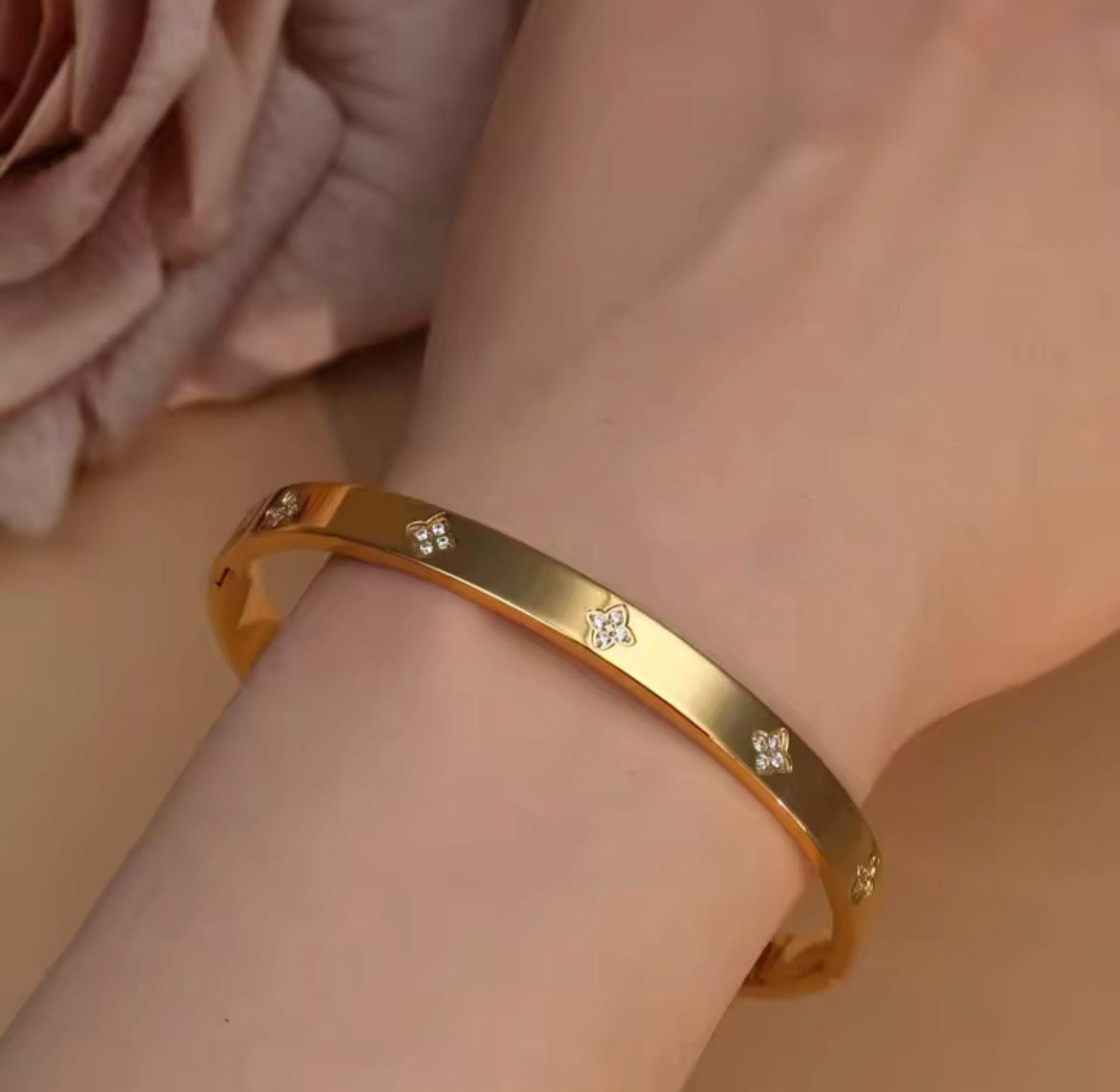 This gorgeous bracelet features a high-quality gold finish and is adorned with delicate, sparkling clover-shaped pave clusters. The sleek band and charming pattern offer a refined elegance perfect for both casual and formal settings.