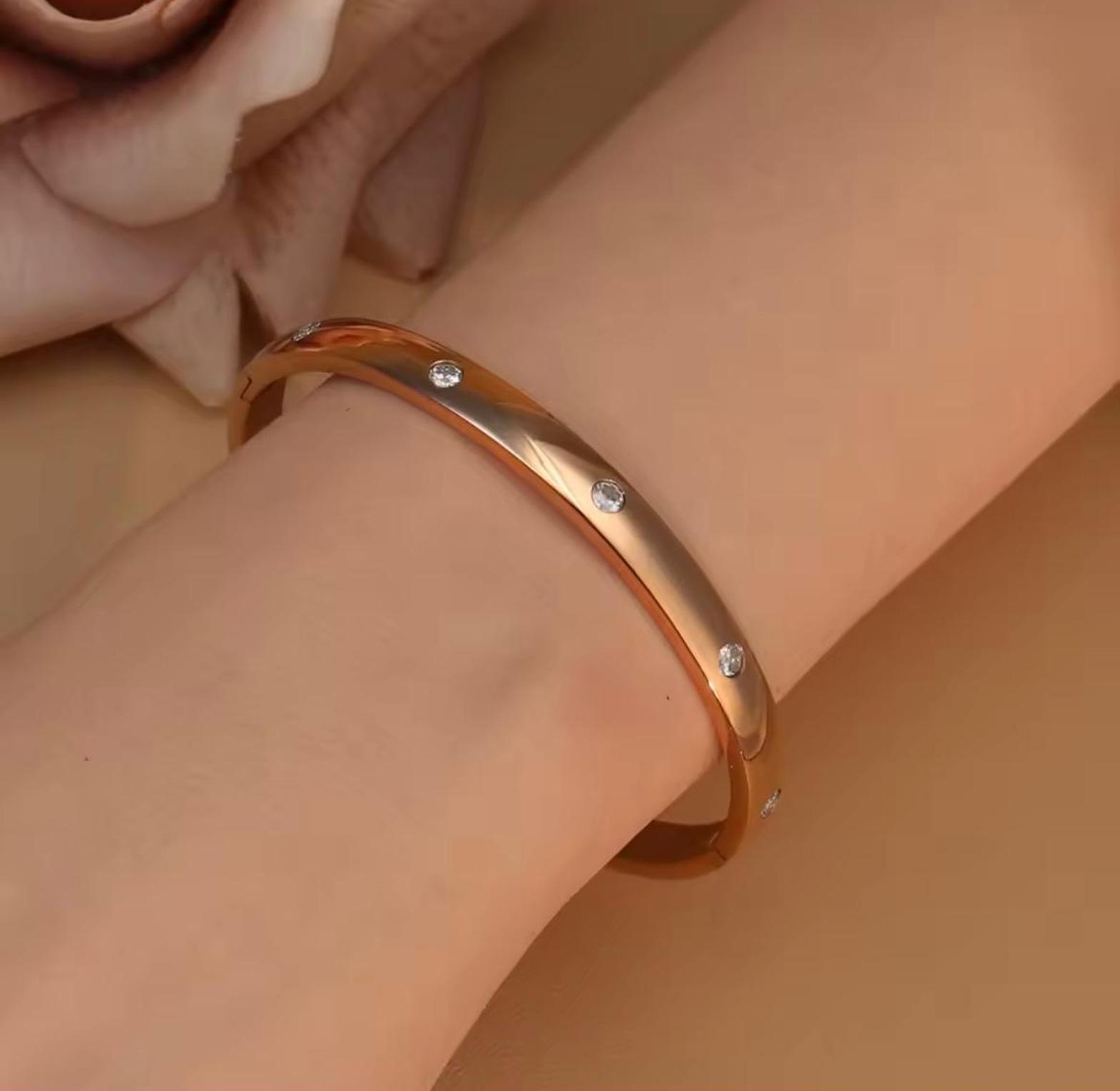 This sleek, rose gold-plated bangle features a delicate scattering of bezel-set cubic zirconia for a subtle, stellar shimmer. Crafted from hypoallergenic materials, this comfortable accessory is perfect for everyday wear, adding a warm, gentle glow to any look.
