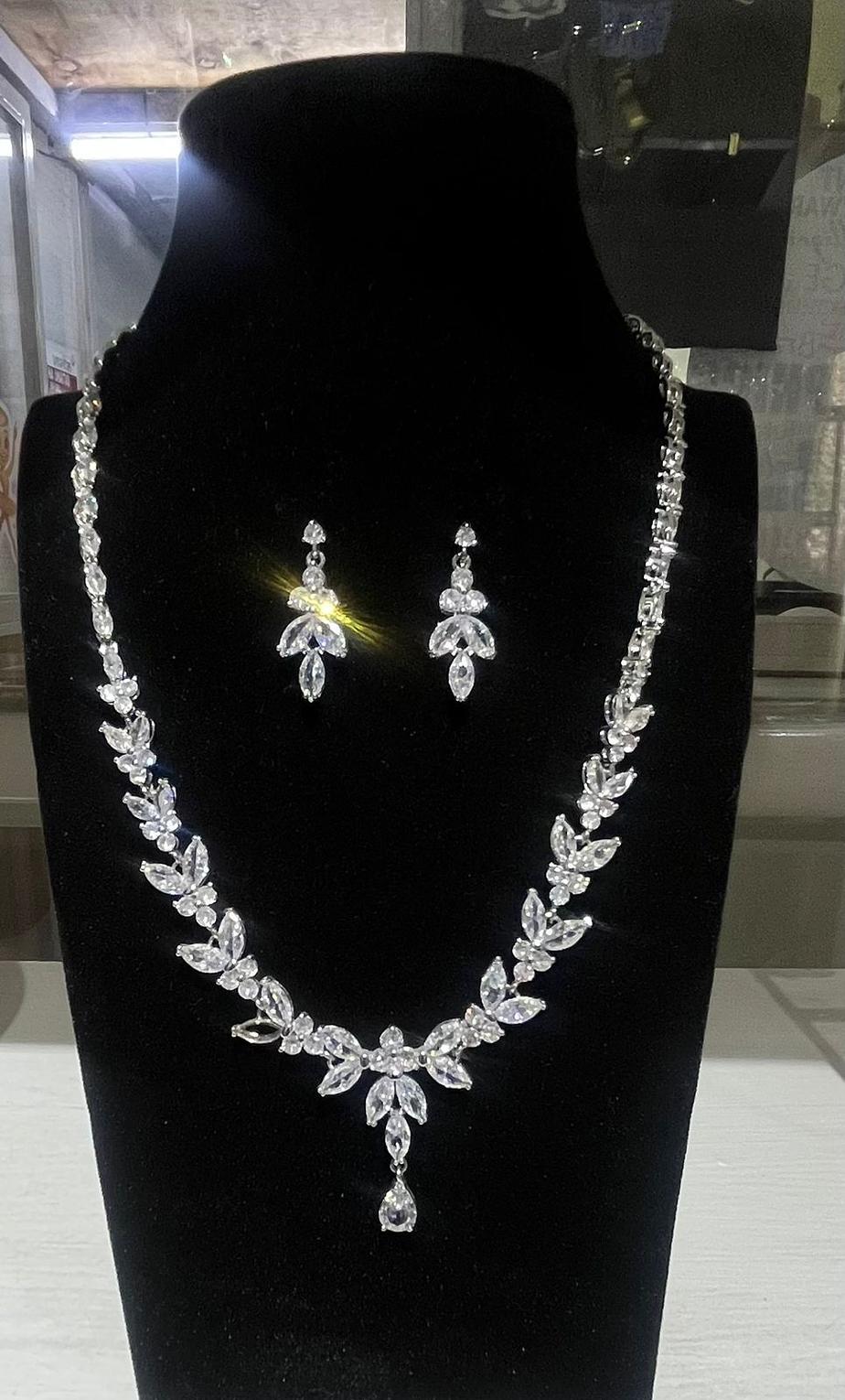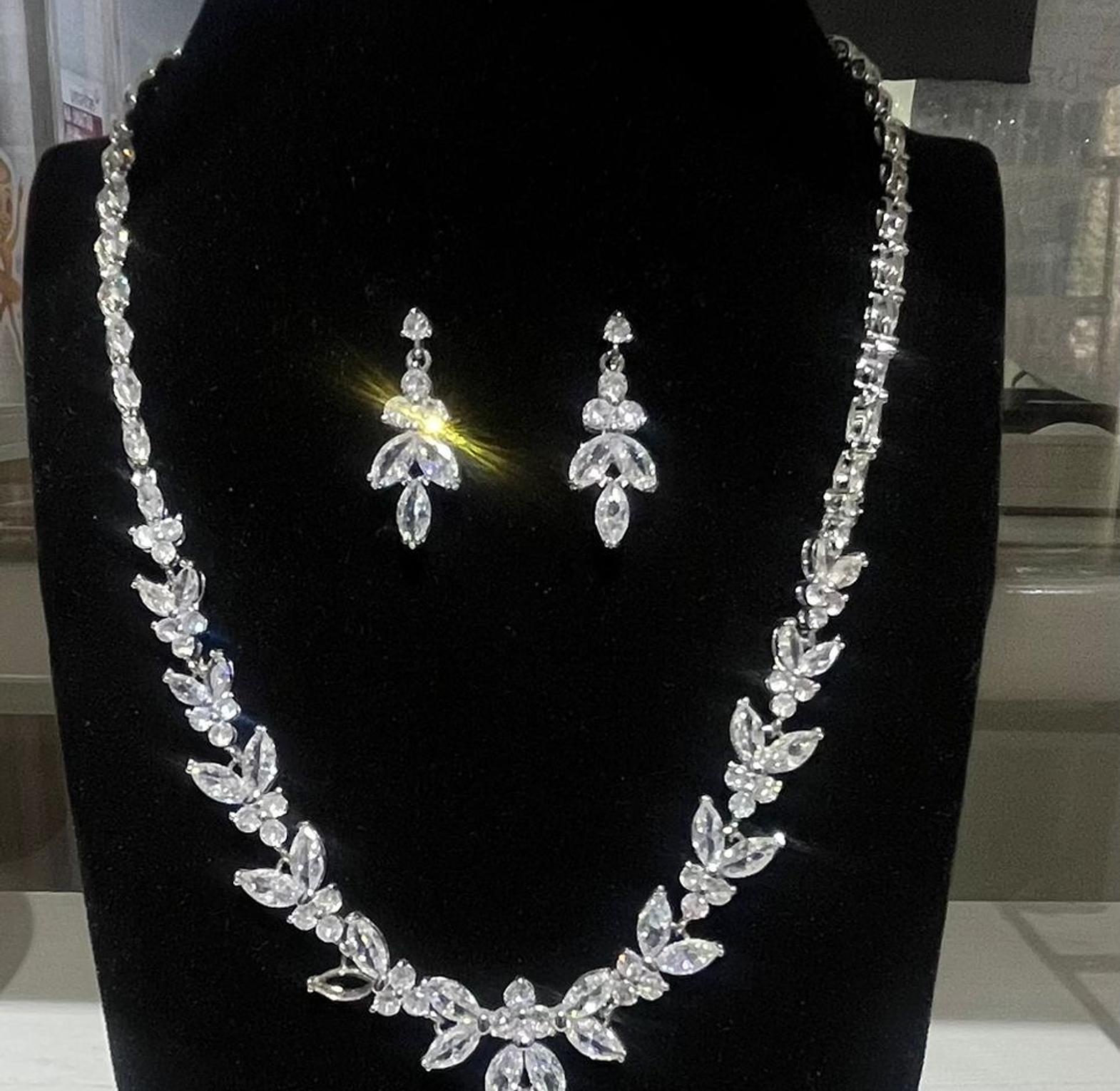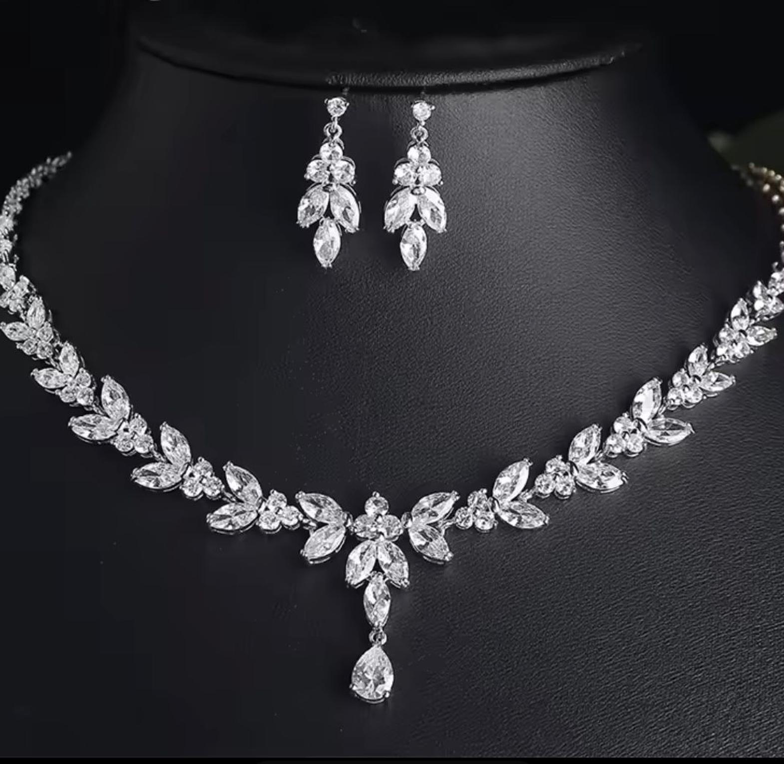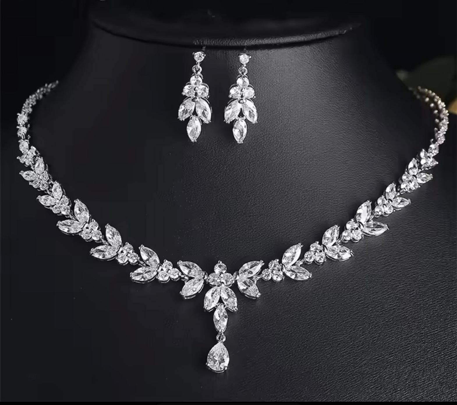 This exquisite, hypoallergic set features a delicate garland of brilliant marquise-cut cubic zirconia stones that elegantly frame the neckline and matching chandelier earrings. The intricate, leaf-like design delivers a truly romantic, high-wattage sparkle.