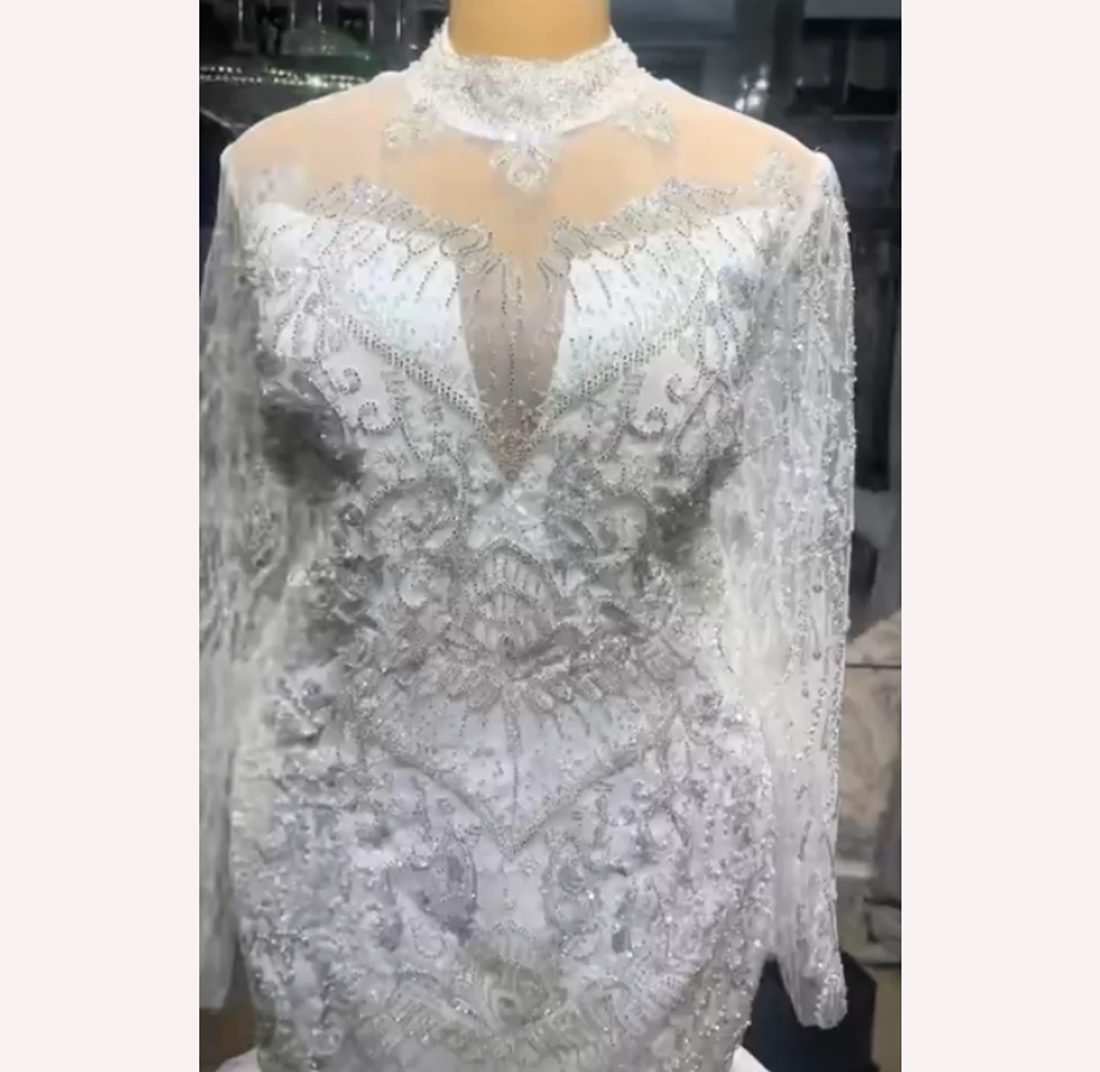 Prepare to dazzle in this spectacular white wedding gown, intricately embellished with thousands of sparkling crystals and beads across a sophisticated illusion neckline and long sleeves. It's designed to make you radiate pure glamour and sophistication.