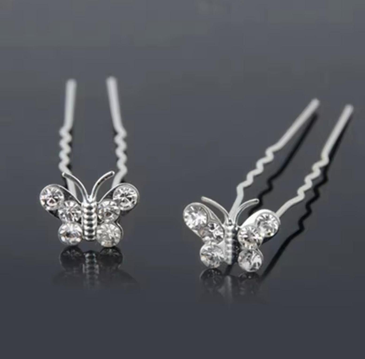 These captivating U-pins feature a gracefully detailed butterfly silhouette encrusted with brilliant, clear crystals for exceptional sparkle. They bring a touch of whimsical elegance and shimmering nature-inspired design to any hairdo. 2 pins for 100