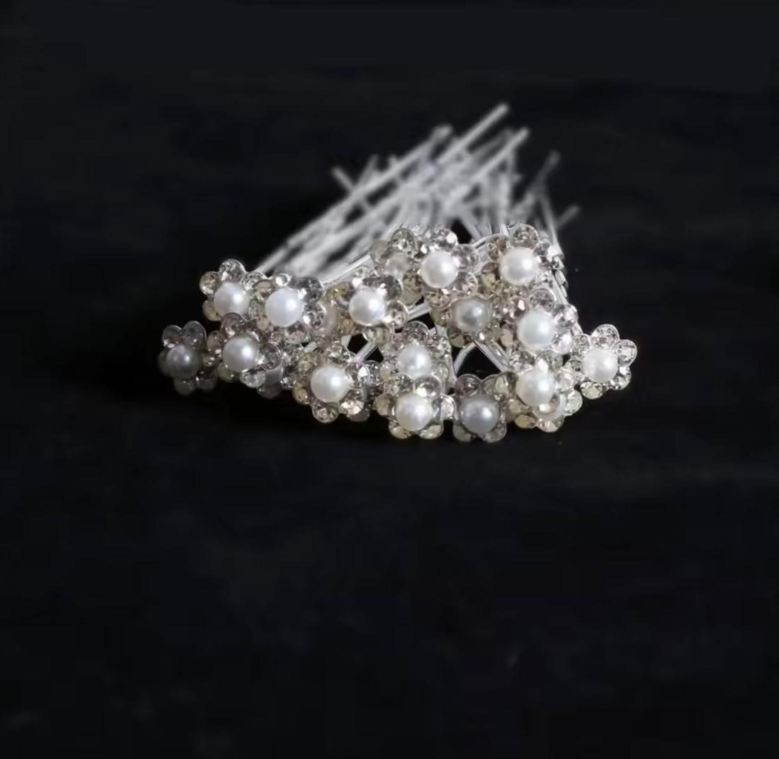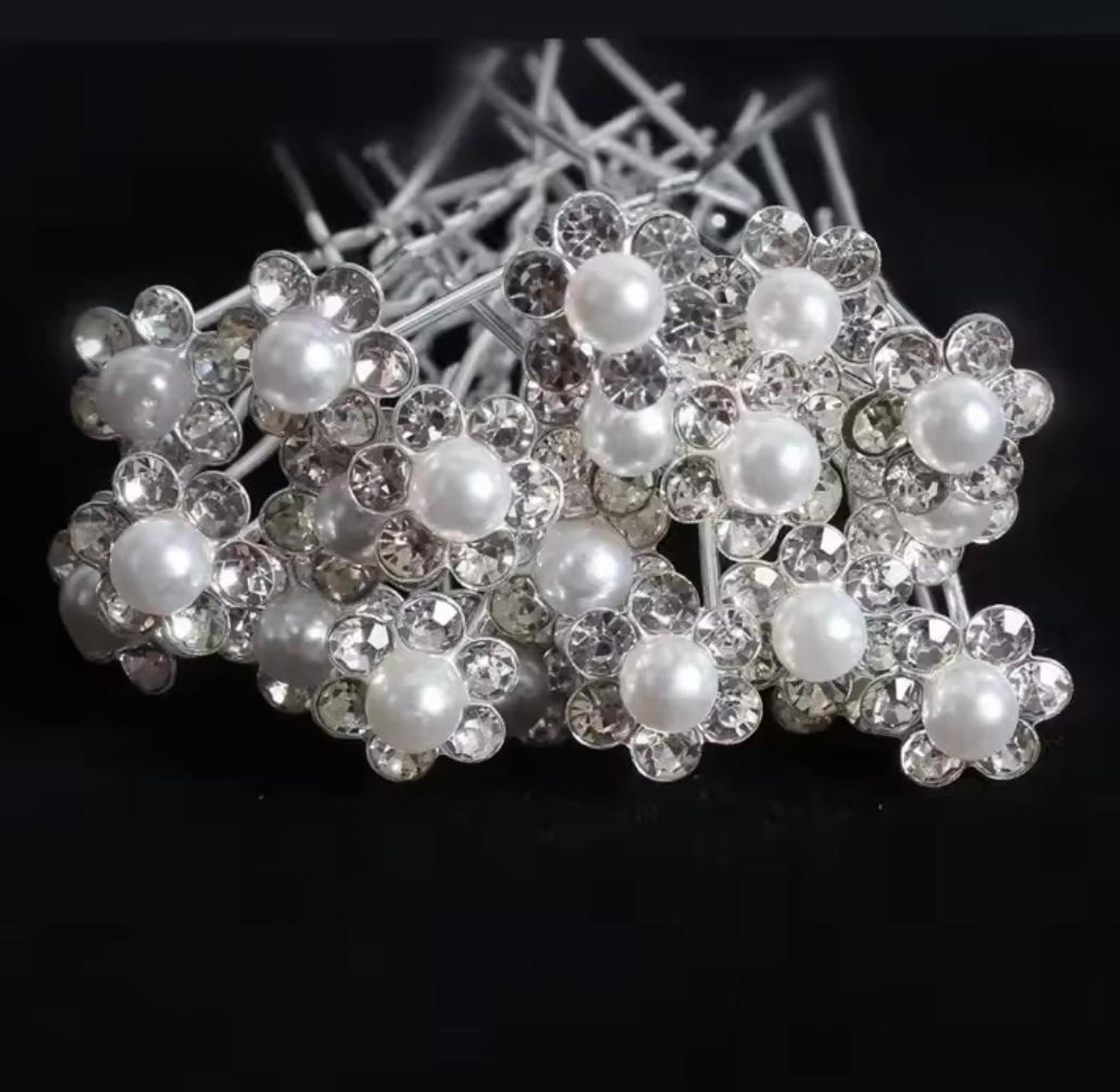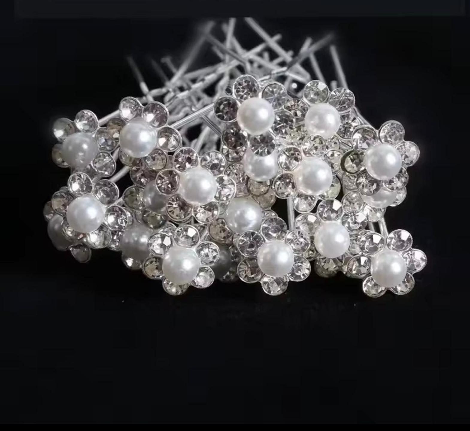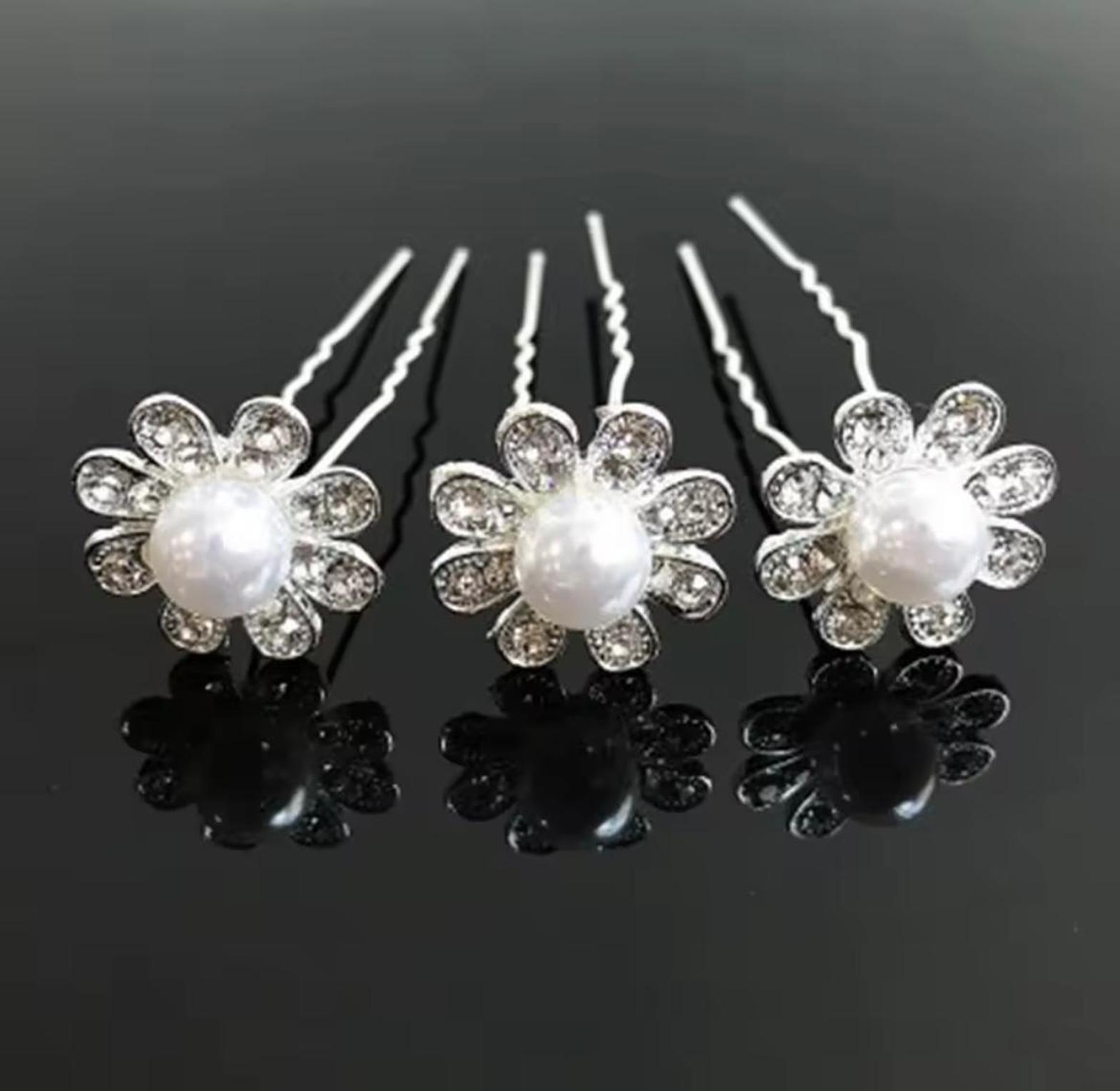 These delicate hair accents feature a luminous central pearl nestled within a sparkling halo of clear-cut crystals, crafted into a charming floral design. They instantly transform any simple hairstyle into an elegant, occasion-ready look. 3 pins for 100
