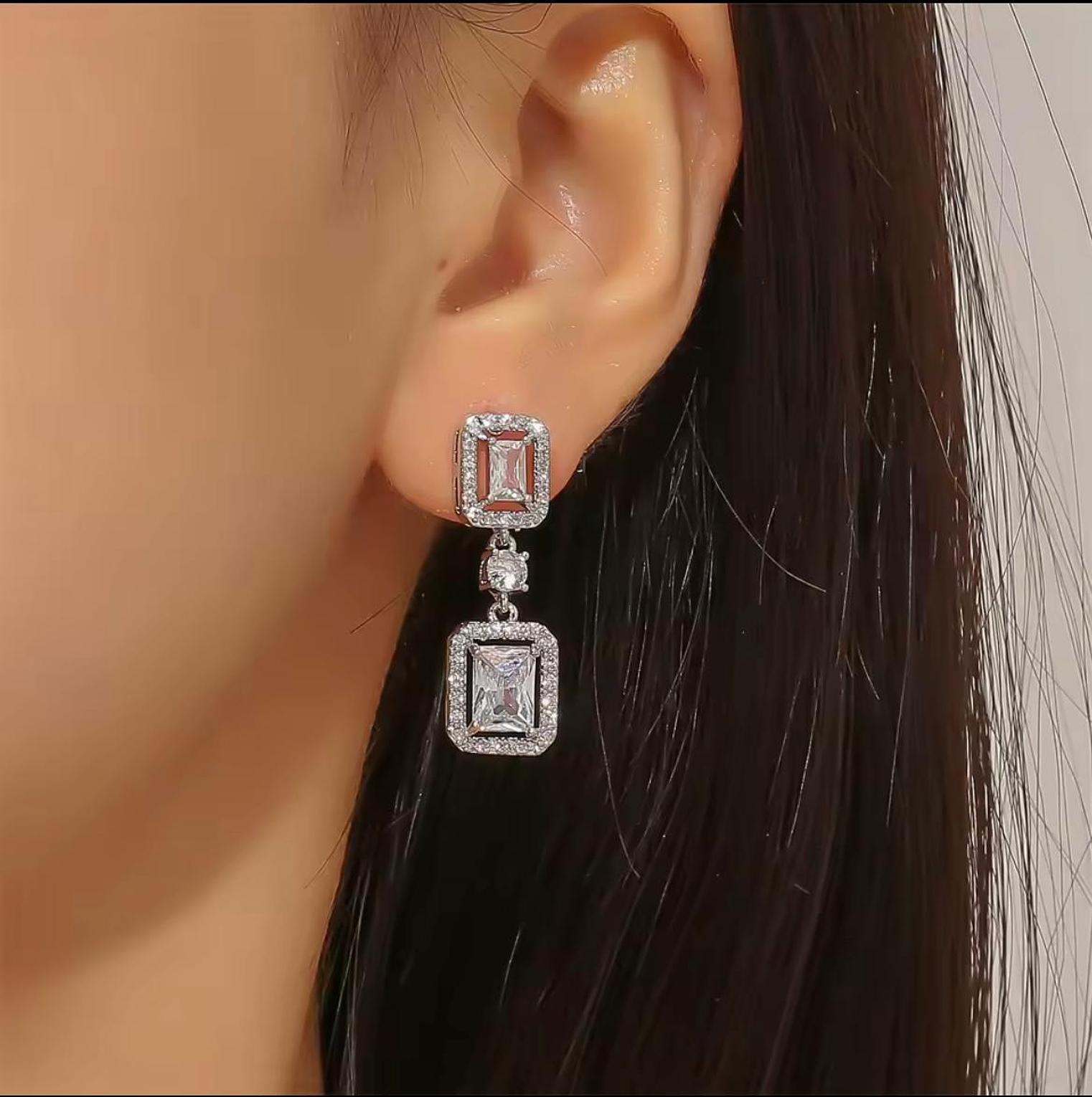 These glamorous drop earrings feature two stunning emerald-cut stones, each framed by a shimmering micro-pave halo for intense sparkle. The art deco-inspired geometric design offers dramatic elegance and structured brilliance.