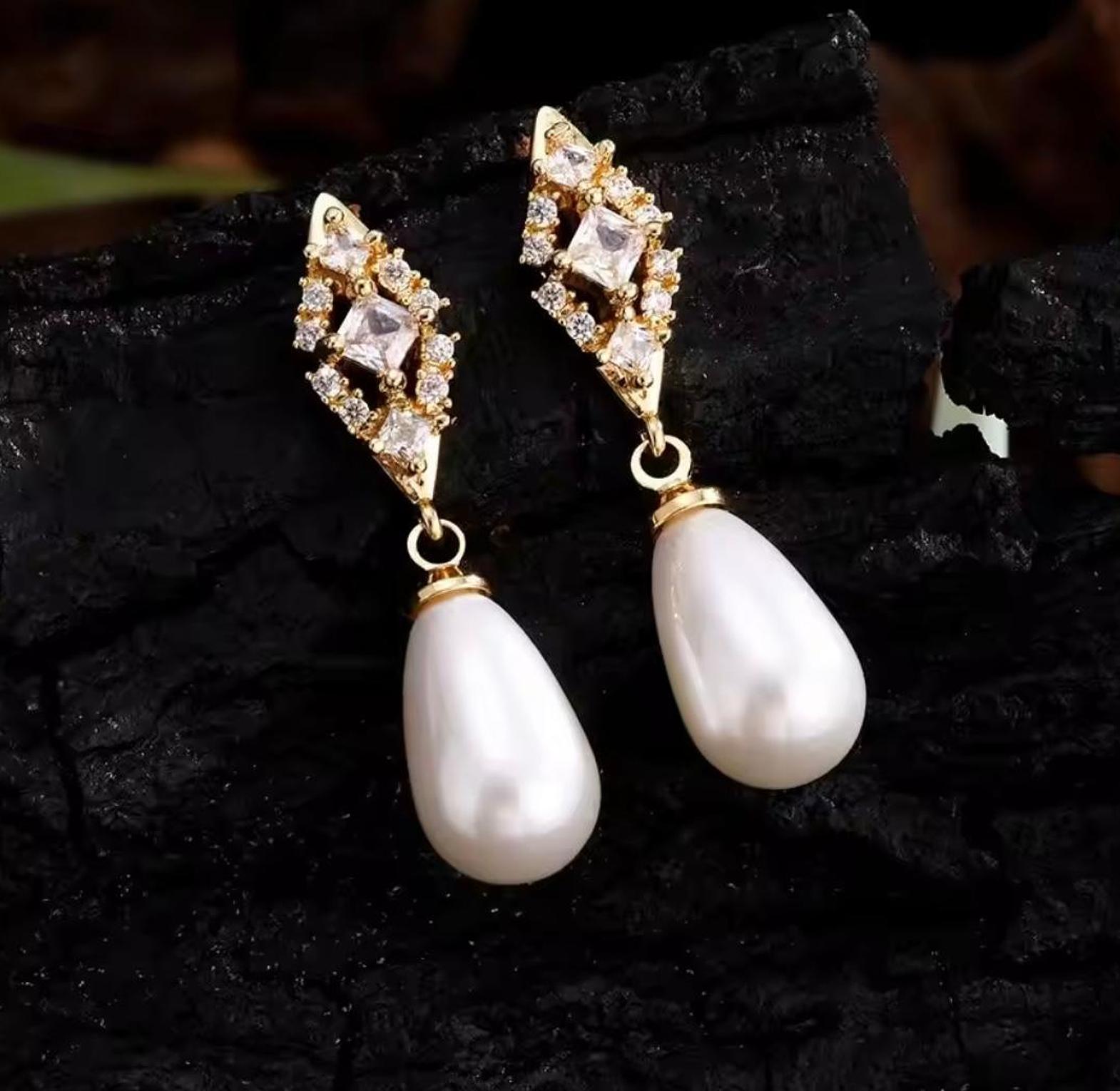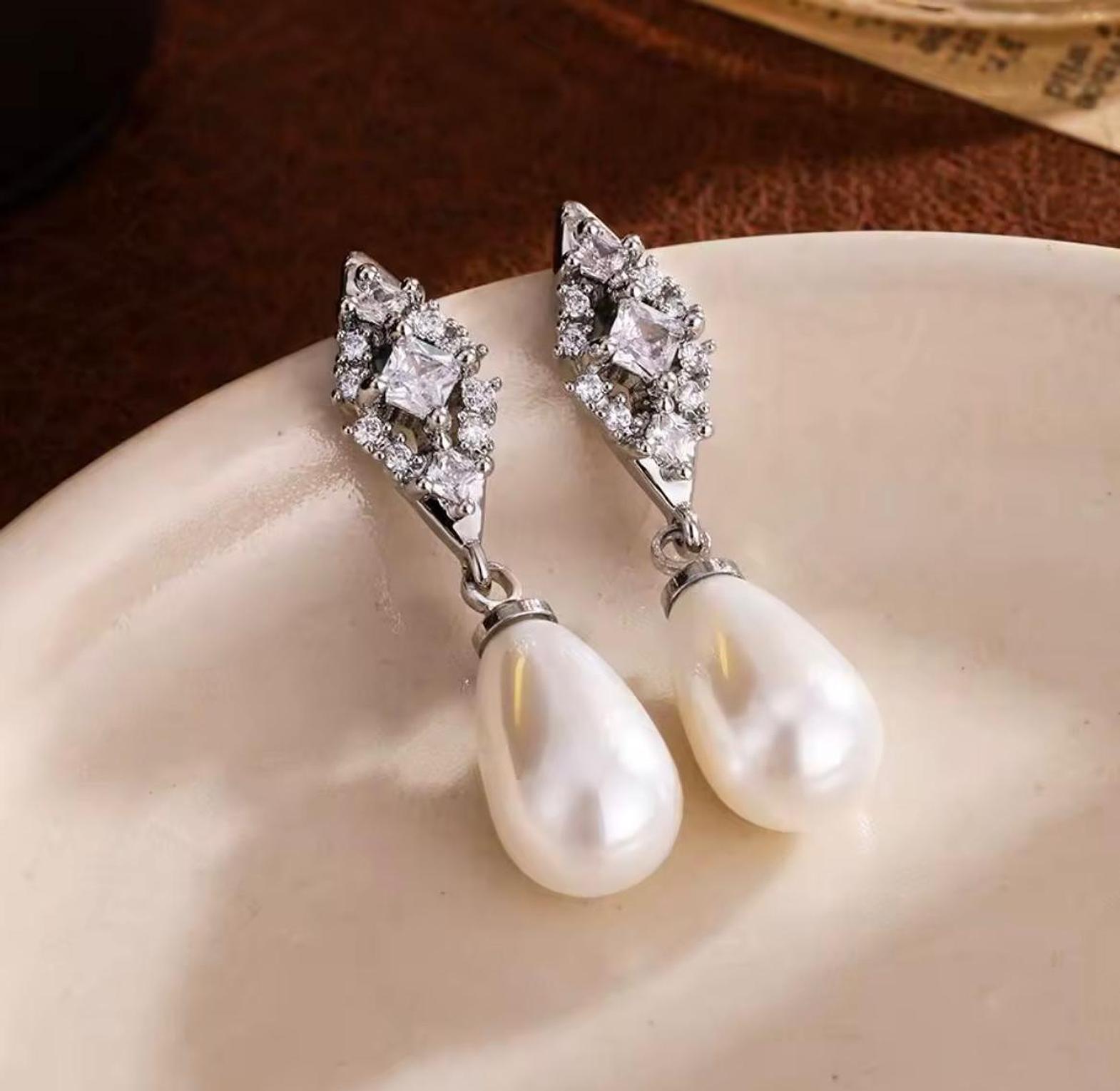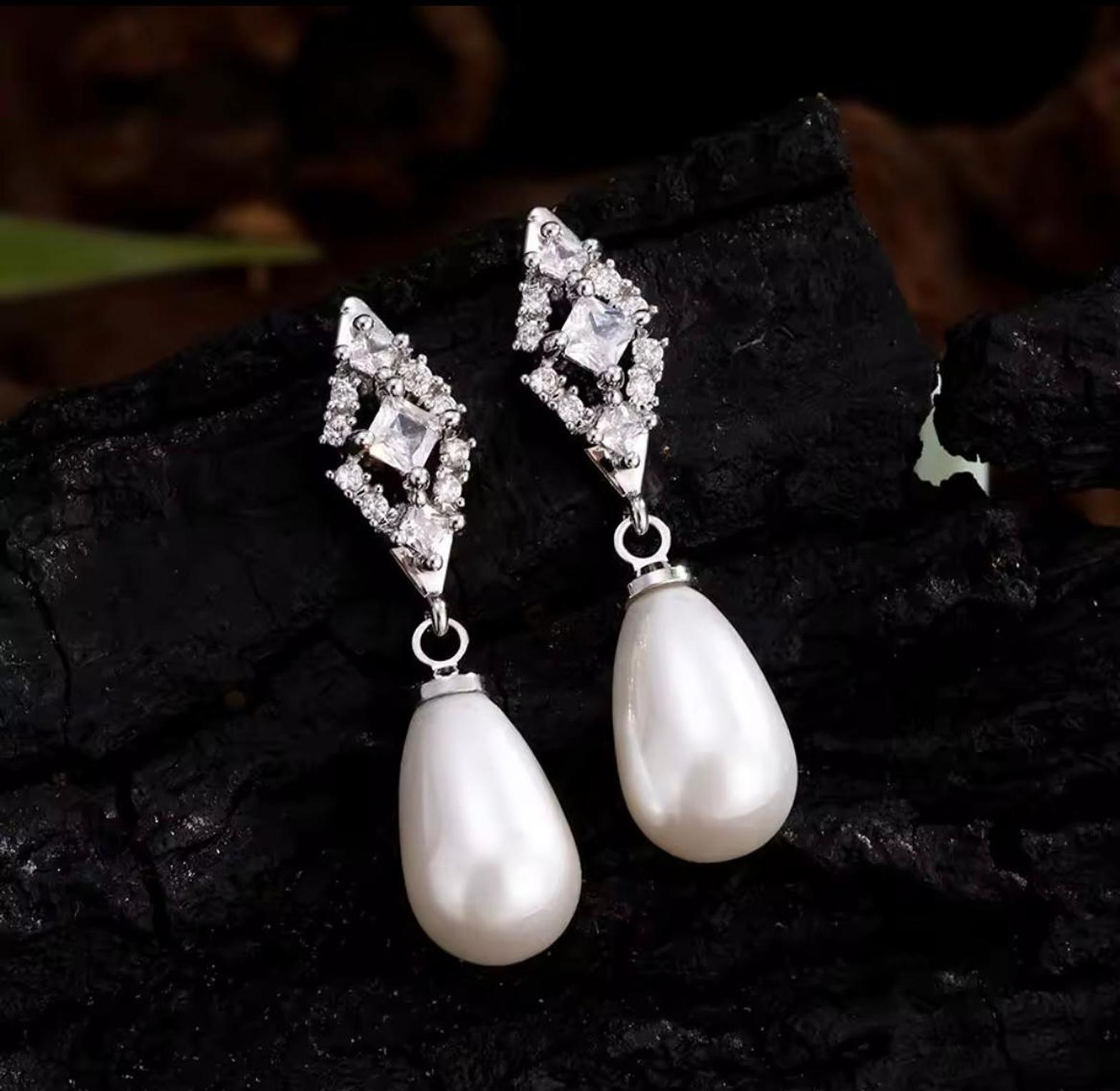 These elegant drop earrings pair a brilliant, angular diamond-shaped stud with a large, smoothly polished teardrop faux pearl dangle. They offer a perfect mix of contemporary geometric sparkle and classic pearl luster.