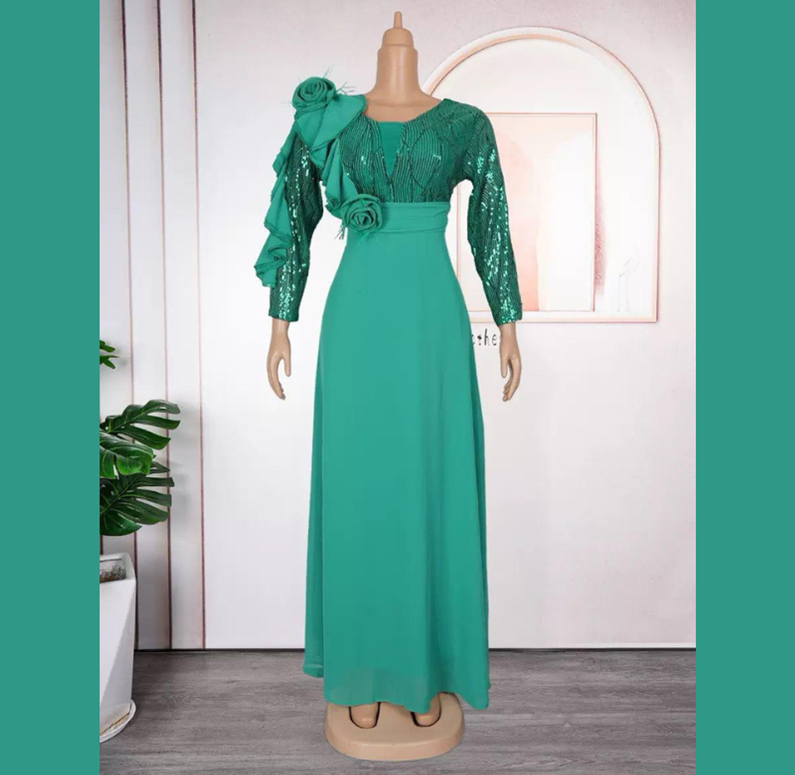 This vibrant emerald gown features a flattering A-line silhouette with a sequined bodice and dramatic three-dimensional floral shoulder accents. It's a striking and unique piece that guarantees an unforgettable, elegant entrance at any sophisticated event.
