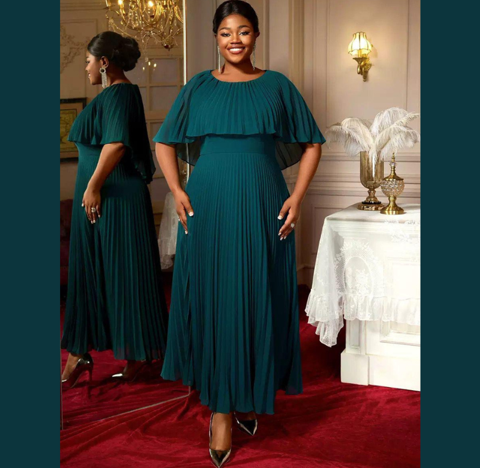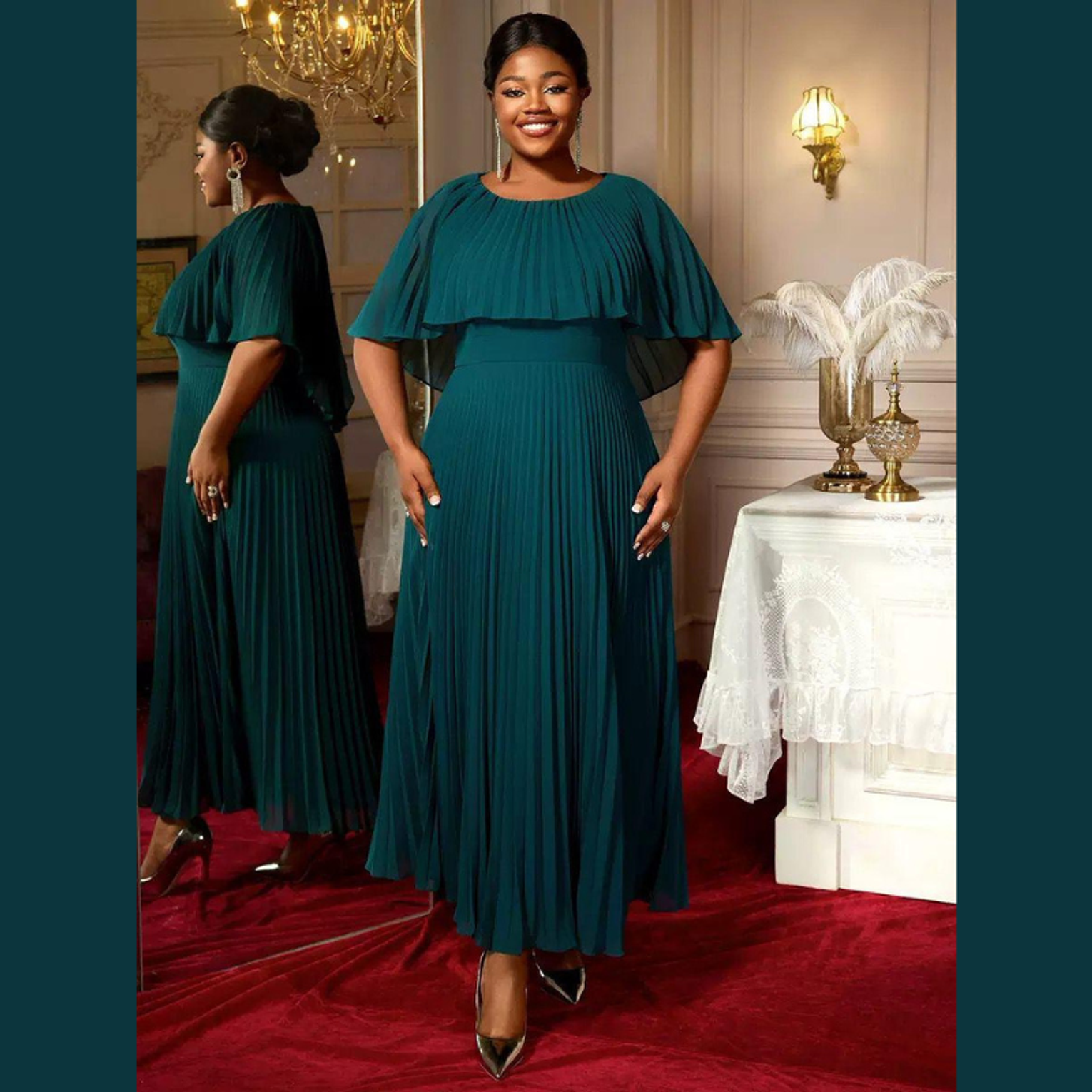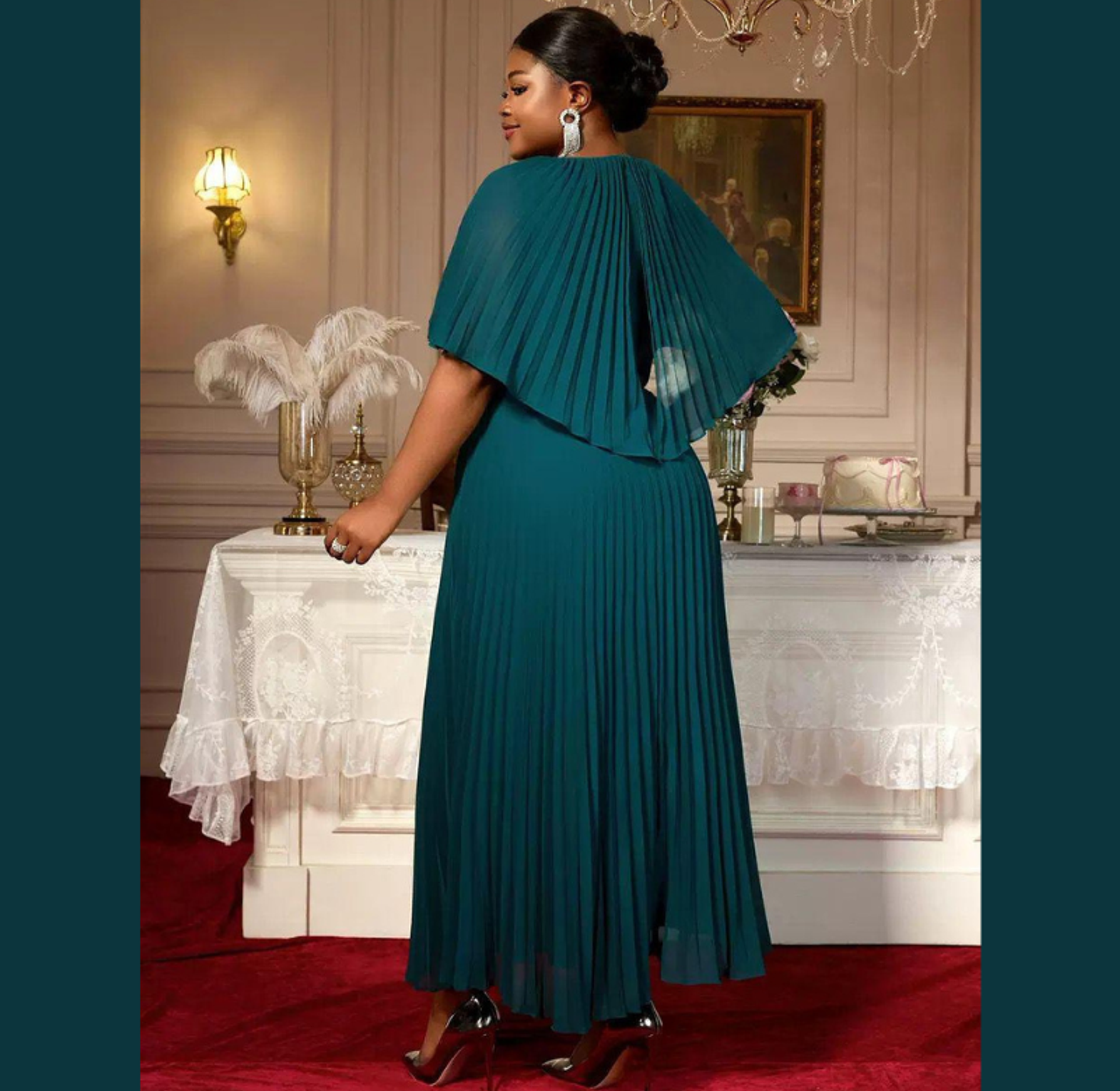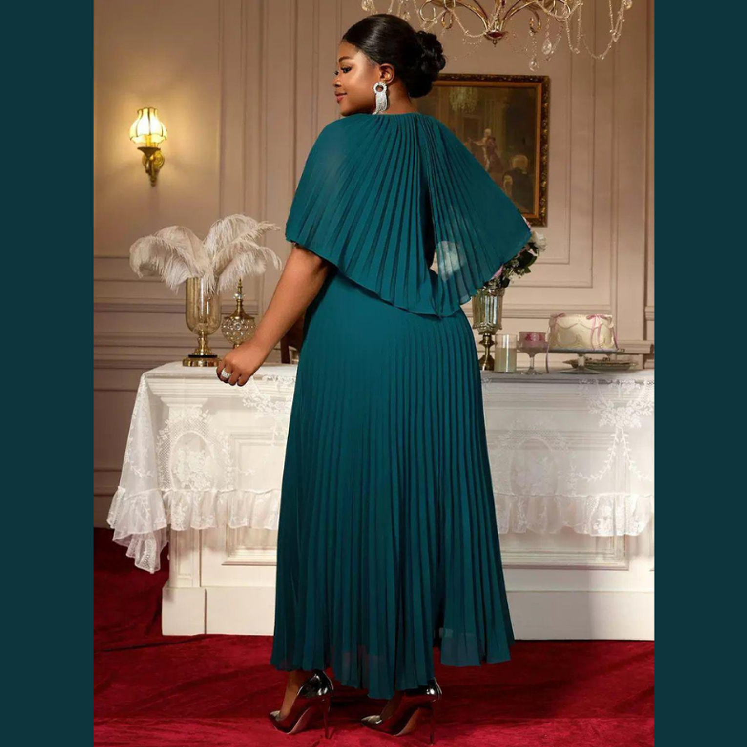 This striking emerald maxi dress features all-over vertical pleats and a dramatic, layered capelet overlay for an exceptionally graceful silhouette. The rich color and flowing texture ensure a sophisticated, movement-filled look for any special event.
