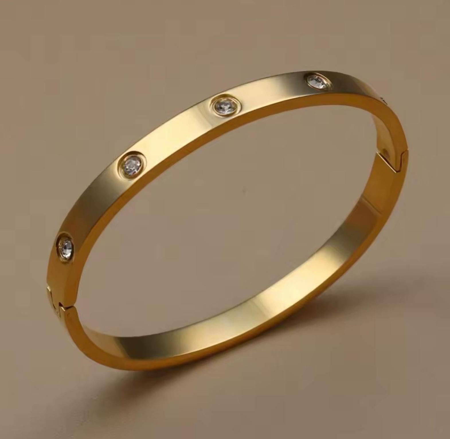 This sleek, gold-plated bangle is punctuated by brilliant bezel-set cubic zirconia stones for continuous, subtle sparkle. Crafted with hypoallergenic properties, this durable piece offers both luxury appeal and comfortable, everyday wear.