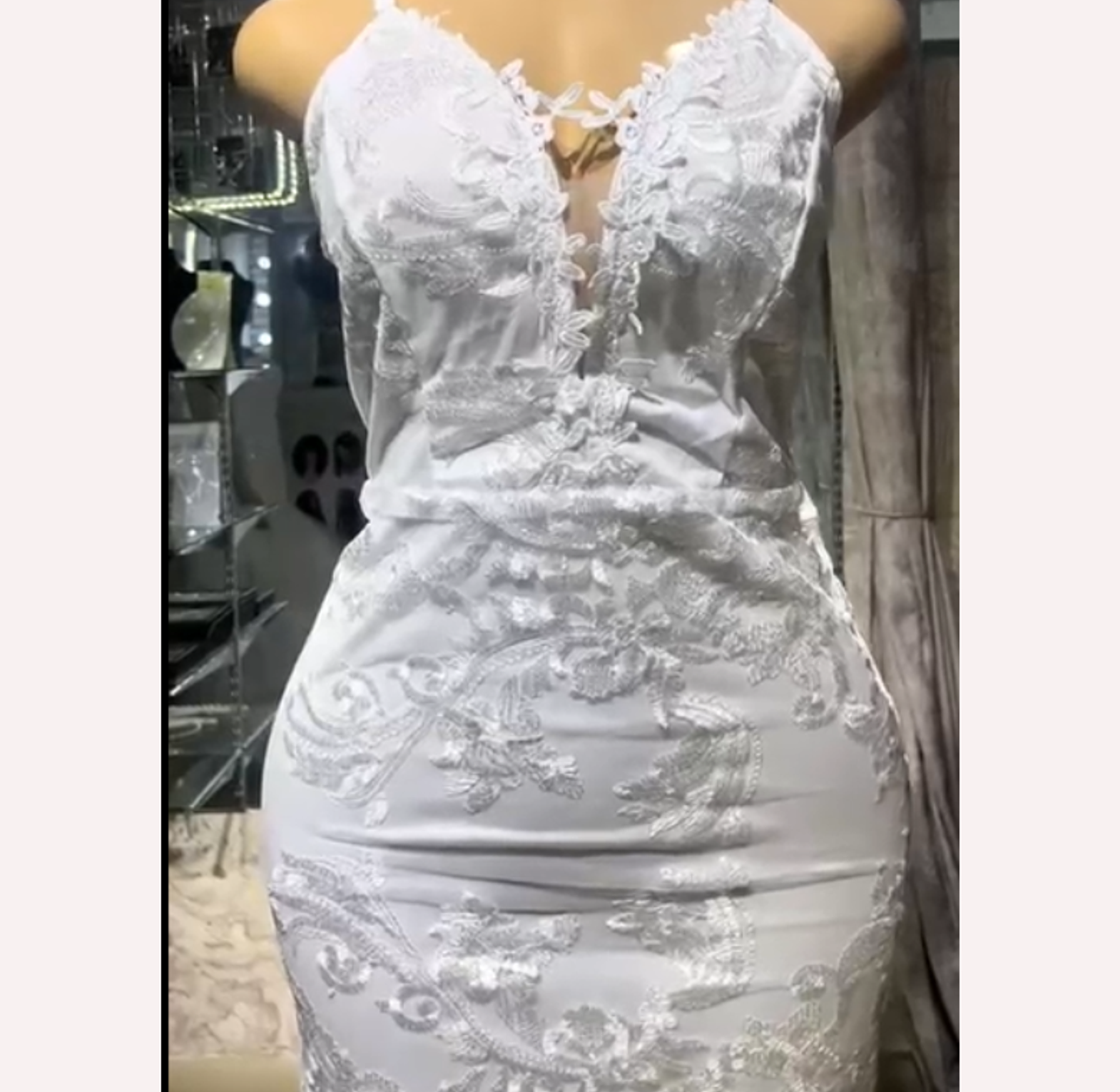 Embrace your figure in this sultry, sleek white gown, featuring delicate spaghetti straps and an intricate lace overlay that accentuates every curve. This dress delivers effortless, high-fashion glamour for the sophisticated, modern bride.