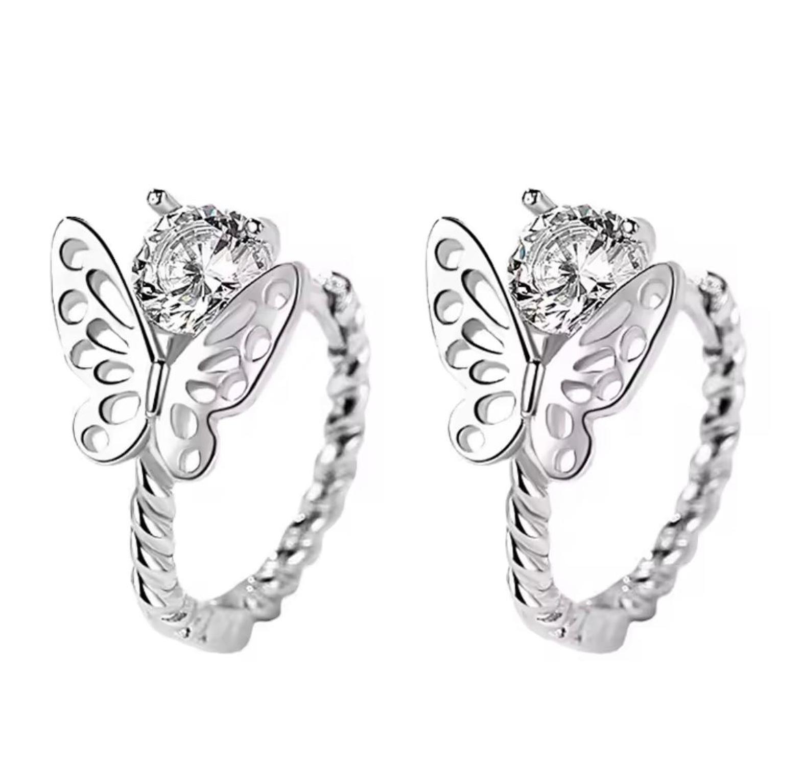 These whimsical hoop earrings feature a twisted texture and are adorned with a delicate, open-worked butterfly and a brilliant round solitaire stone. They provide a unique blend of enchanting detail and sparkling elegance.