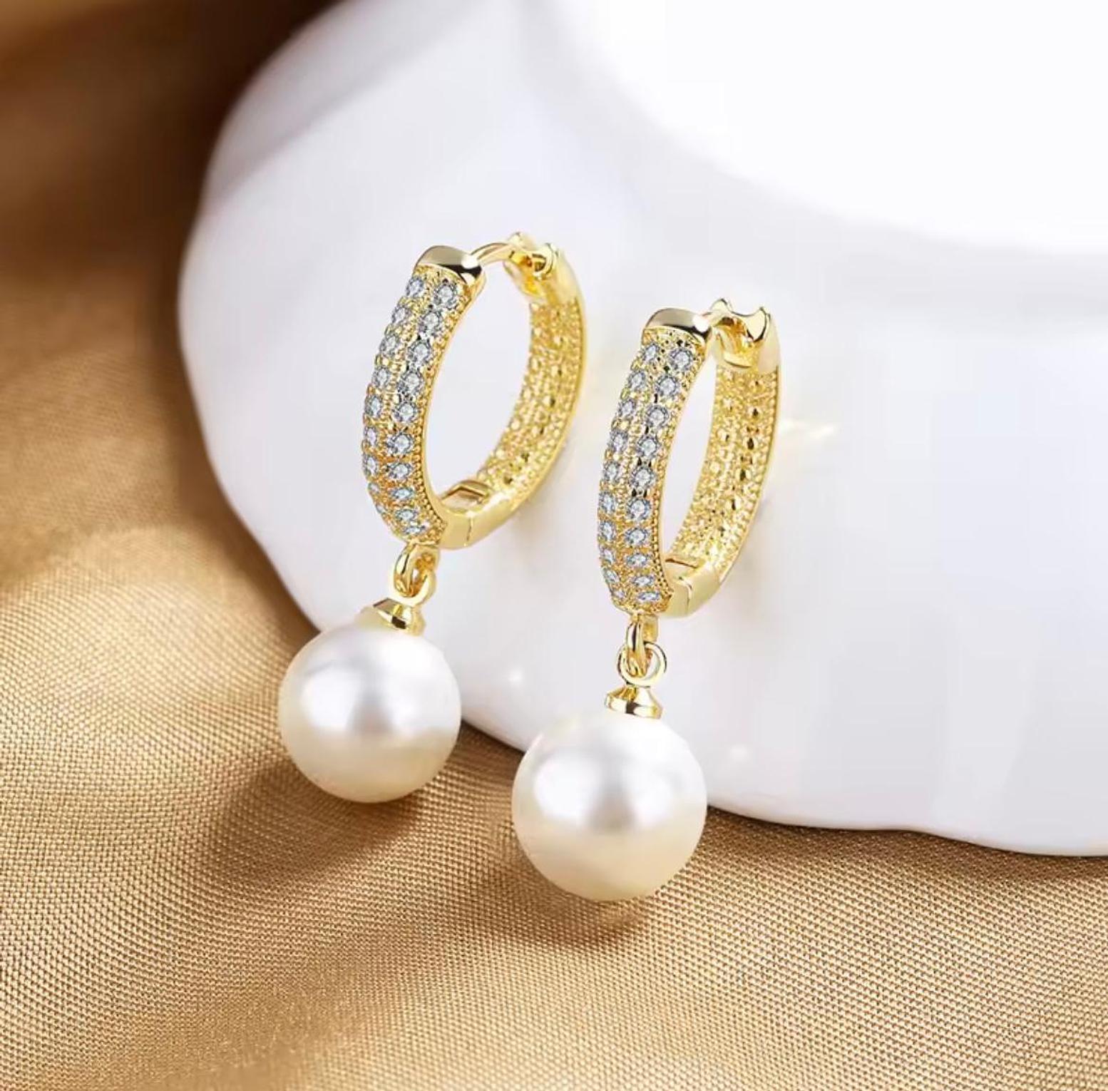 These stunning hoop earrings feature a rich gold-plated loop intricately set with brilliant micro-pave stones and finished with a dangling luminous faux pearl. They offer a perfect balance of dazzling sparkle and classic, creamy elegance.