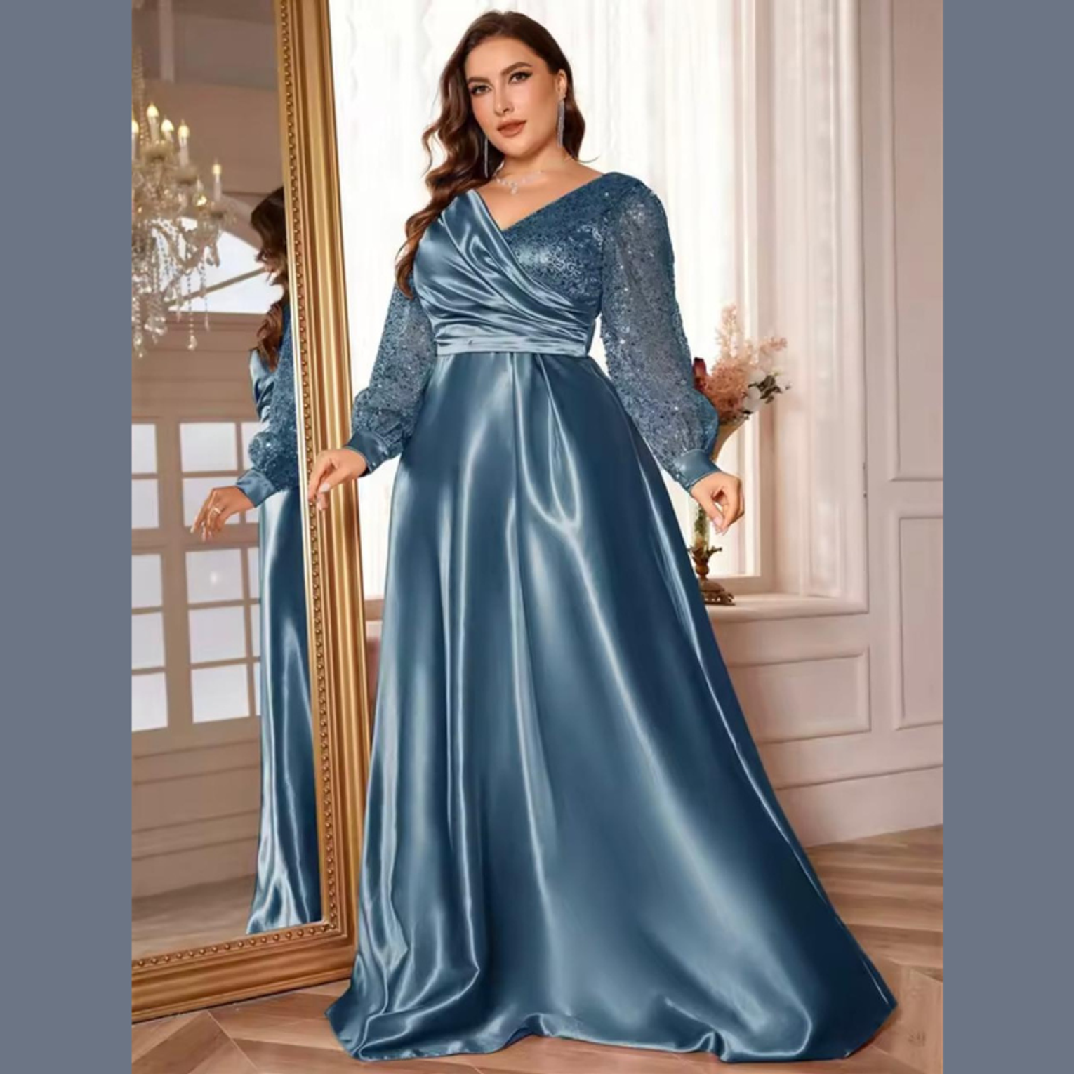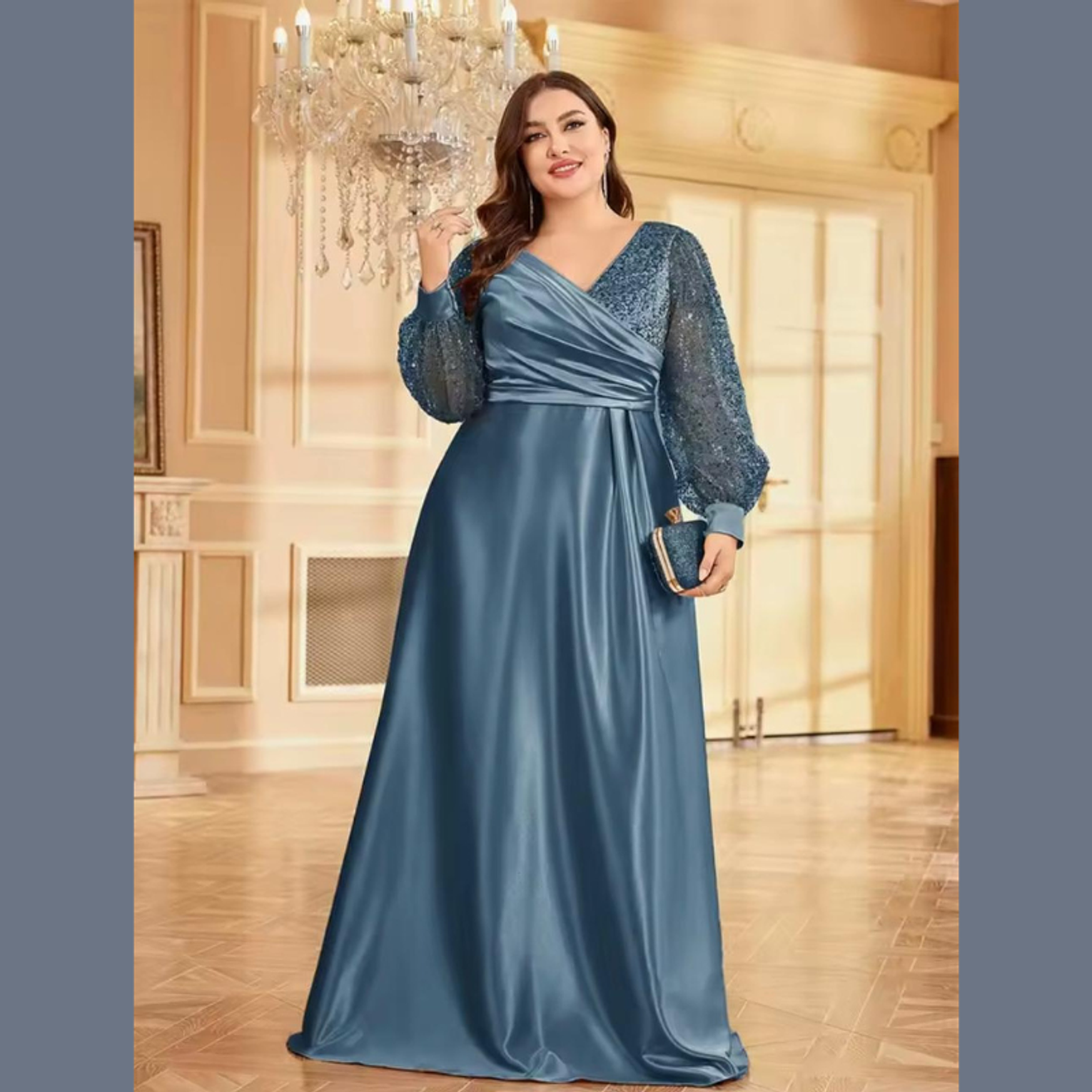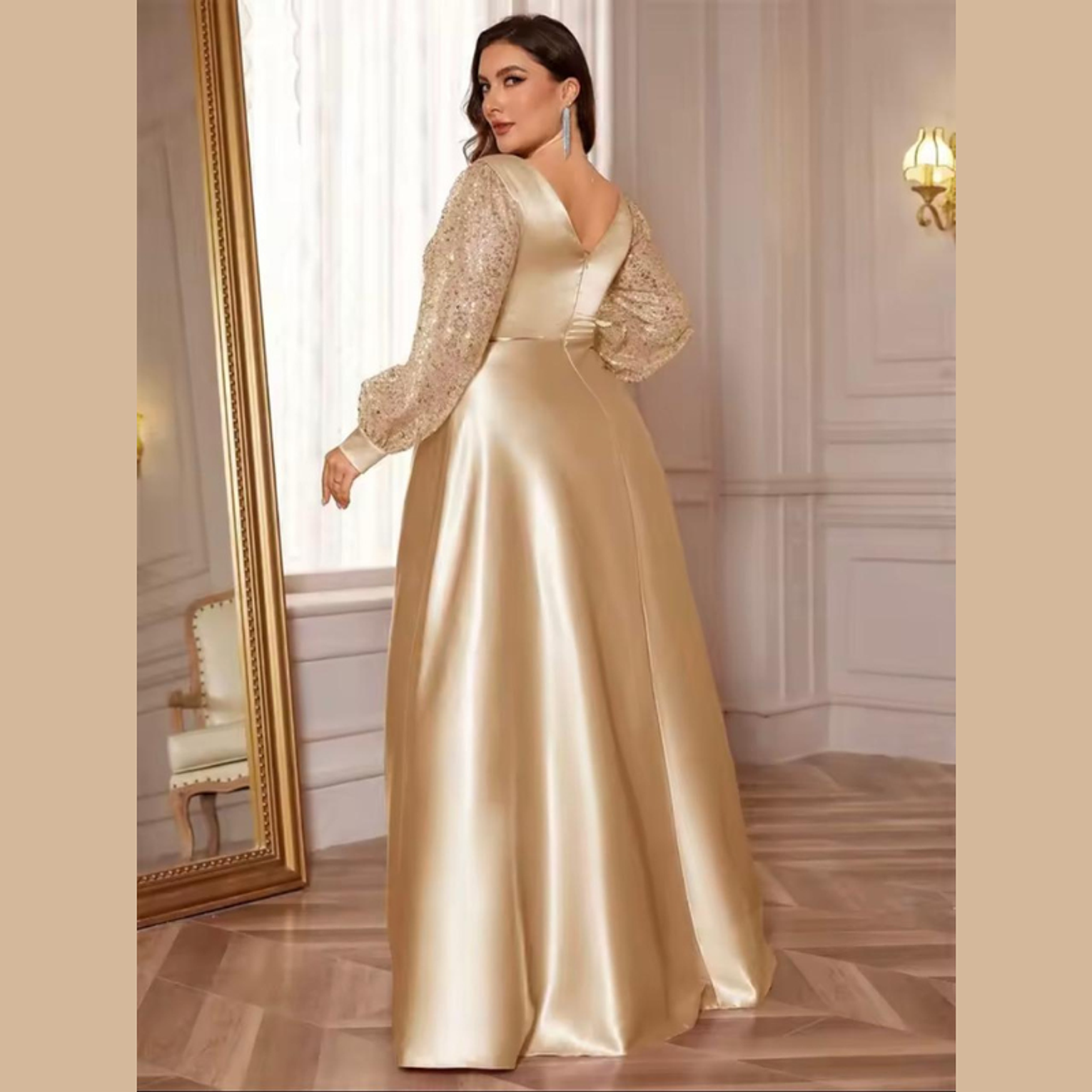This opulent A-line gown features a sweeping, high-sheen satin skirt complemented by a crossover bodice and dazzling balloon sleeves fully covered in gold-toned sequins. It's a truly majestic dress, perfectly balancing smooth elegance with high-impact sparkle.