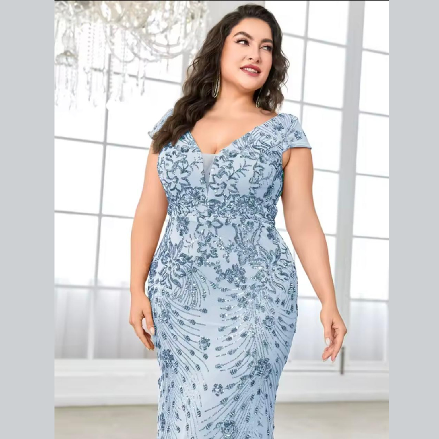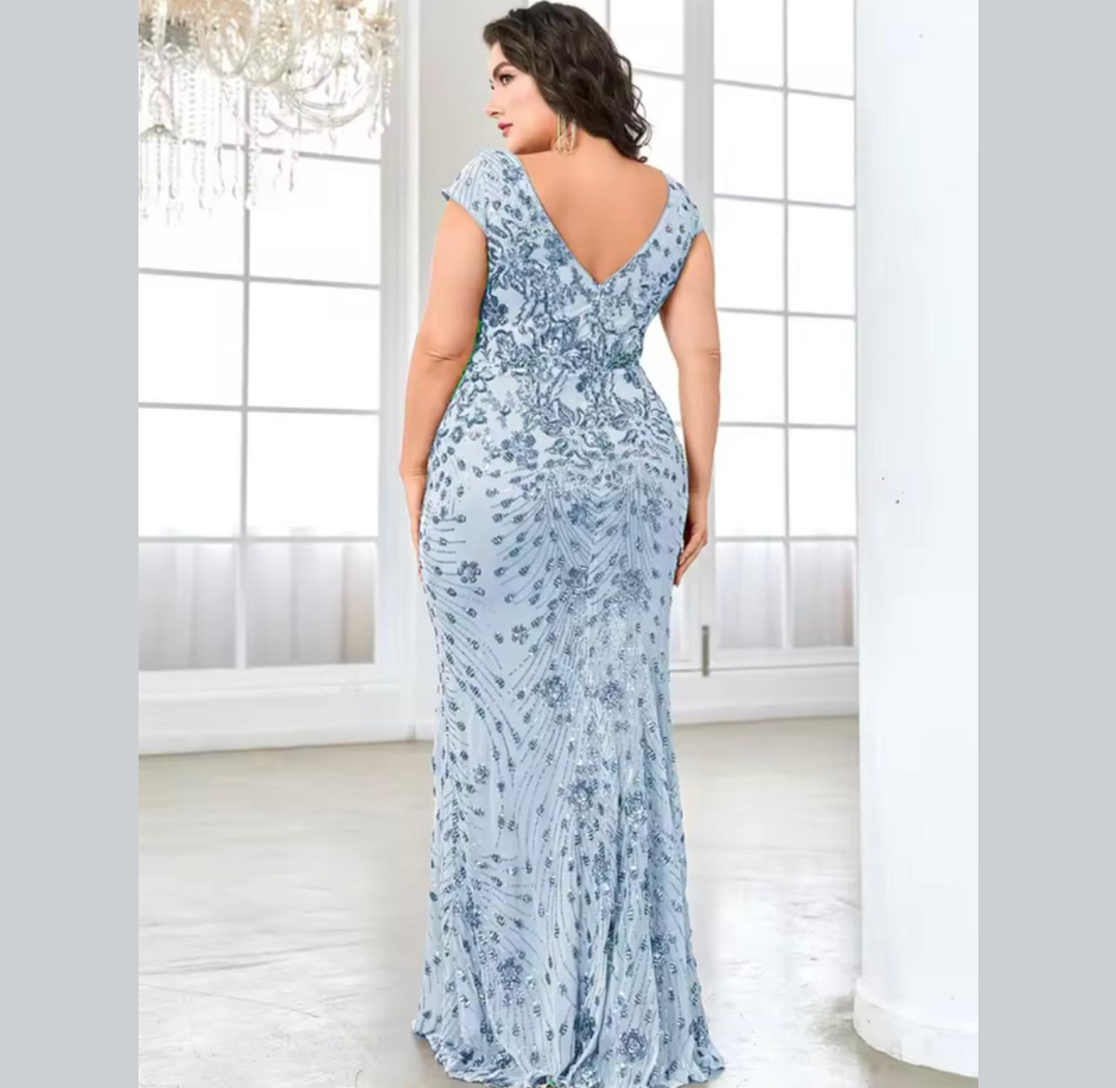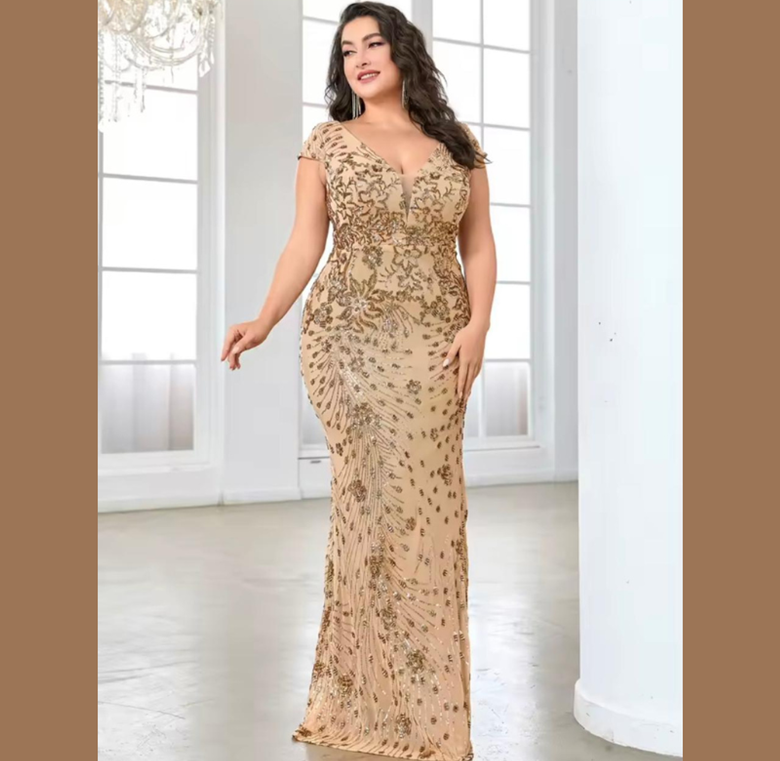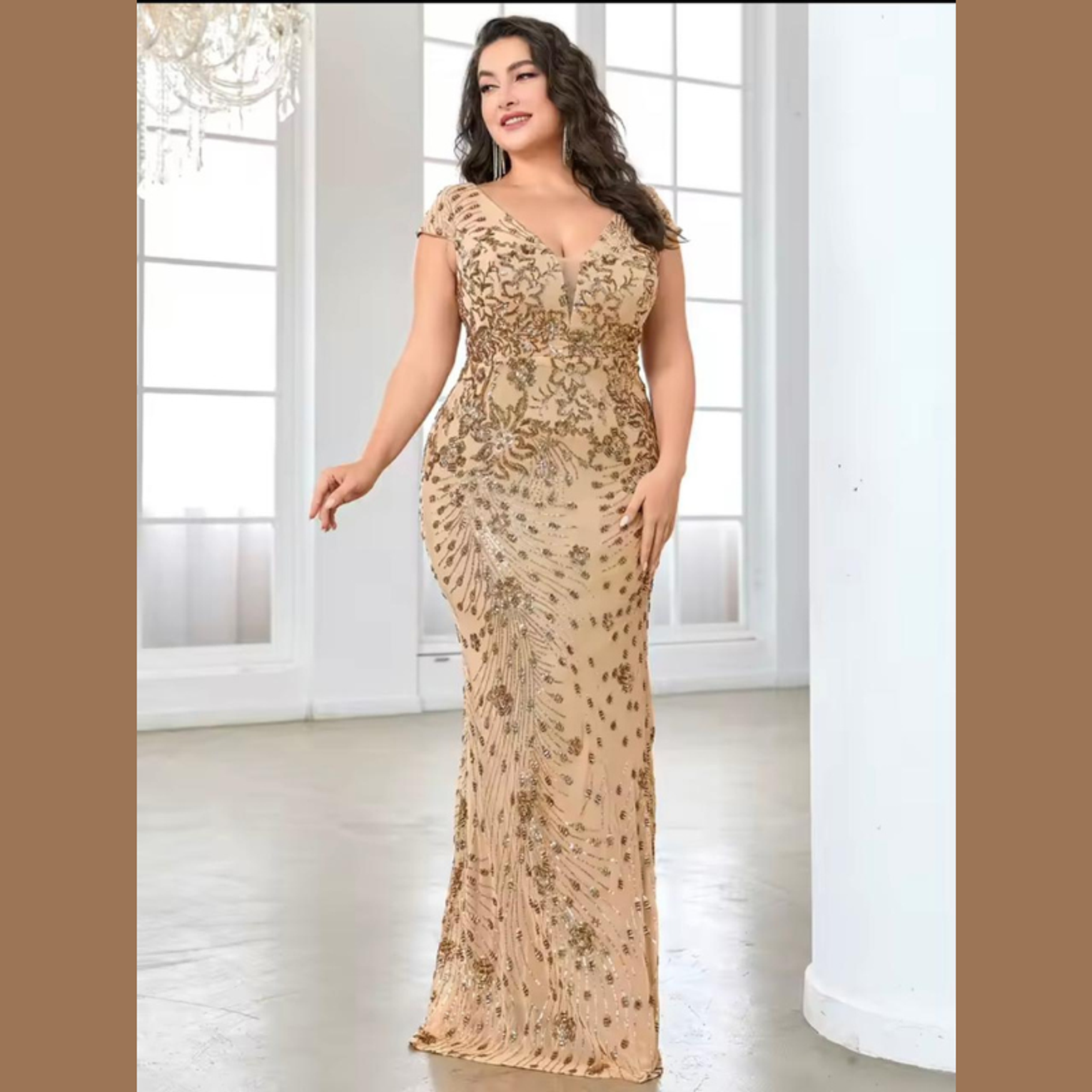 This luxurious plus-size gown features intricate, shimmering gold sequin embroidery set in an ornate vine pattern across a glamorous mermaid silhouette. The flattering V-neck and cap sleeves deliver a majestic, sophisticated look for any major formal occasion.