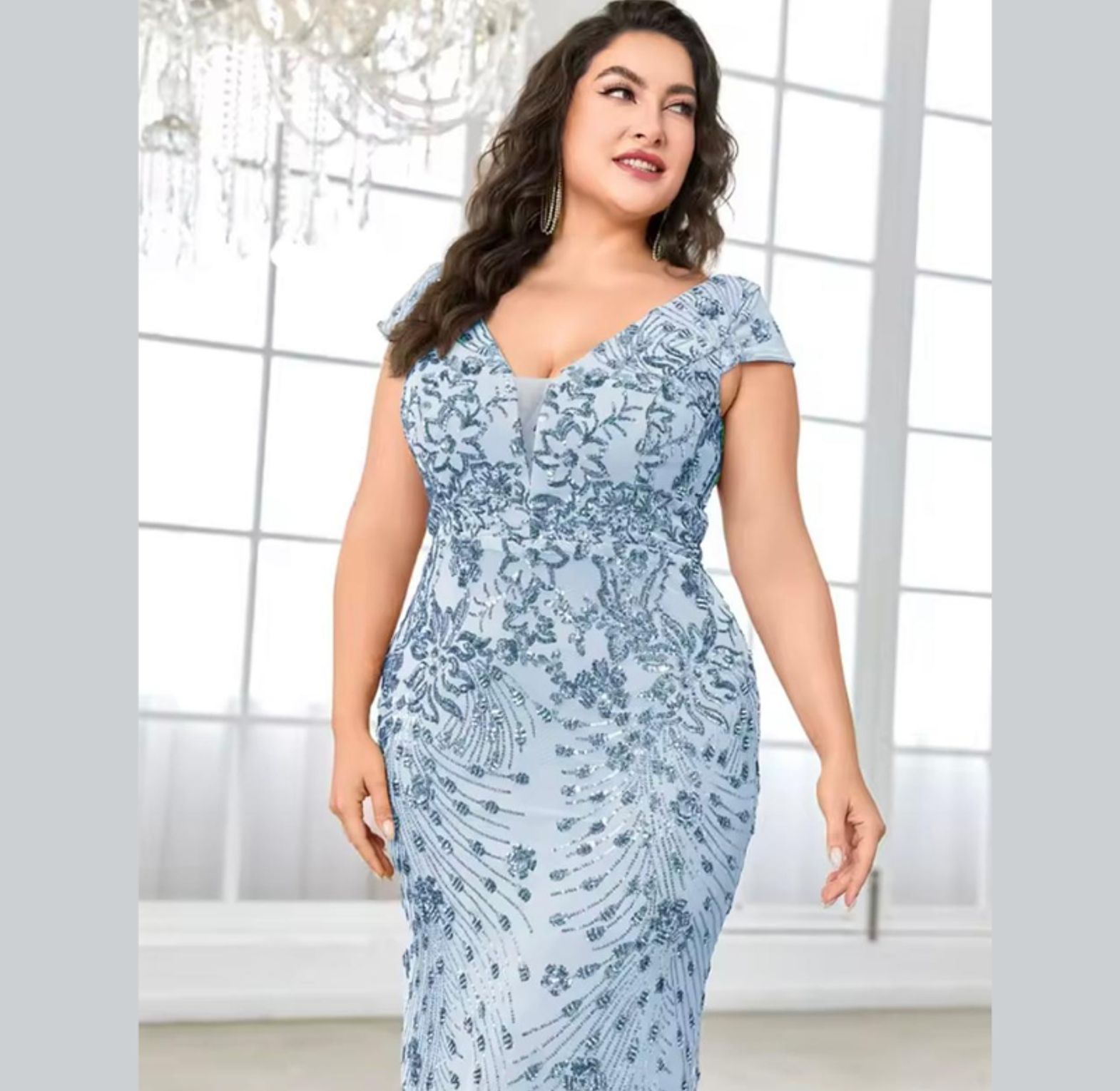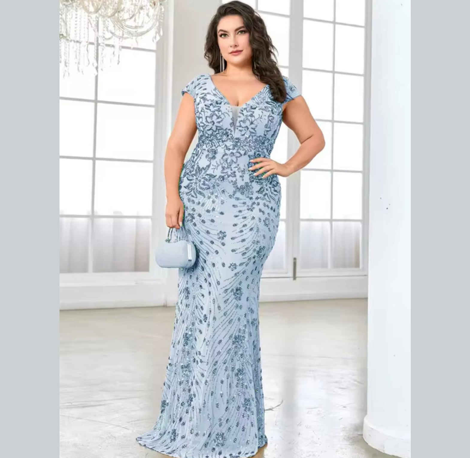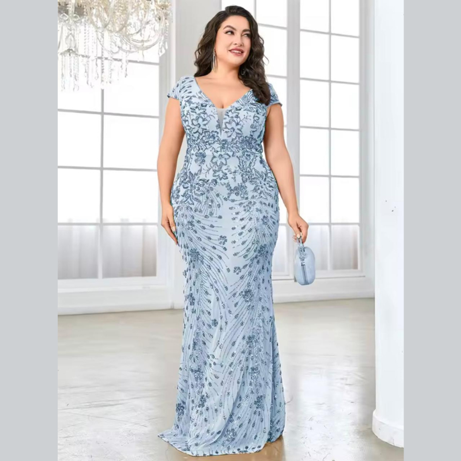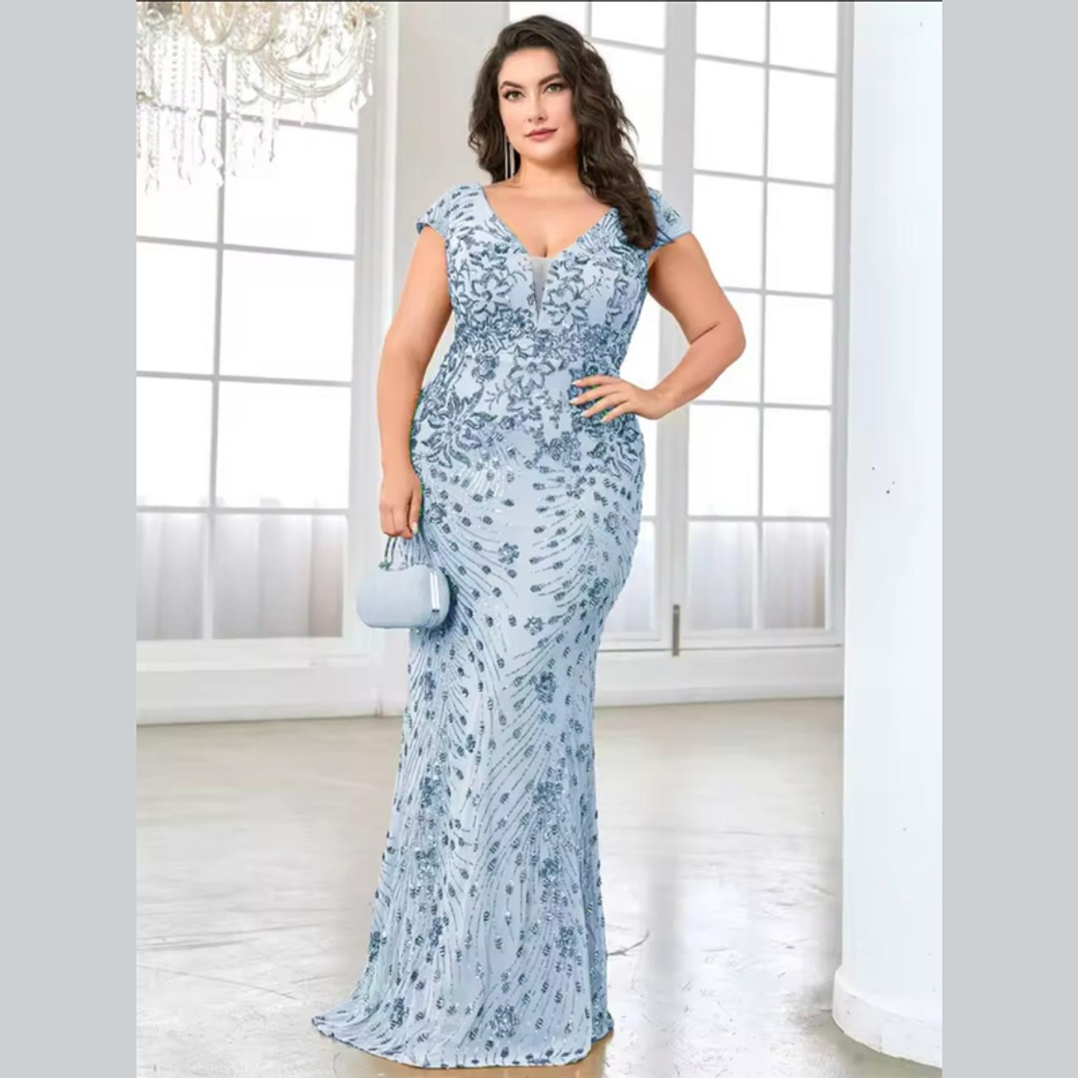 This luxurious plus-size gown features intricate, shimmering gold sequin embroidery set in an ornate vine pattern across a glamorous mermaid silhouette. The flattering V-neck and cap sleeves deliver a majestic, sophisticated look for any major formal occasion.