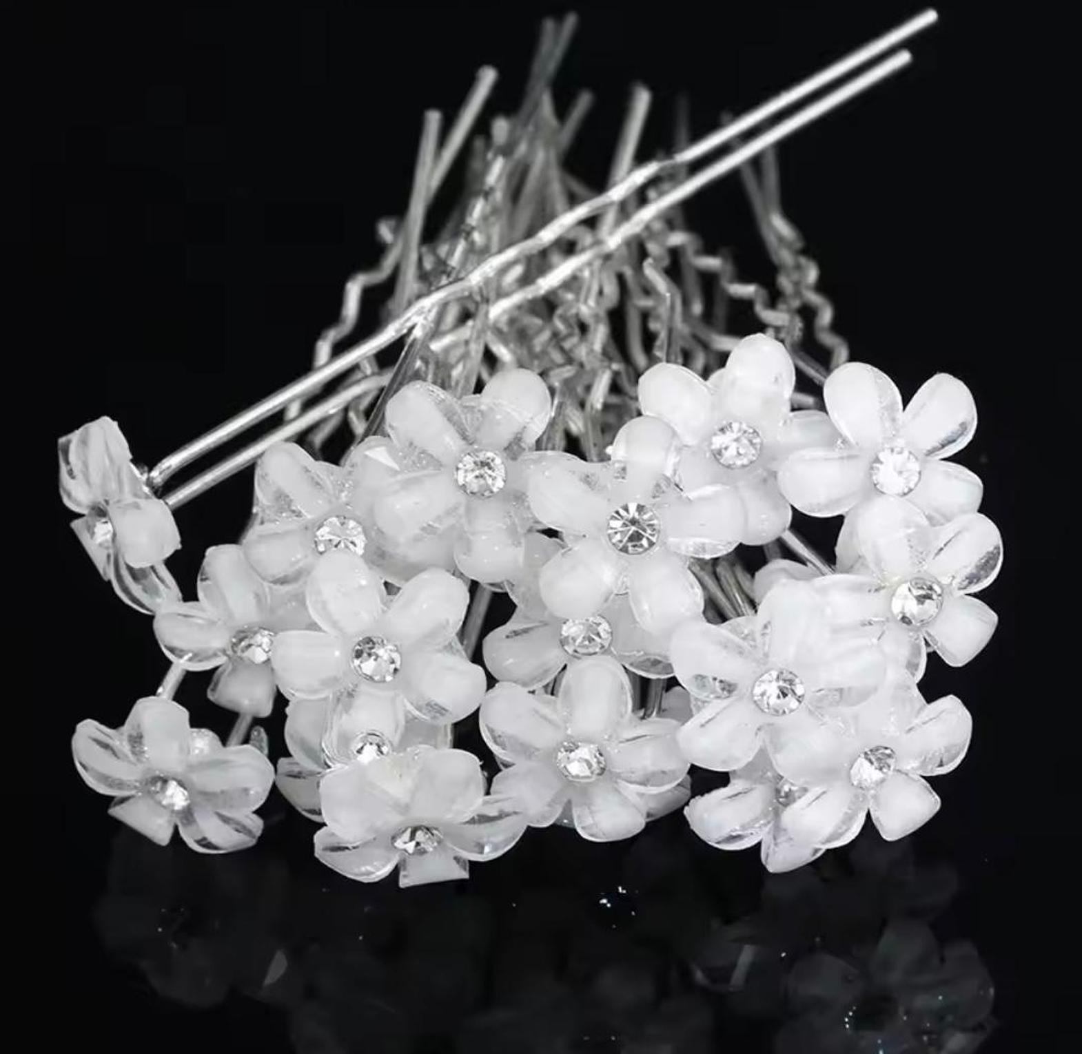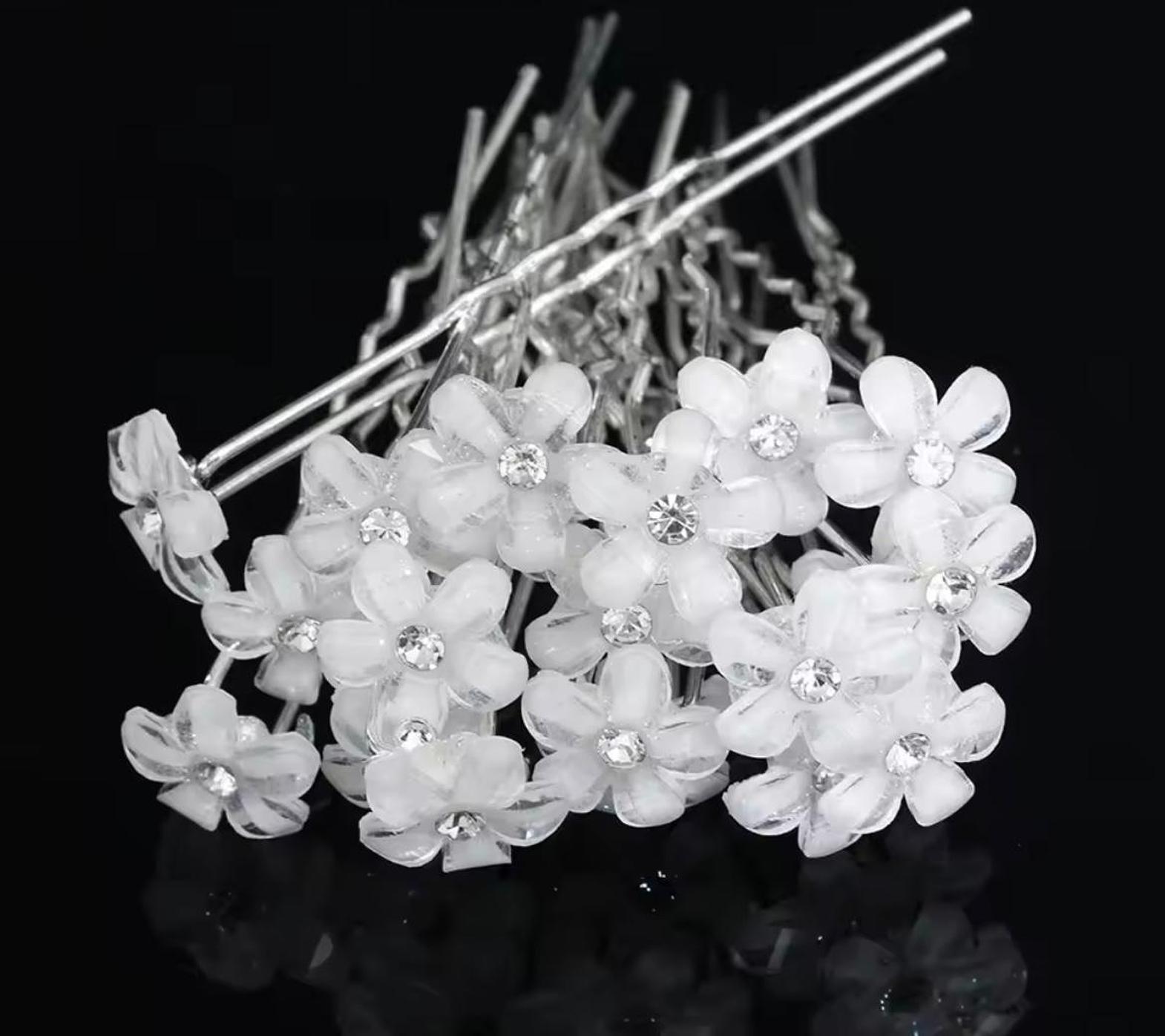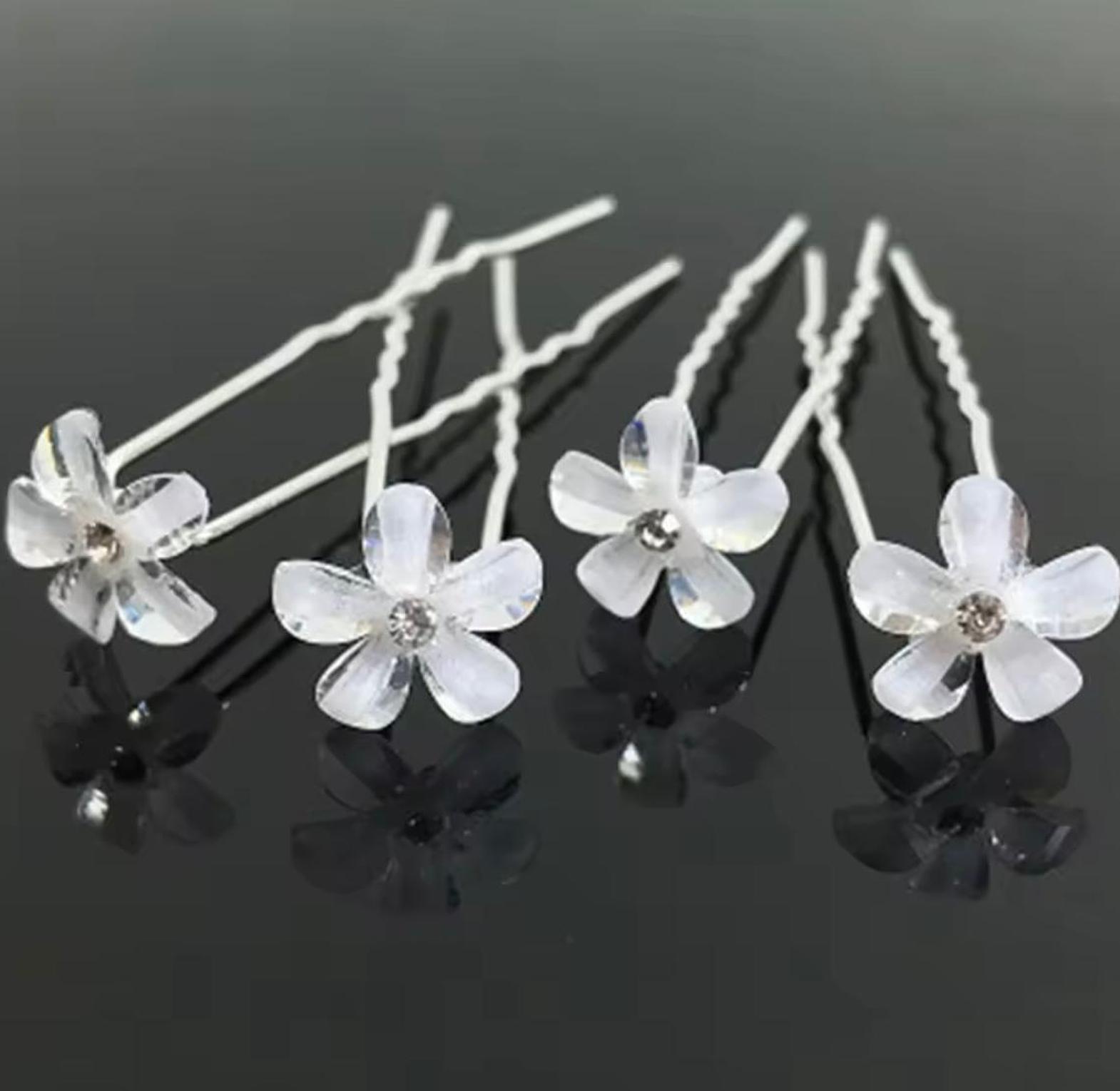 These striking hair pins showcase five finely faceted, clear acrylic petals centered with a dazzling accent crystal for maximum sparkle. The sophisticated, icy design makes them a subtle yet captivating addition to formal updos. 2 pins for 100
