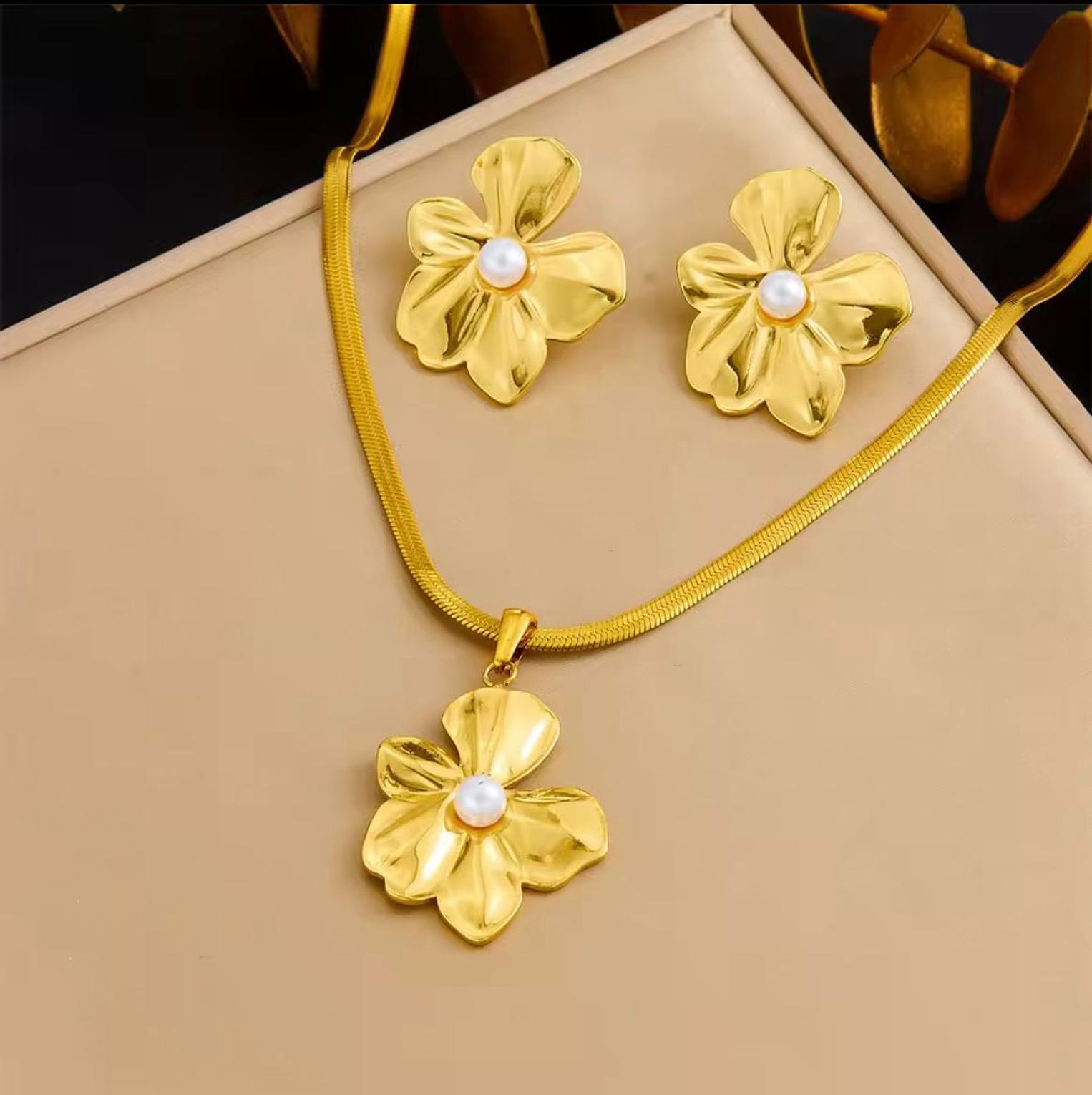 This stunning set captures the essence of spring with highly polished, sculpturally designed four-petal flowers centered by a delicate faux pearl. Crafted from hypoallergic stainless steel, this jewelry ensures a safe and comfortable fit for all-day wear.