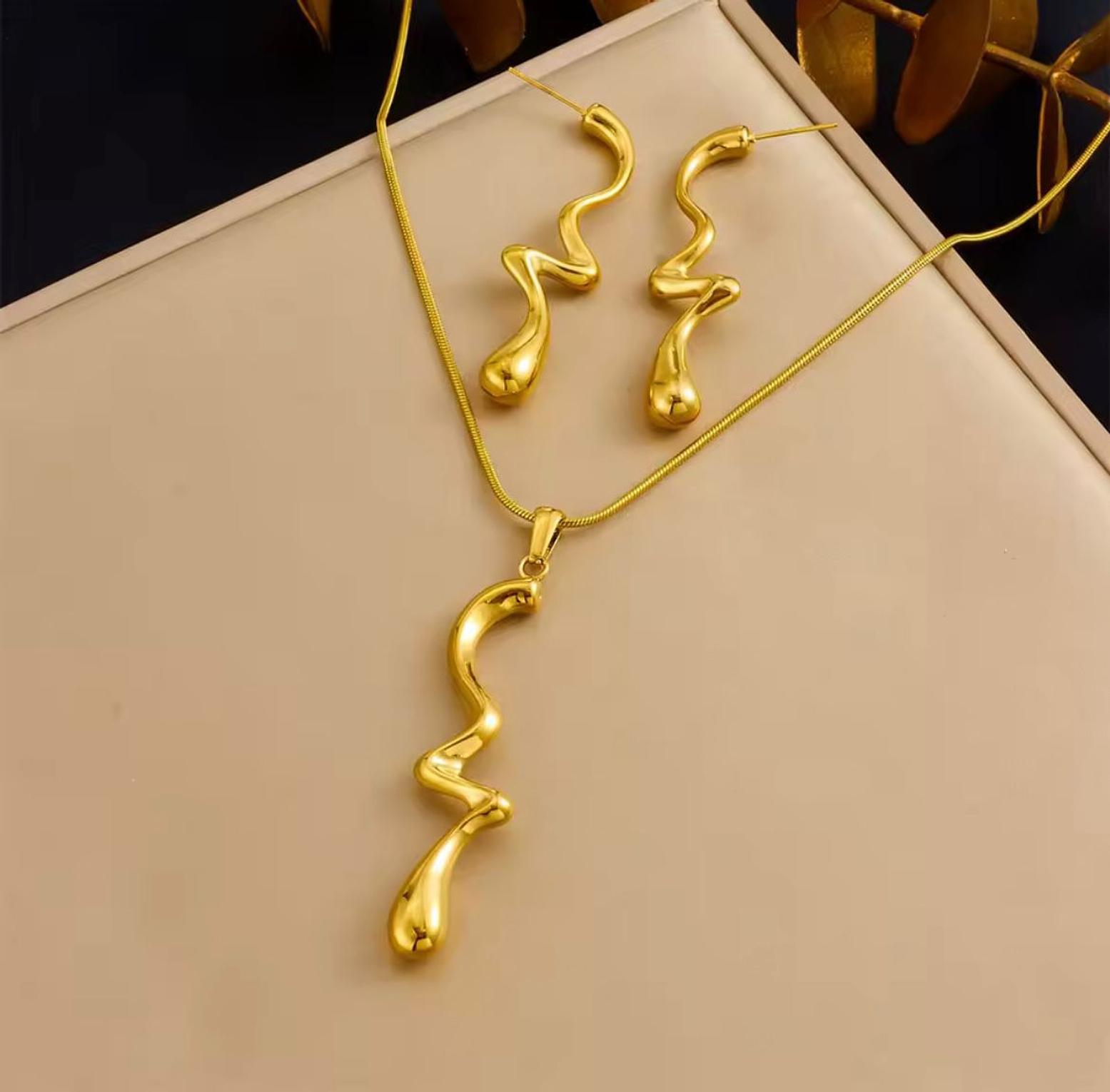 Embrace the beauty of modern art with this captivating jewelry set featuring fluid, wave-like silhouettes that mimic the movement of liquid gold. It is a bold, avant-garde choice for the fashion-forward individual looking to add a sculptural edge to their accessory collection.