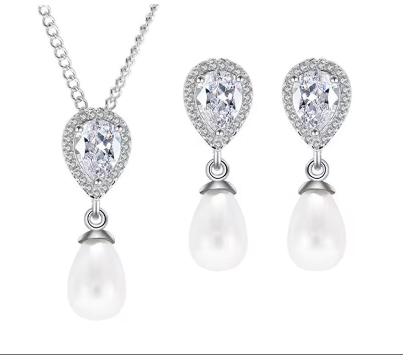 This magnificent set features a pear-cut brilliant stone surrounded by a sparkling pavé halo, from which a teardrop simulated pearl gracefully hangs. Available in both classic white and warm gold metal finishes, it offers a luxurious blend of sparkle and luster.