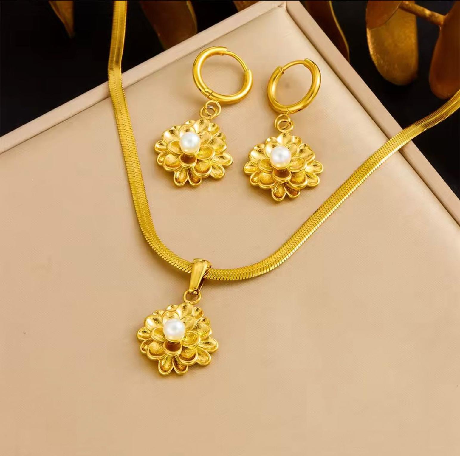 Embrace a look of sun-drenched luxury with this masterfully crafted jewelry ensemble, designed to celebrate classic botanical beauty. The set includes a striking pendant and matching hoop-style drop earrings, each showcasing a meticulously detailed, multi-tiered flower crafted from vibrant gold-plated petals. At the heart of each golden blossom sits a luminous, high-shine pearl, providing a soft, iridescent contrast to the rich, reflective metallic finish. The pendant is suspended from a sleek, flat snake chain that rests comfortably against the skin, ensuring the floral centerpiece remains the focal point of your attire.