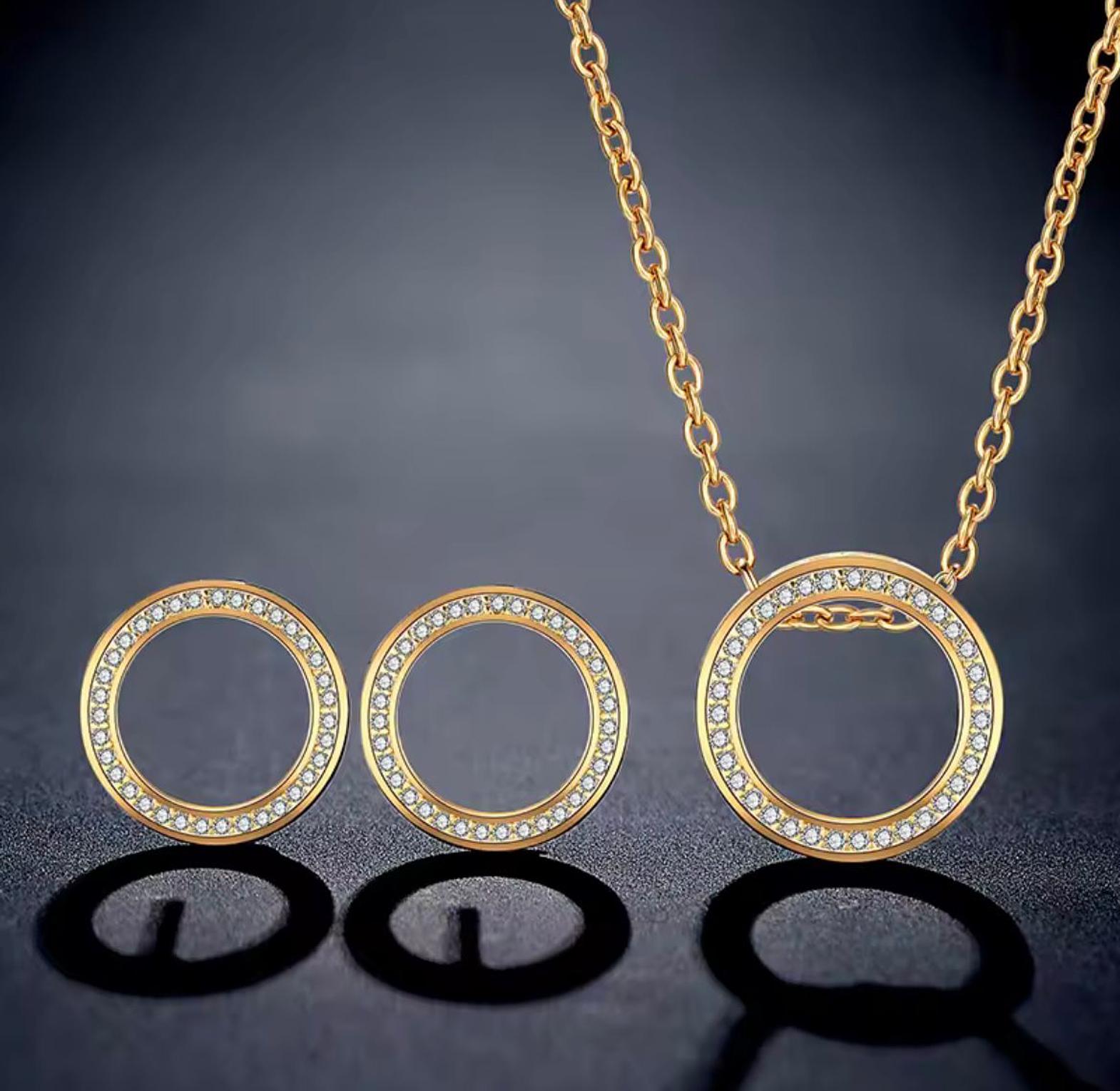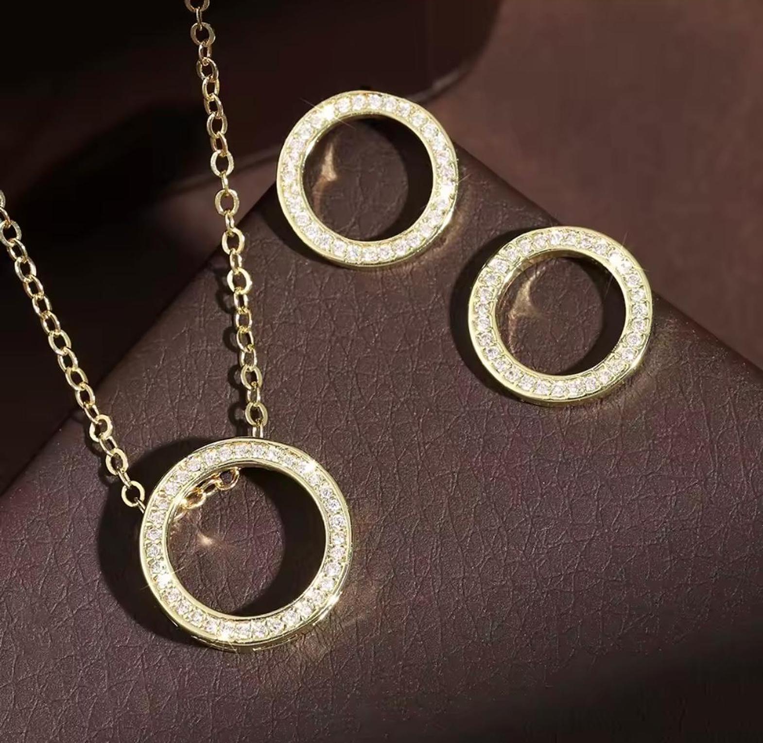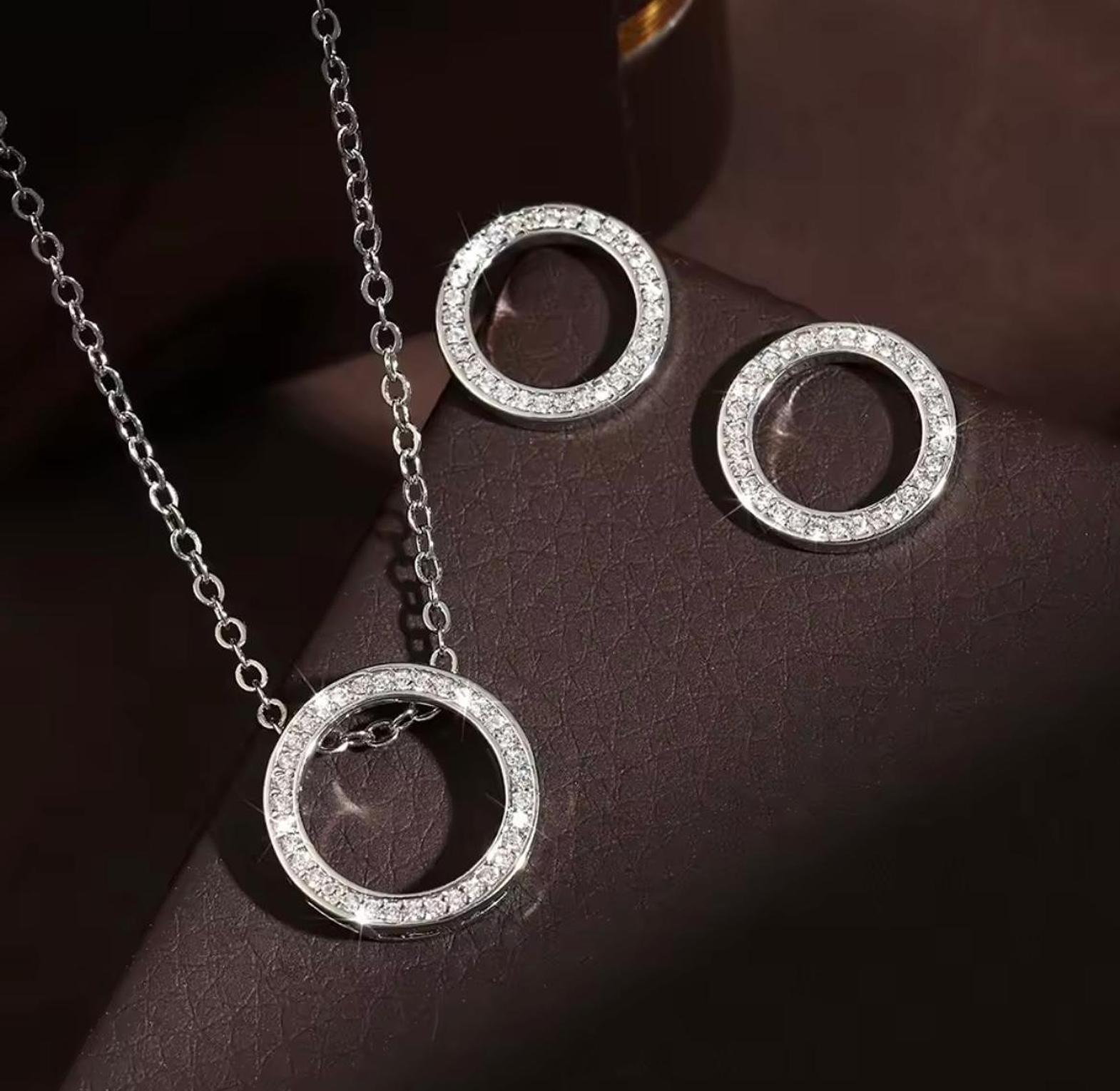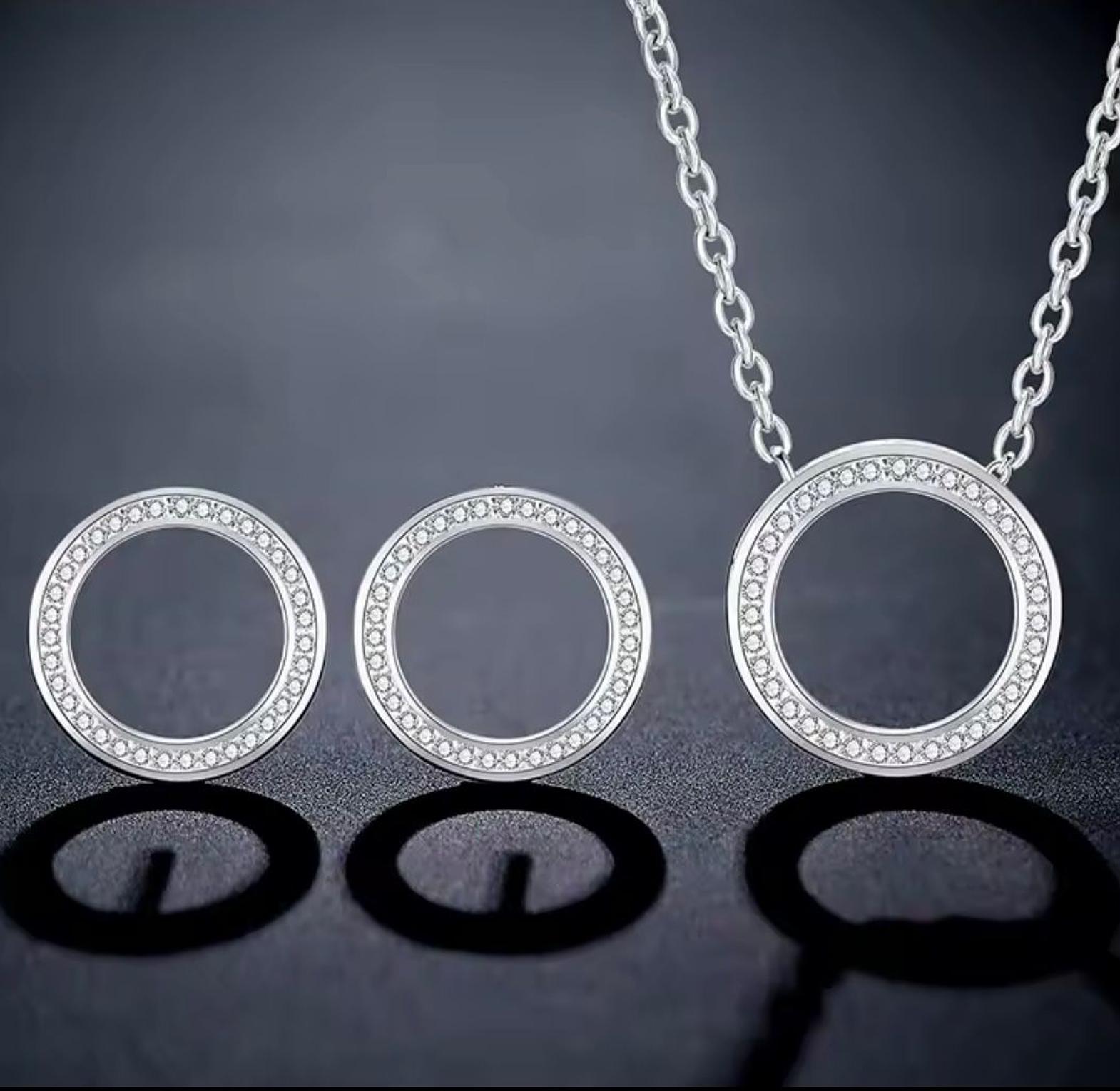 This modern and elegant jewelry set features perfectly symmetrical open circles bordered with brilliant micro-pavé stones for continuous sparkle. The coordinated look is available in both a luminous gold finish and a sleek, contemporary silver variant.