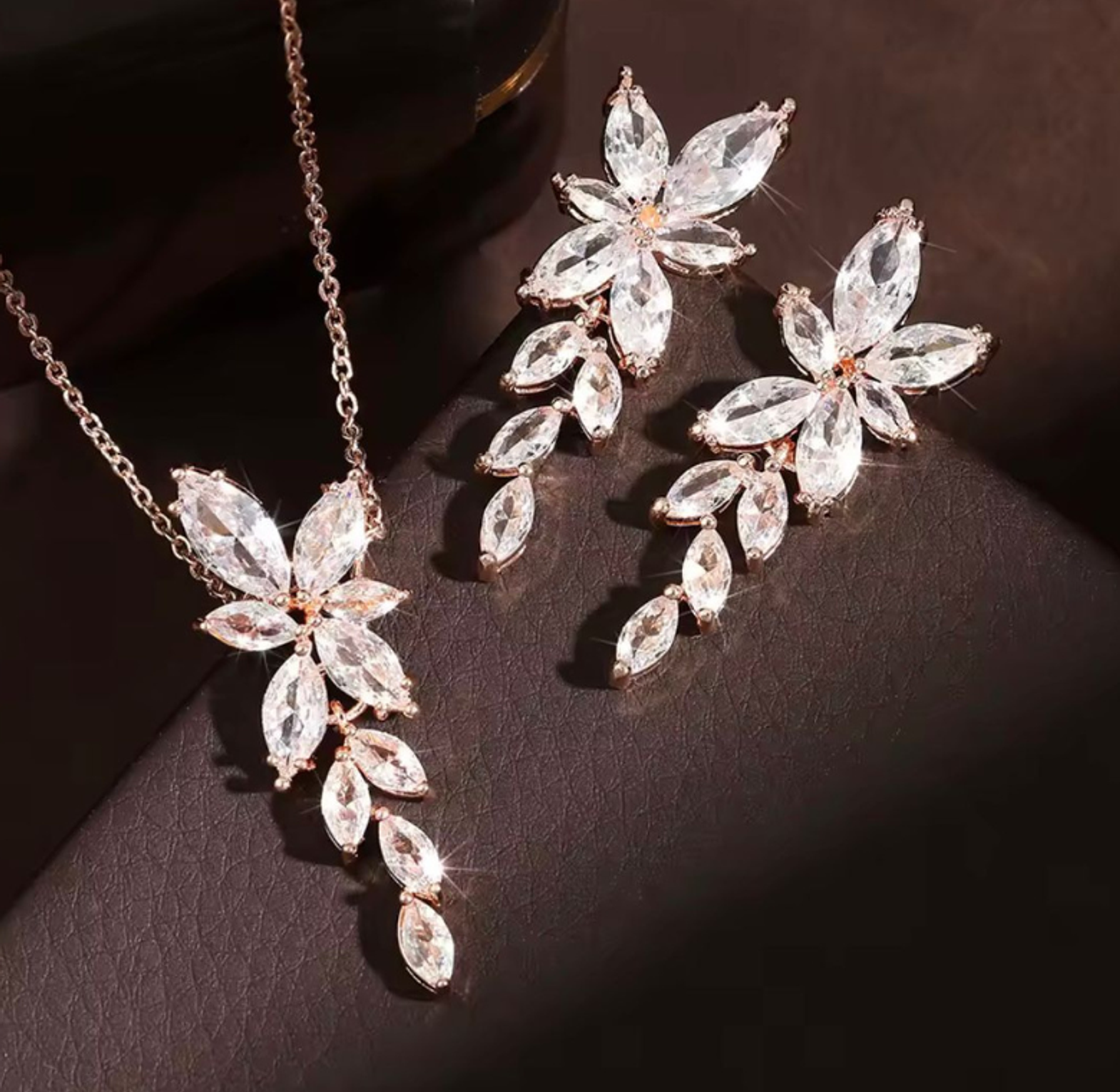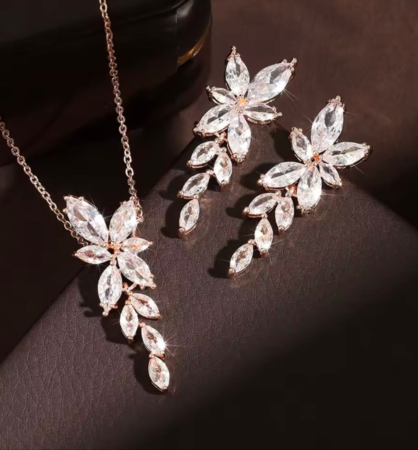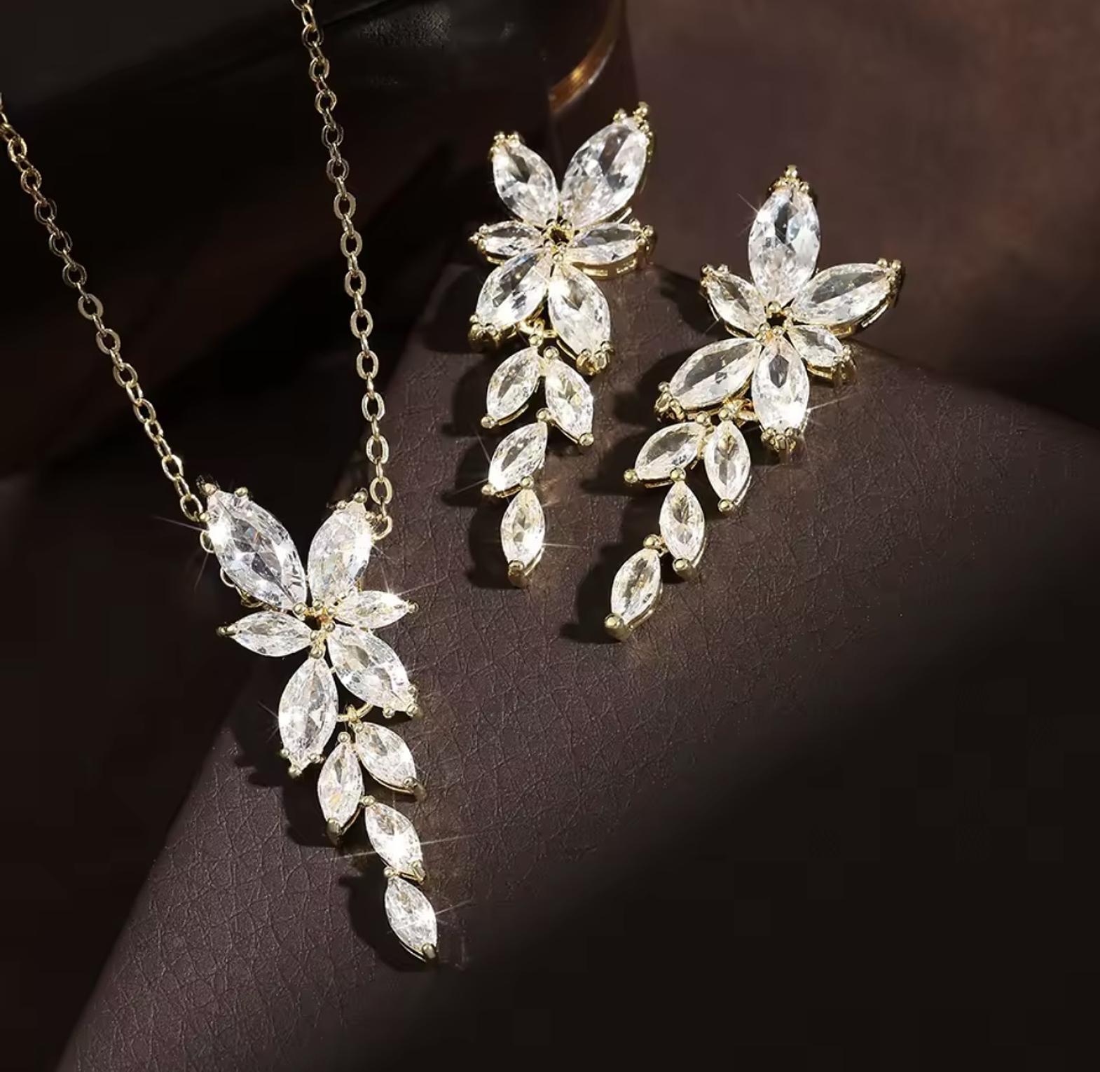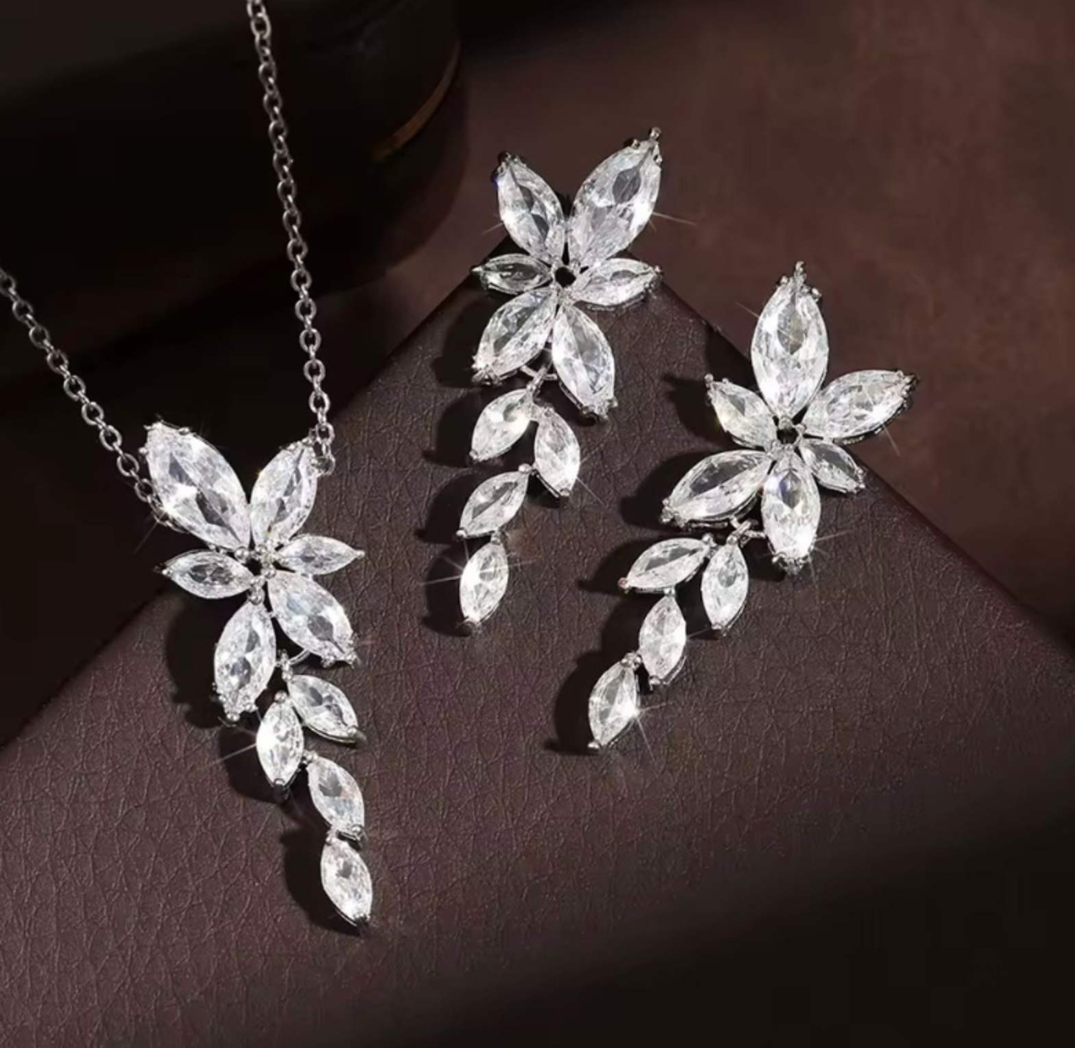 Radiate timeless elegance with this exquisite floral-inspired set, featuring shimmering marquise-cut crystals that capture the light from every angle. It is the perfect sophisticated duo to elevate your evening attire or celebrate a special milestone.