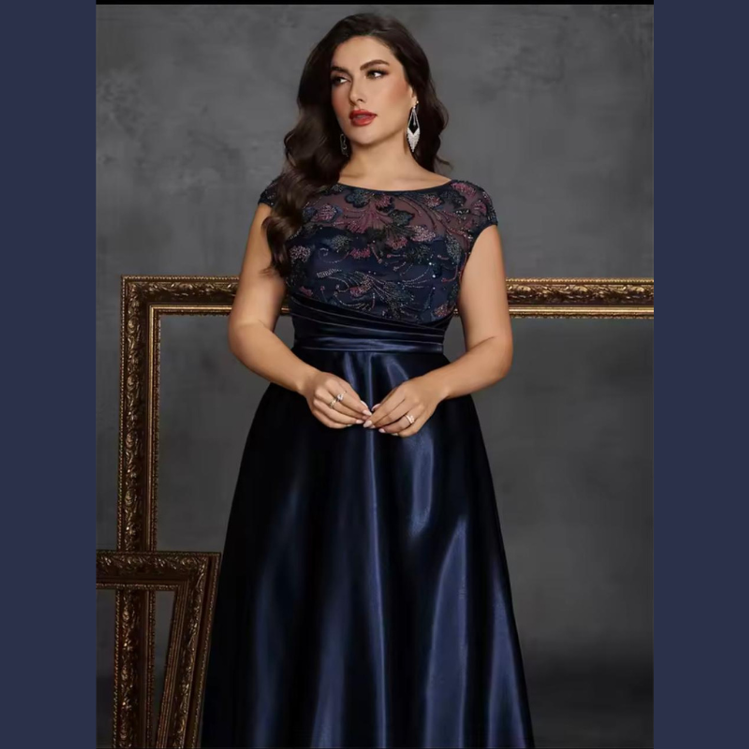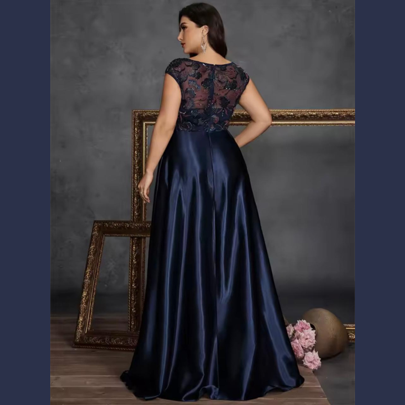 This elegant 2XL gown features a structured, glossy satin skirt beautifully contrasted with a refined mesh bodice and delicate floral embroidery. The sophisticated navy color and mixed textures create a timeless, regal look perfect for any grand occasion.