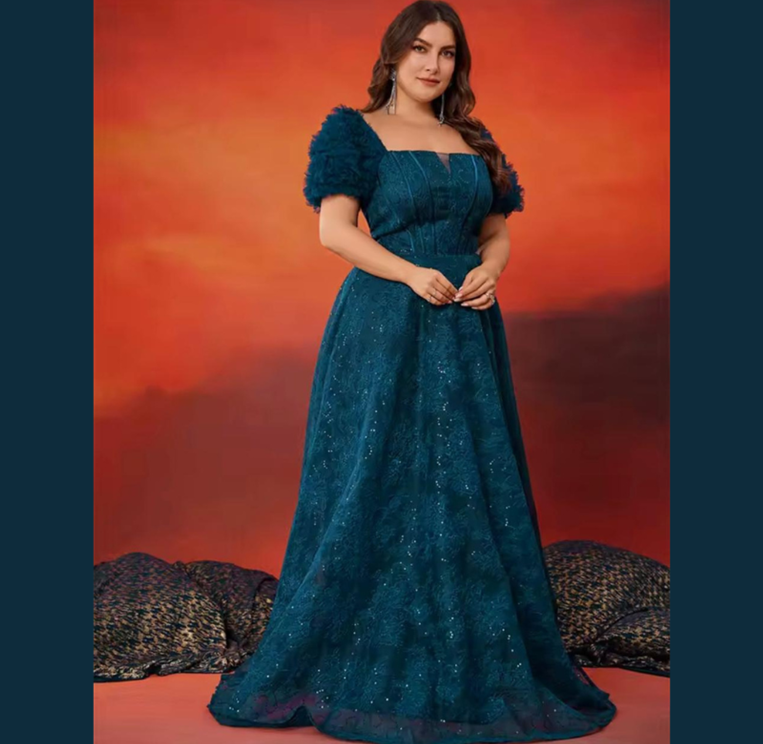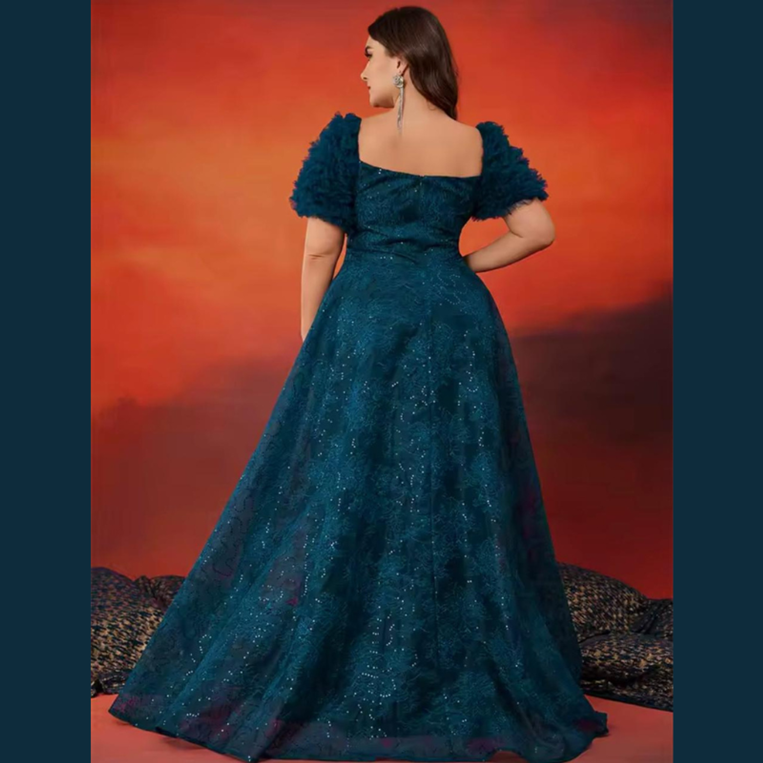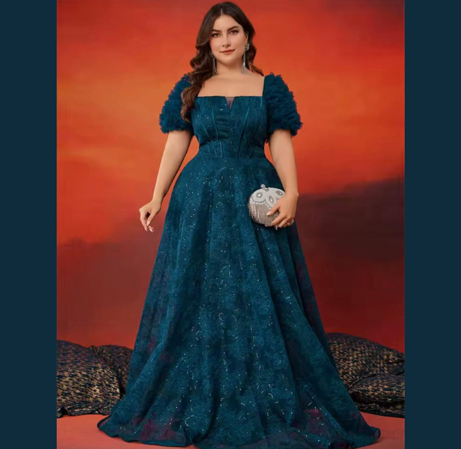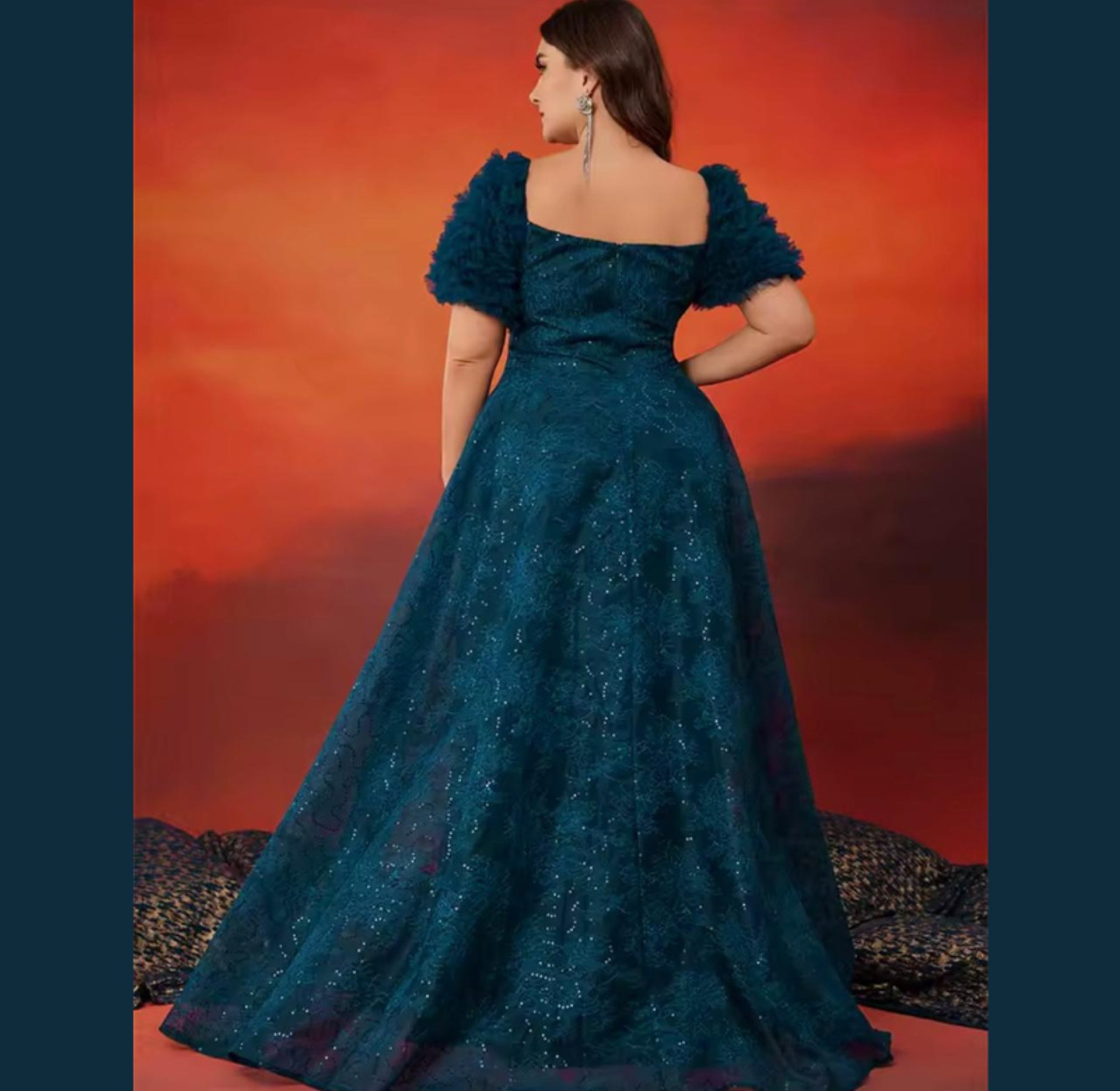 This magnificent navy blue A-line gown features a striking, full satin skirt complemented by a delicate mesh bodice adorned with intricate, tonal embroidery. The combination of rich color and contrasting textures creates a sophisticated and timelessly regal evening look.