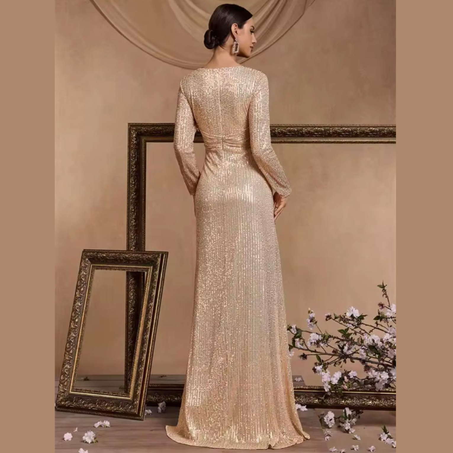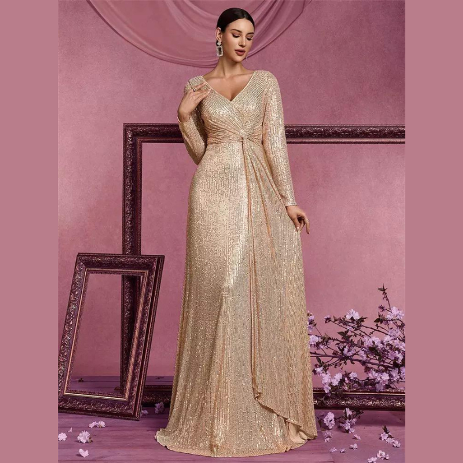 This dazzling maxi dress is entirely covered in radiant sequins, featuring a sophisticated deep V-neck and flattering long sleeves for a sleek silhouette. It's the ultimate choice for injecting high-voltage glamour and sparkle into any evening event.