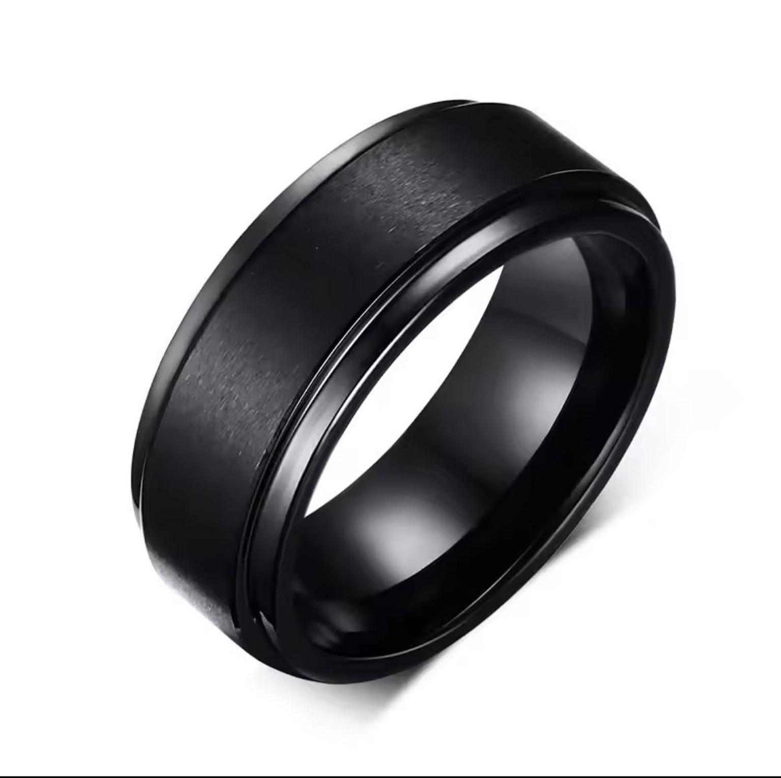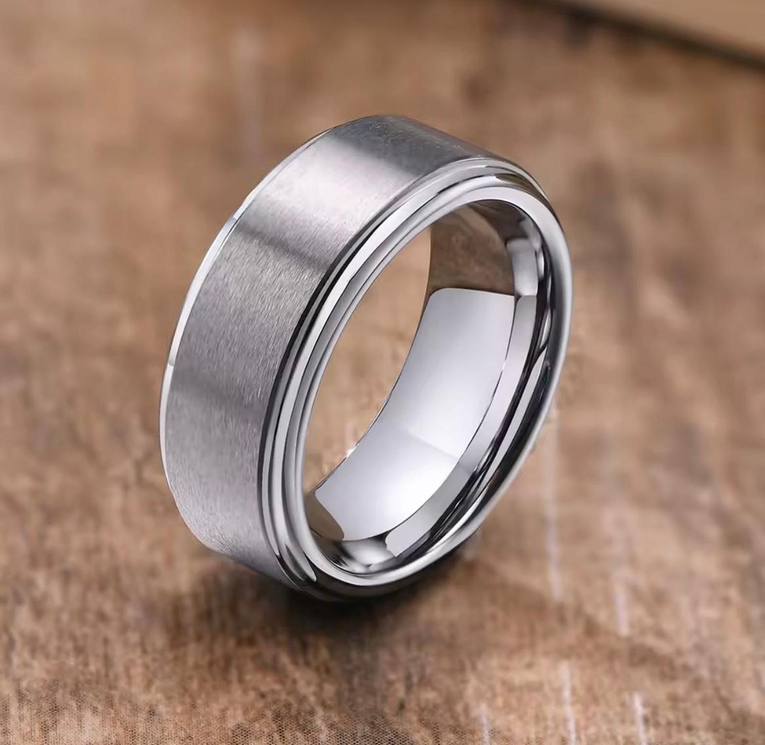 Durable 8mm Tungsten Carbide men's ring with a matte finish center and polished beveled edges. Available in sleek Silver or bold Black.