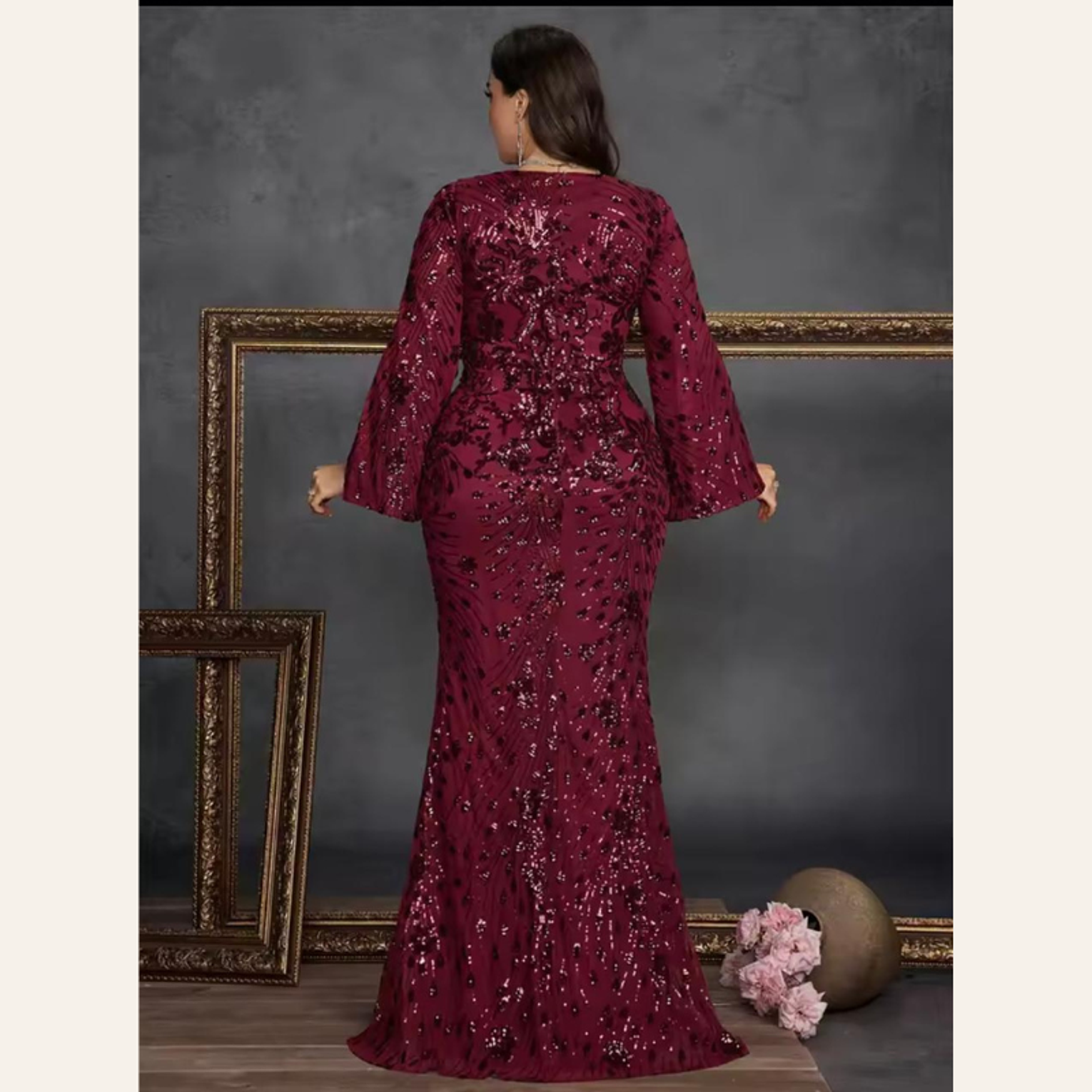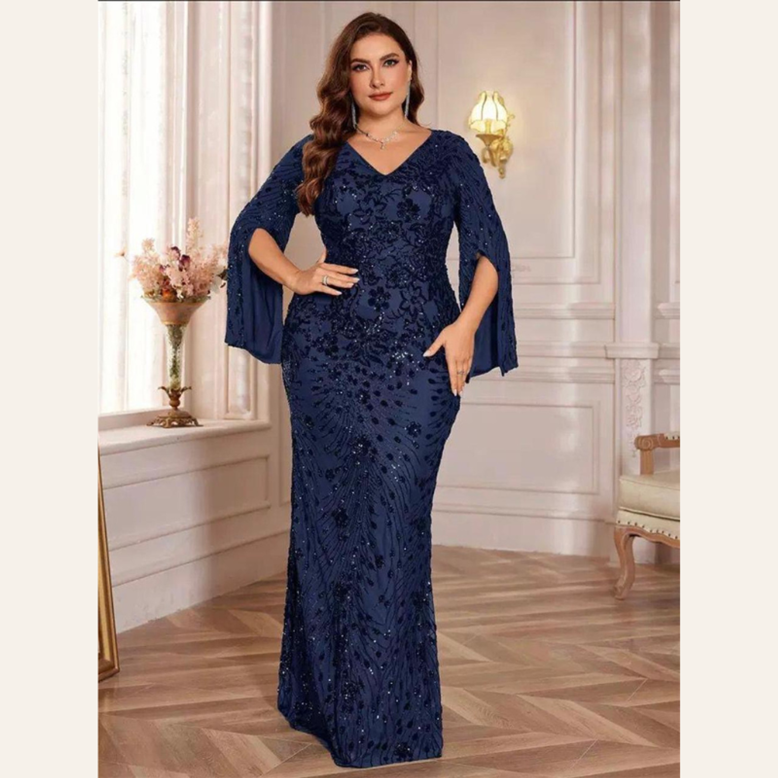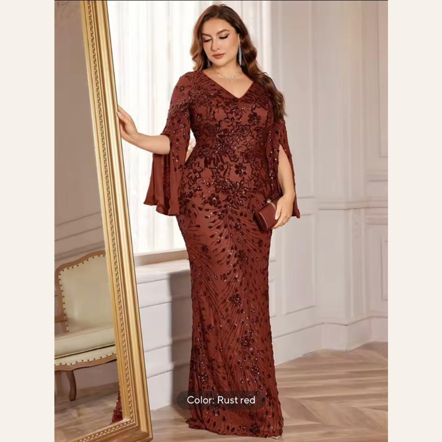 This breathtaking plus-size gown features a sophisticated rust-red sequin embroidery in a figure-flattering mermaid cut, complete with elegant, flowing slit sleeves. It offers luxurious texture and dramatic movement, perfect for the most exclusive of events.