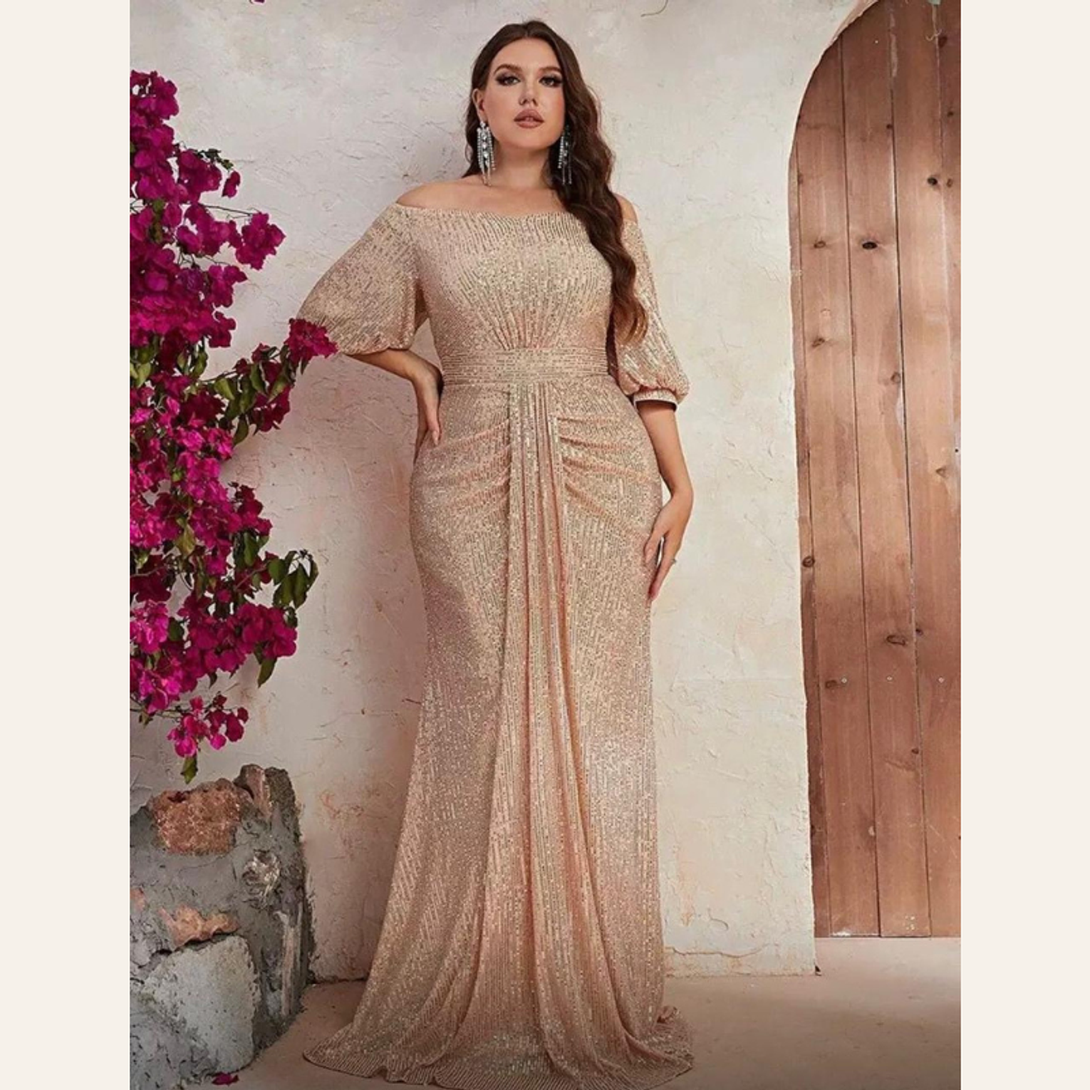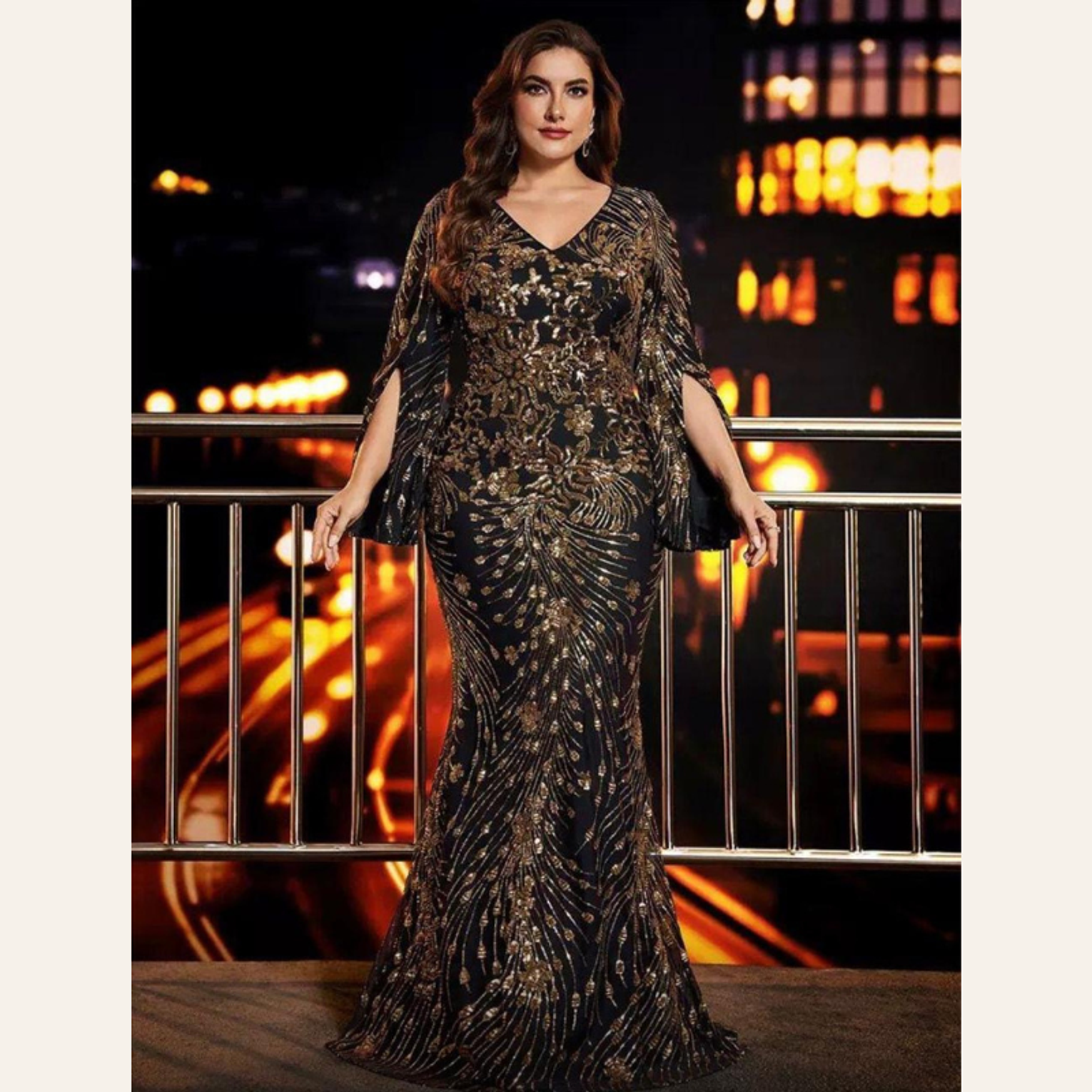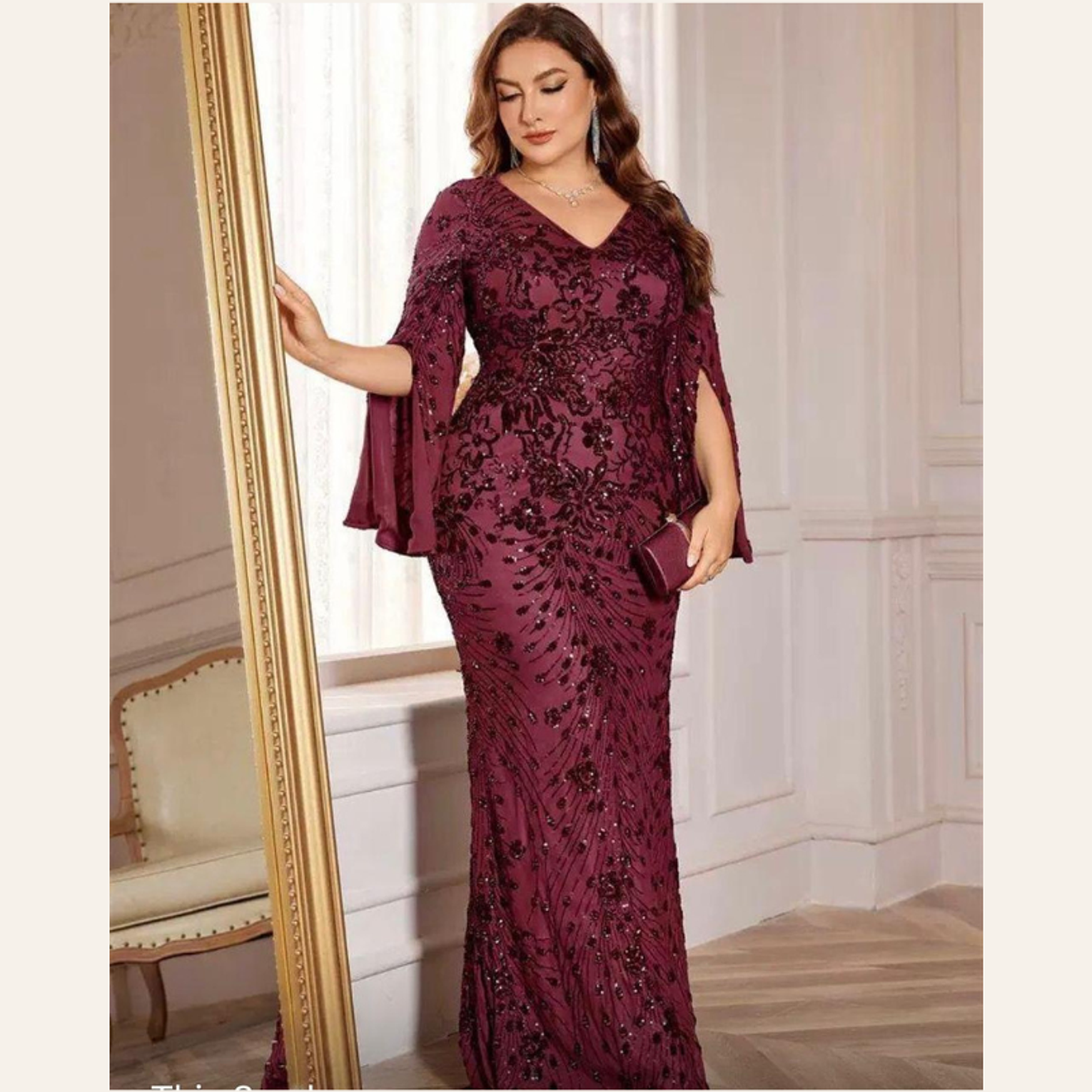 This breathtaking plus-size gown features a sophisticated rust-red sequin embroidery in a figure-flattering mermaid cut, complete with elegant, flowing slit sleeves. It offers luxurious texture and dramatic movement, perfect for the most exclusive of events.