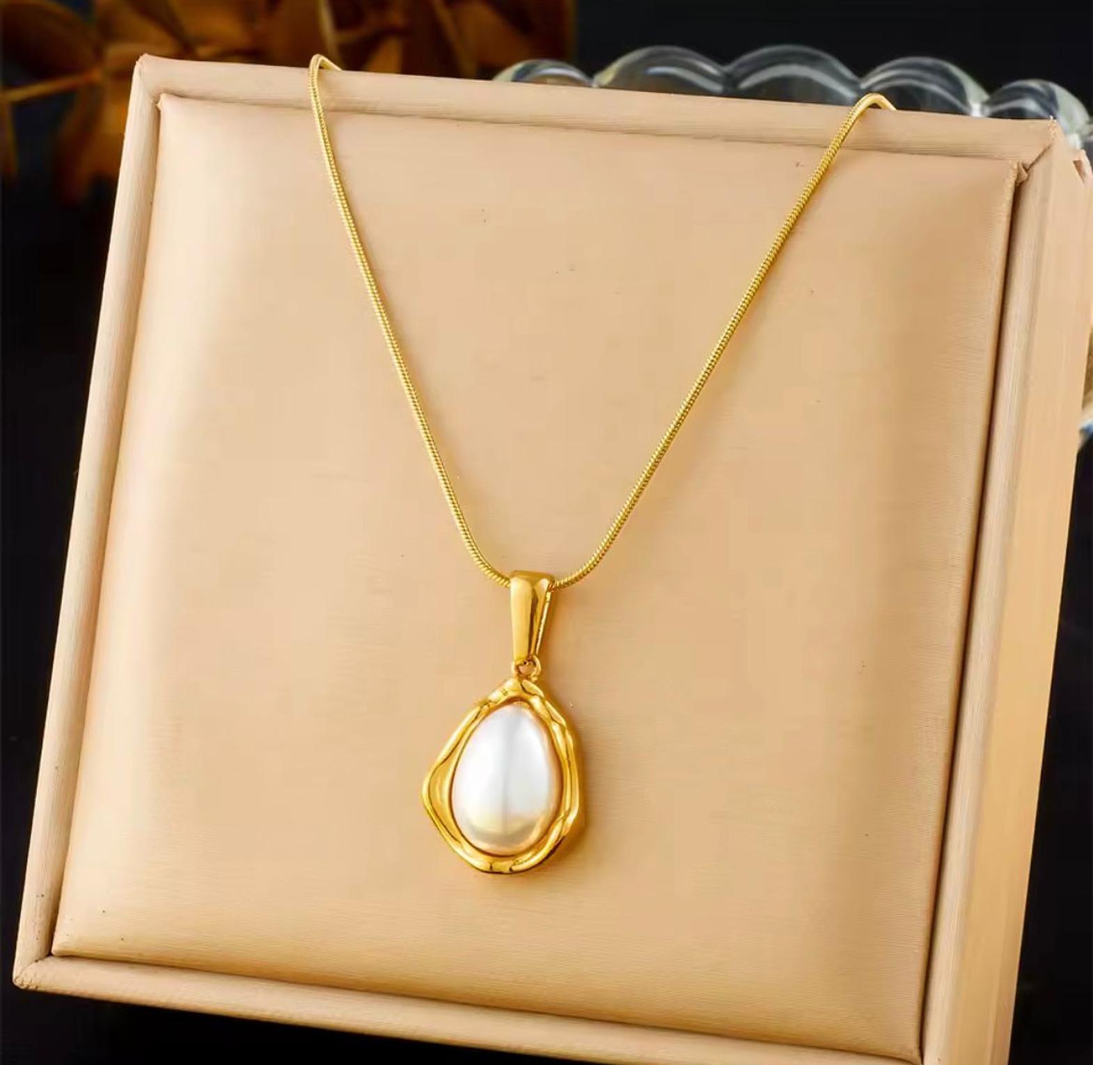 This elegant necklace features a luminous, non-uniform faux pearl nestled within an organically shaped, highly polished gold-toned bezel. The gold-plated stainless steel construction ensures both robust durability and a fluid, refined presentation.