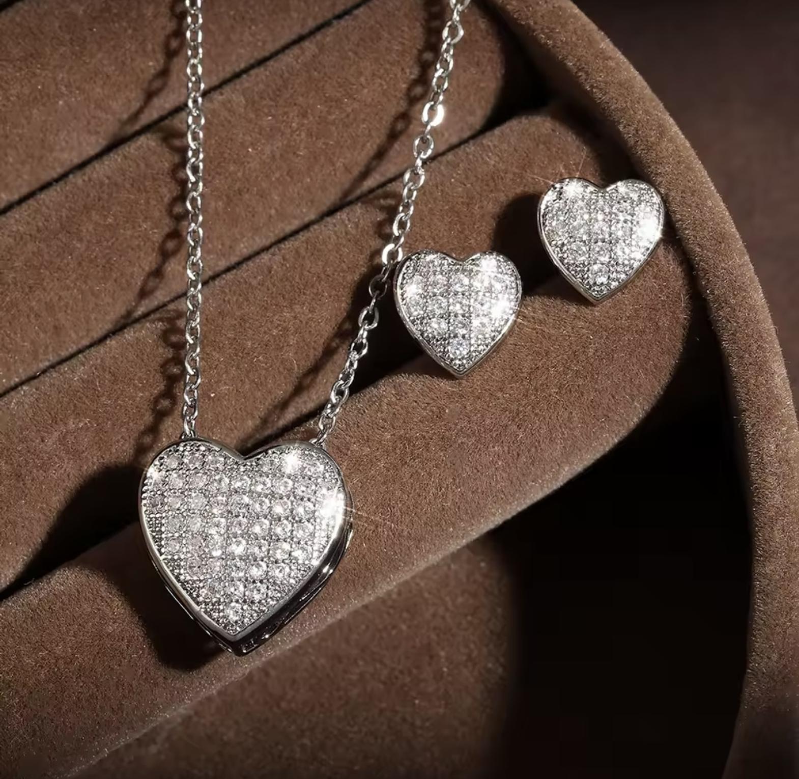 This charming jewelry set features a dainty necklace and matching stud earrings, each showcasing a small heart silhouette completely paved with brilliant stones. The classic silver-toned design offers a touch of enduring romance and subtle sparkle.