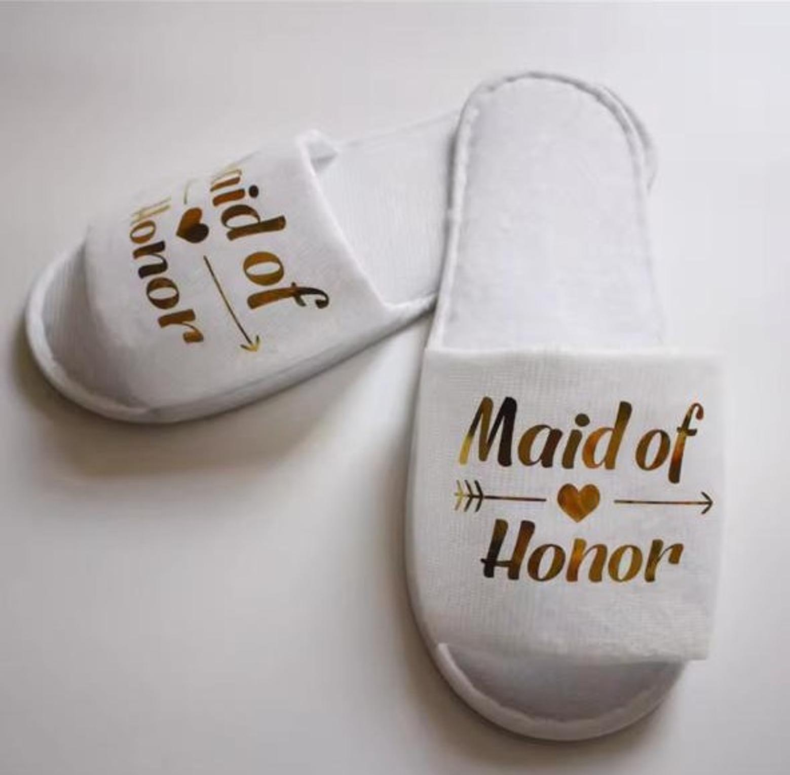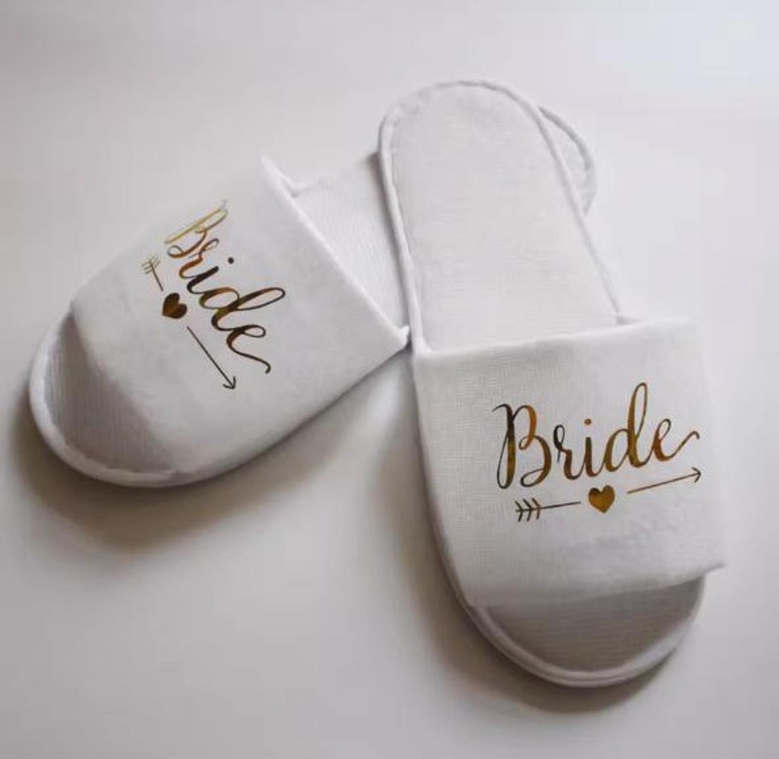 These soft, comfortable white slippers are personalized with shimmering gold foil accents identifying key roles like "Bride," "Maid of Honor," and "Bridesmaid." They offer a luxurious and coordinated touch for getting ready on the wedding day.