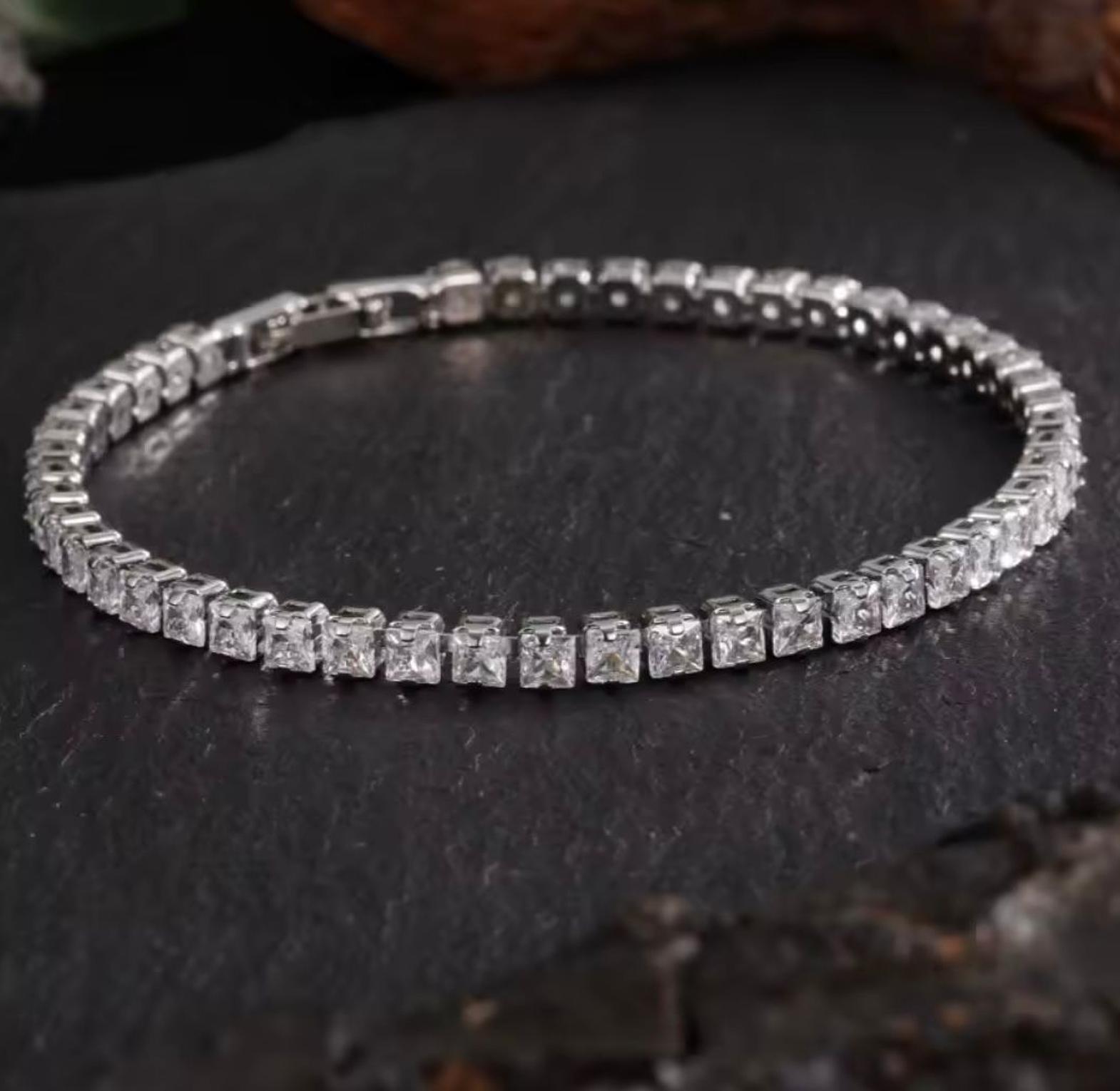 Featuring a continuous line of stunning emerald-cut cubic zirconia stones, this bracelet offers understated glamour and exceptional shine. Crafted in a gleaming silver finish, its construction is completely hypoallergenic for comfortable, worry-free wear.