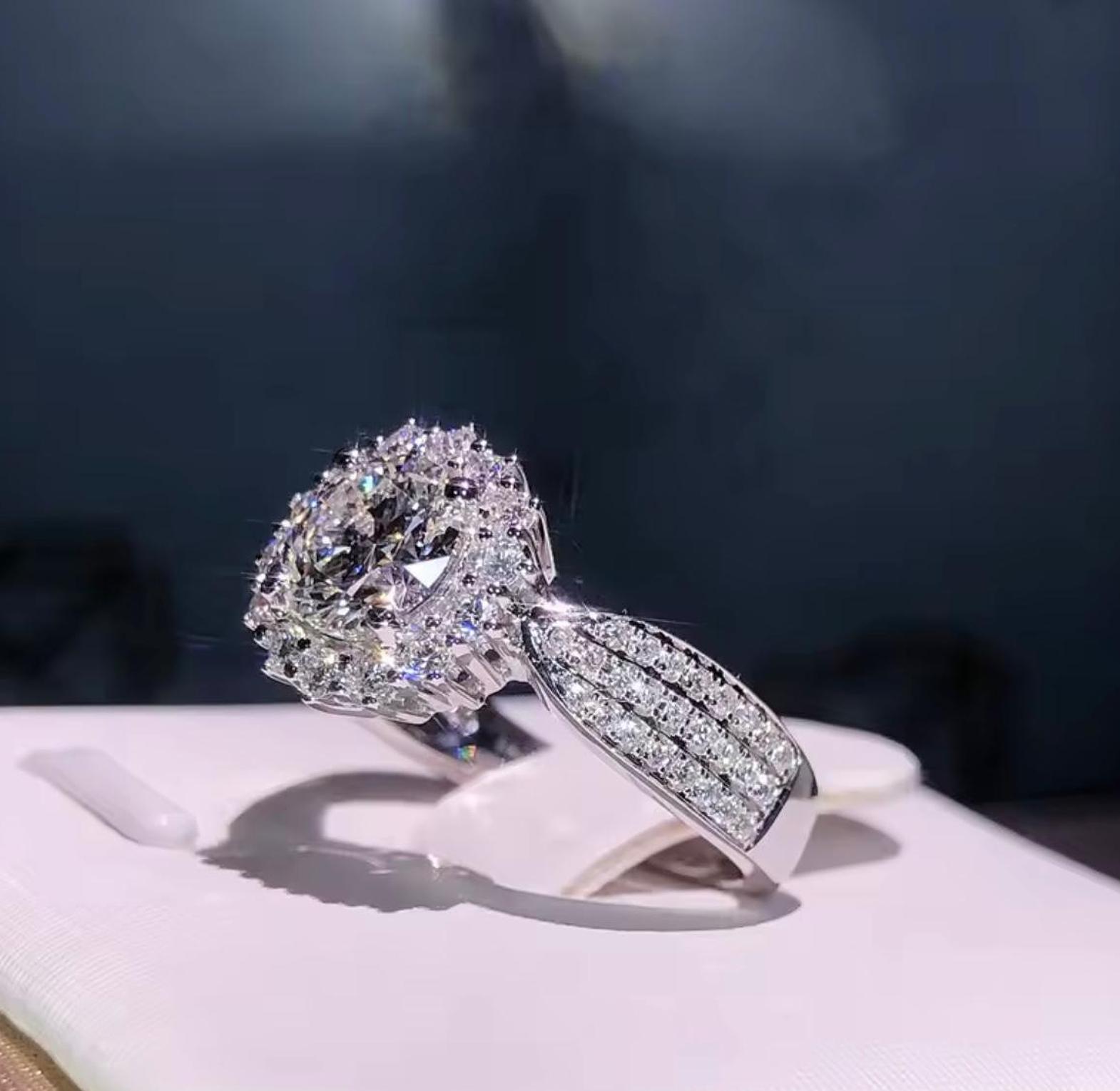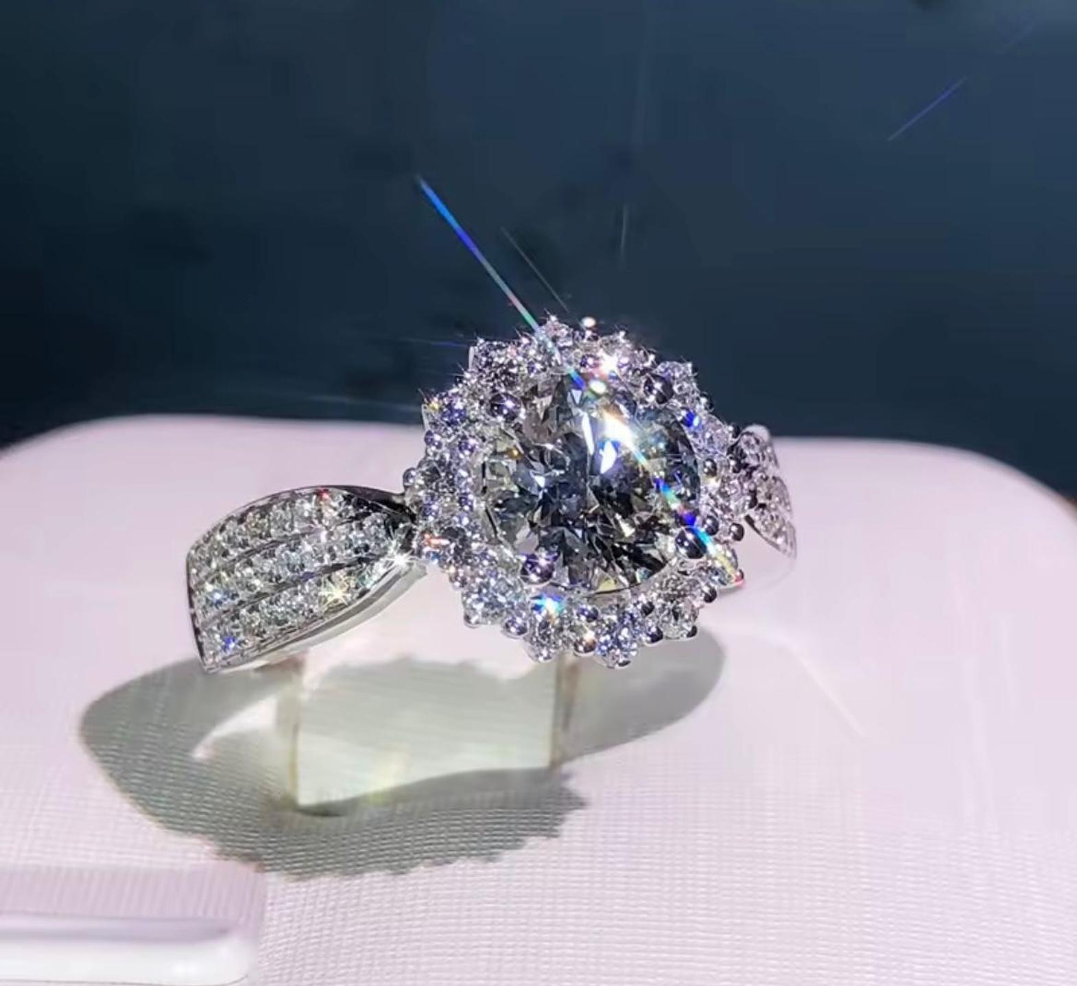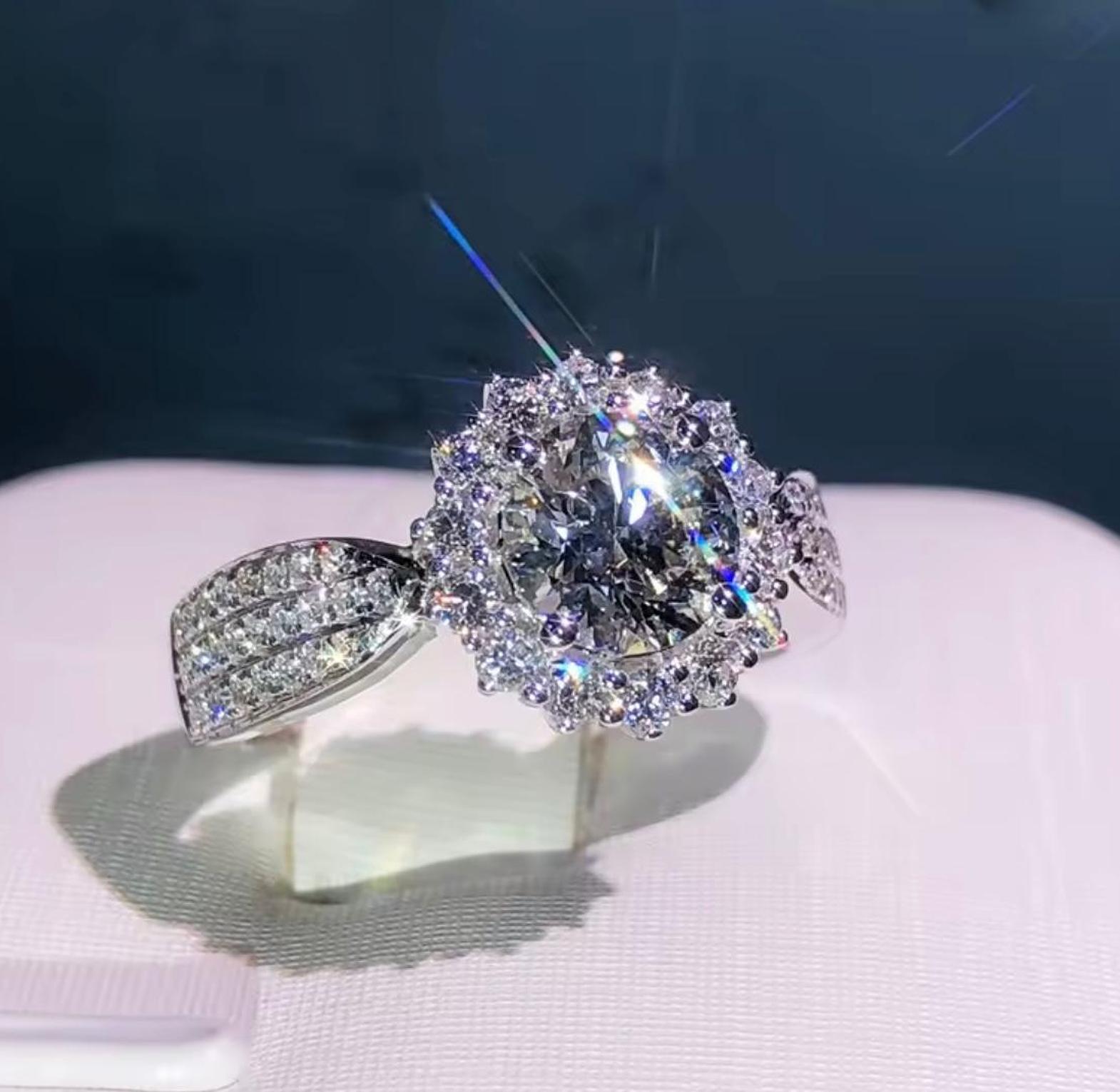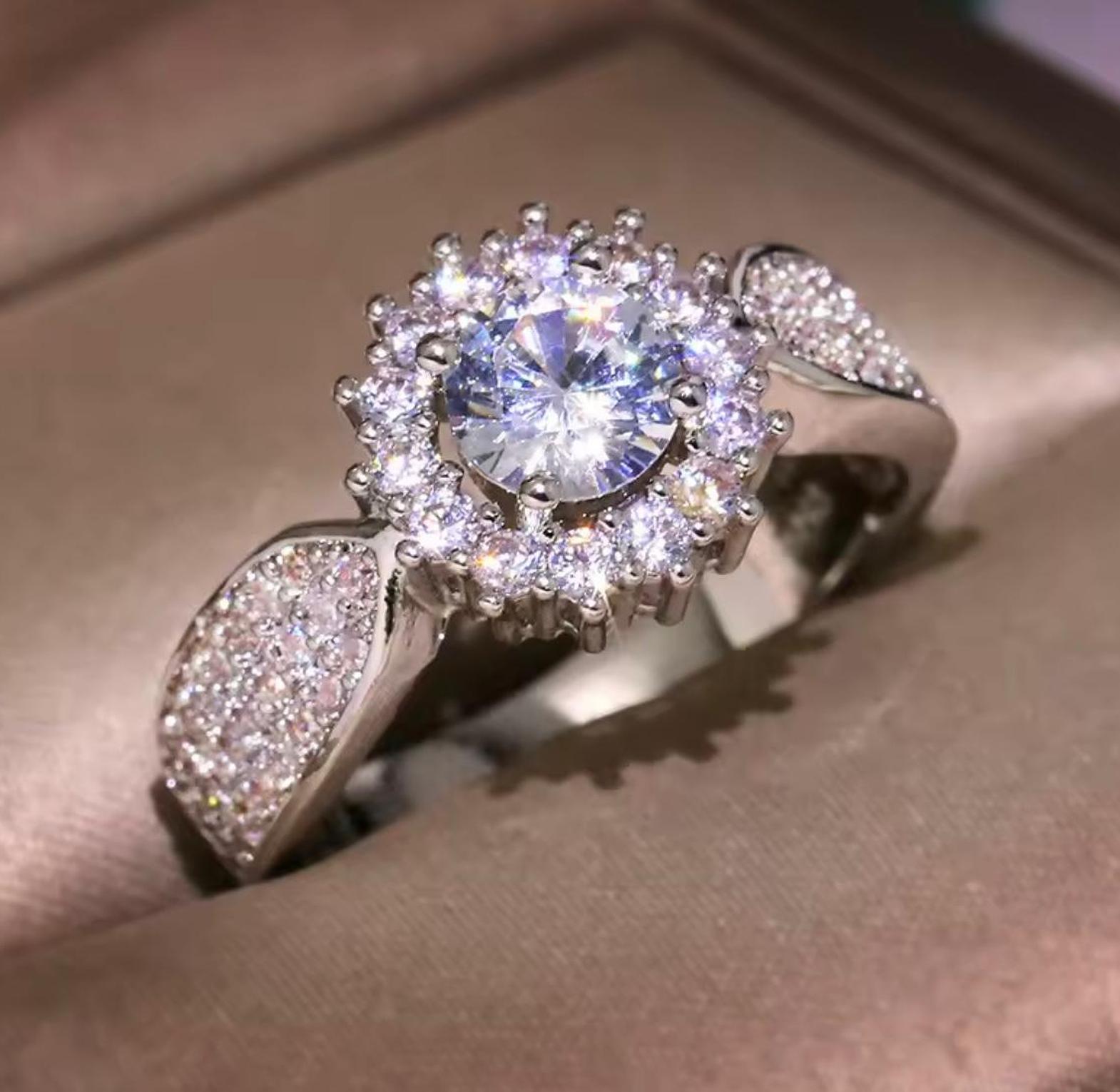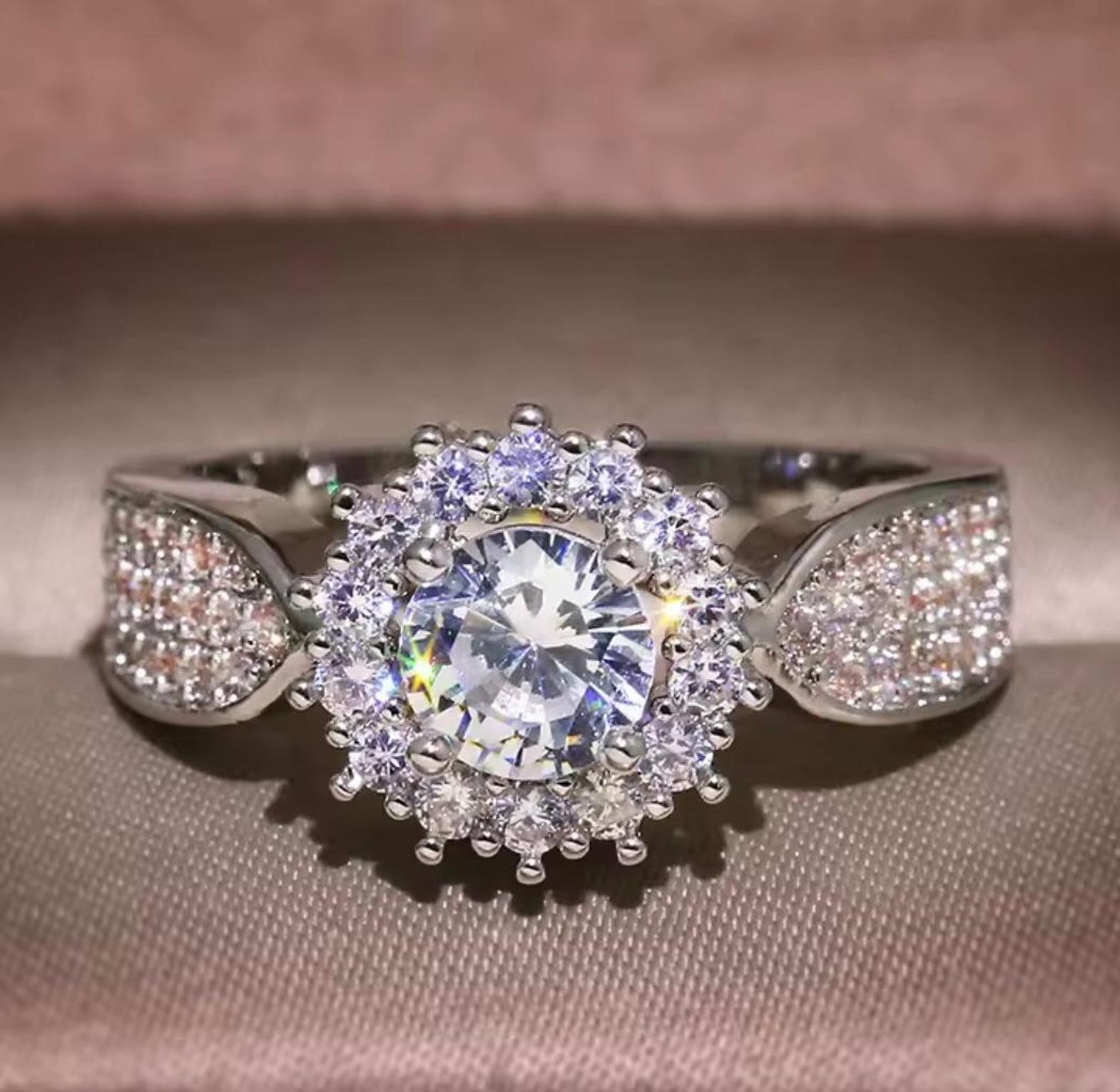 Captivate the room with this exquisite pure silver statement ring, featuring a brilliant round-cut center stone surrounded by a dazzling floral-inspired halo. Its intricate pavé-set shoulders and high-shine finish offer a luxurious, vintage-inspired aesthetic for any special occasion.