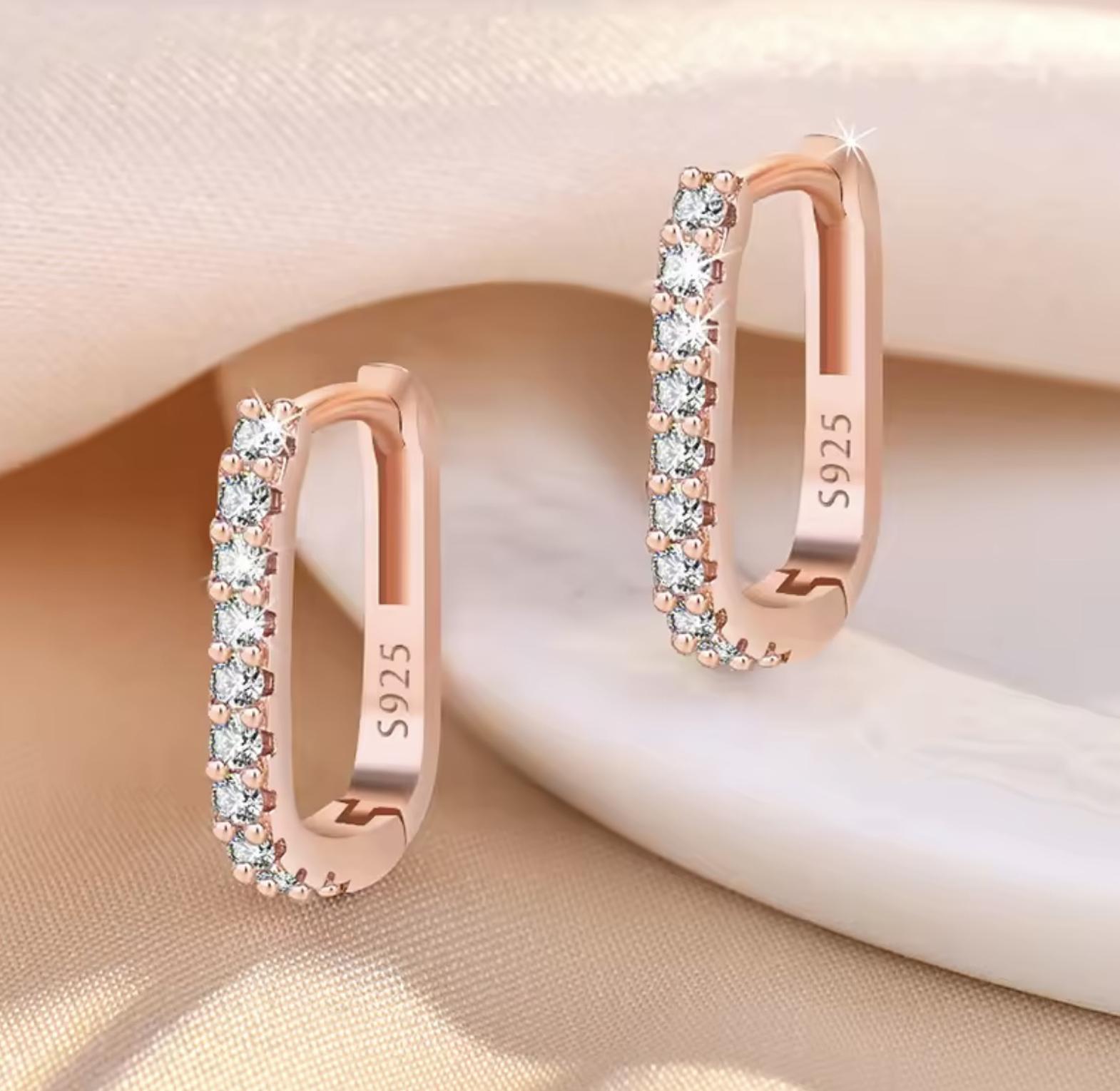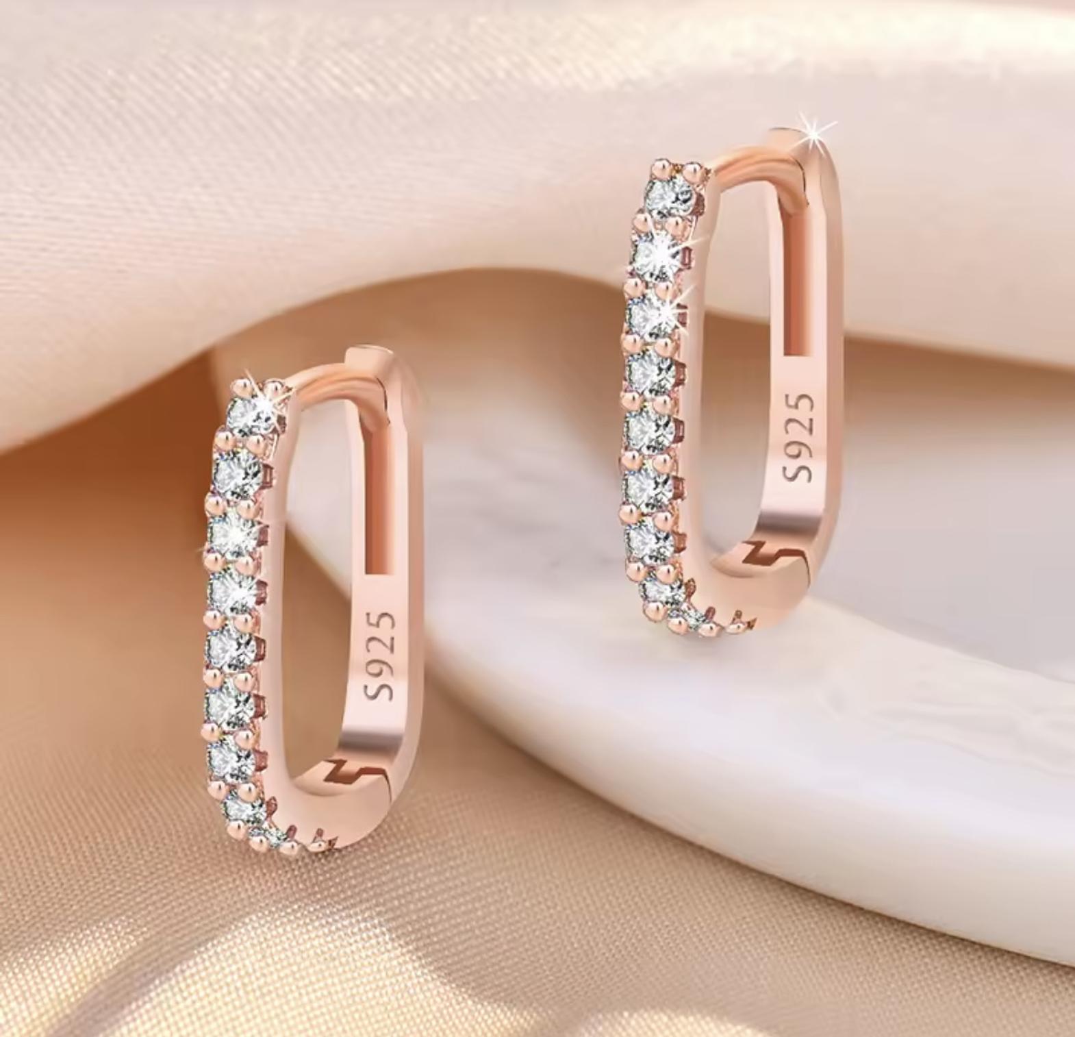 These sleek, uniquely shaped huggie hoops feature a modern rectangular profile entirely encrusted with dazzling pave-set cubic zirconia stones. They provide continuous, geometric sparkle and fit snugly for comfortable, everyday elegance.