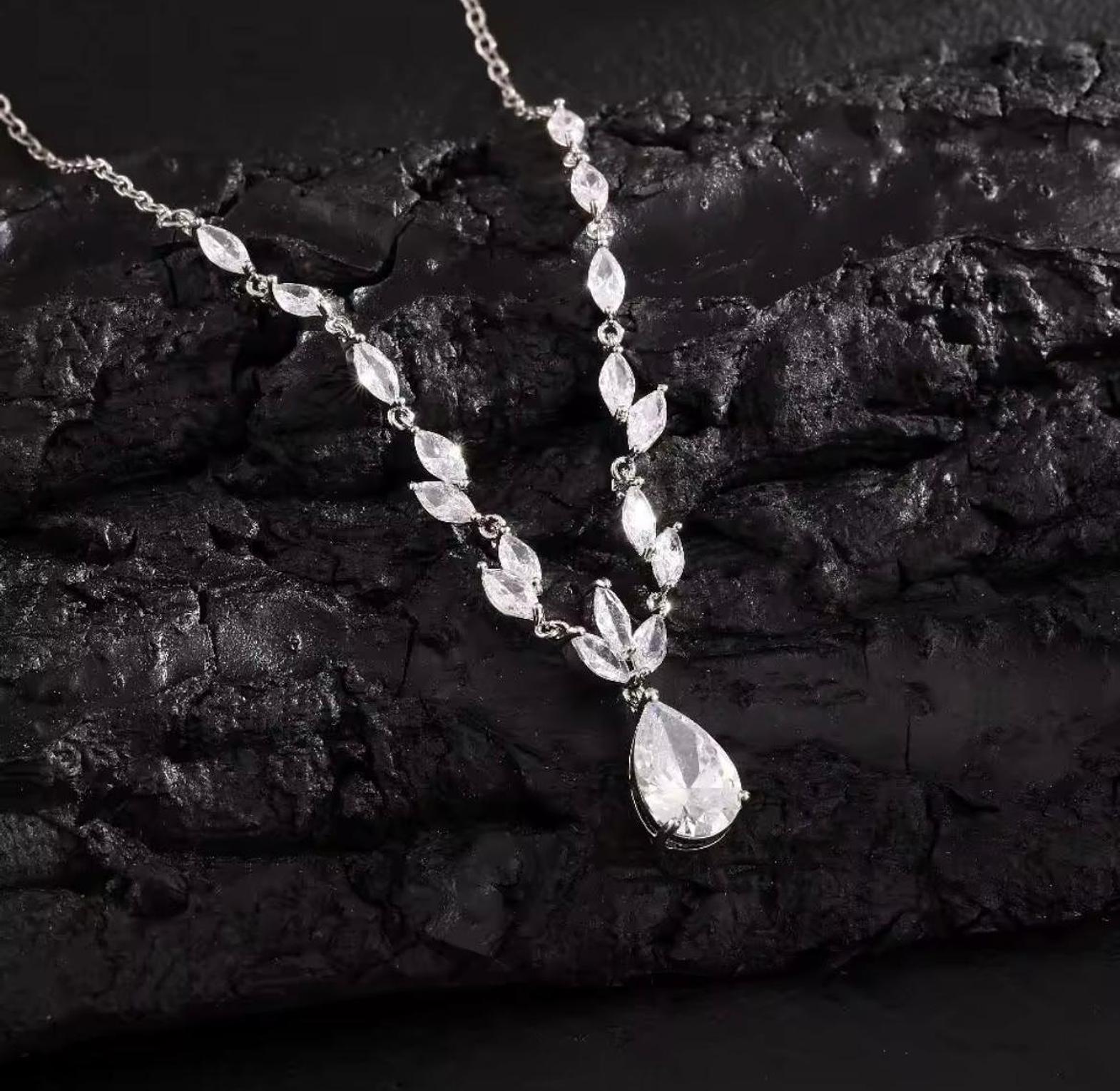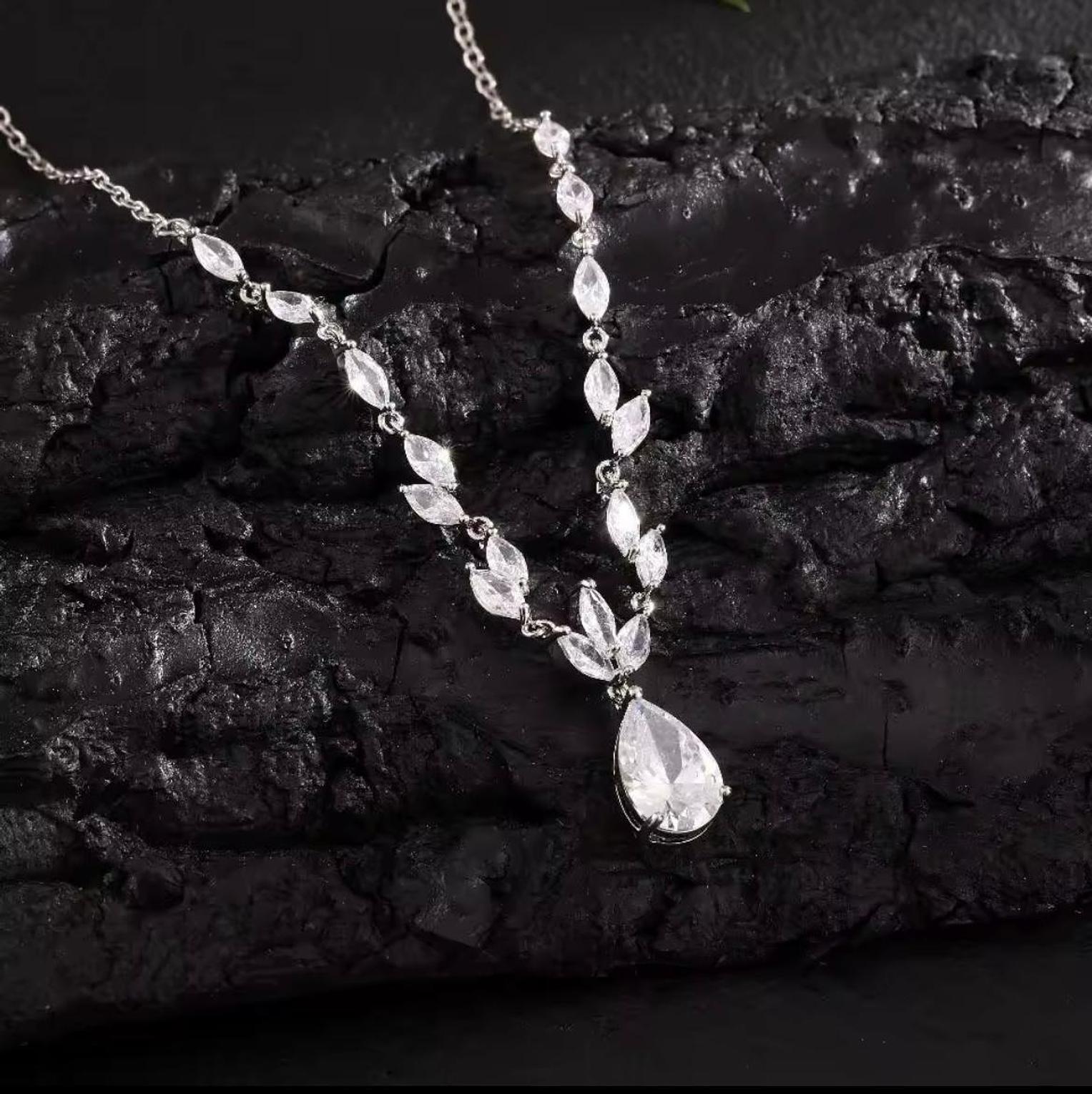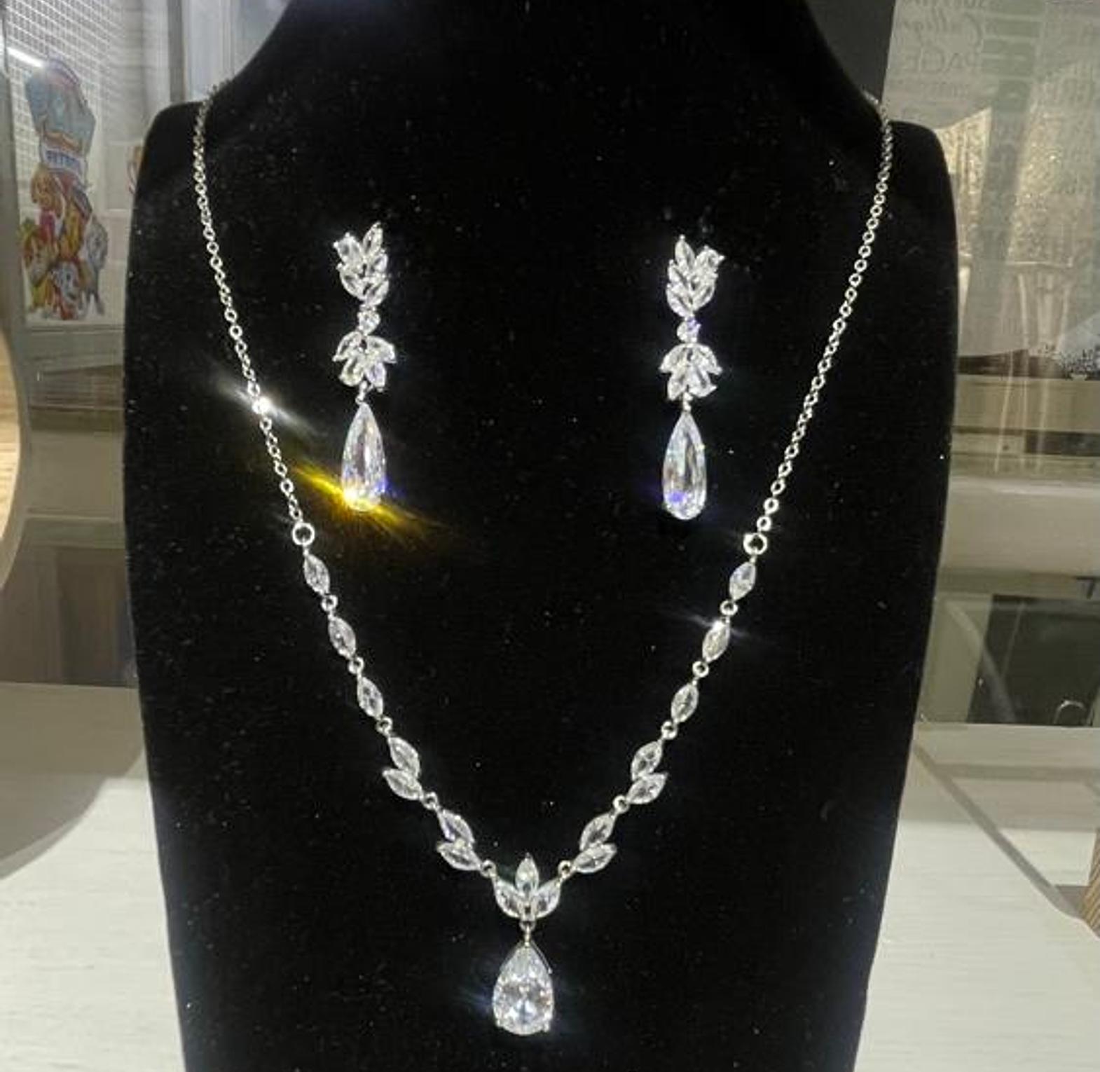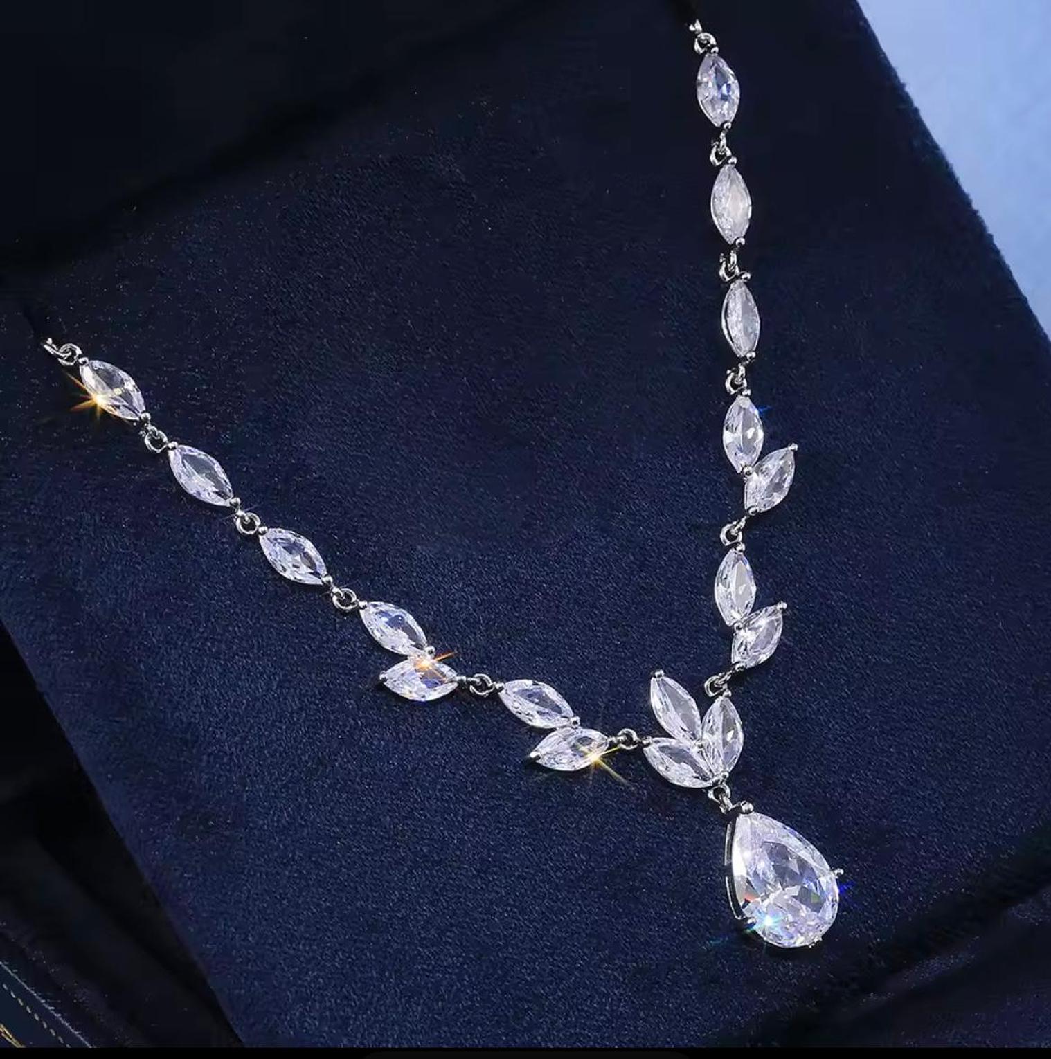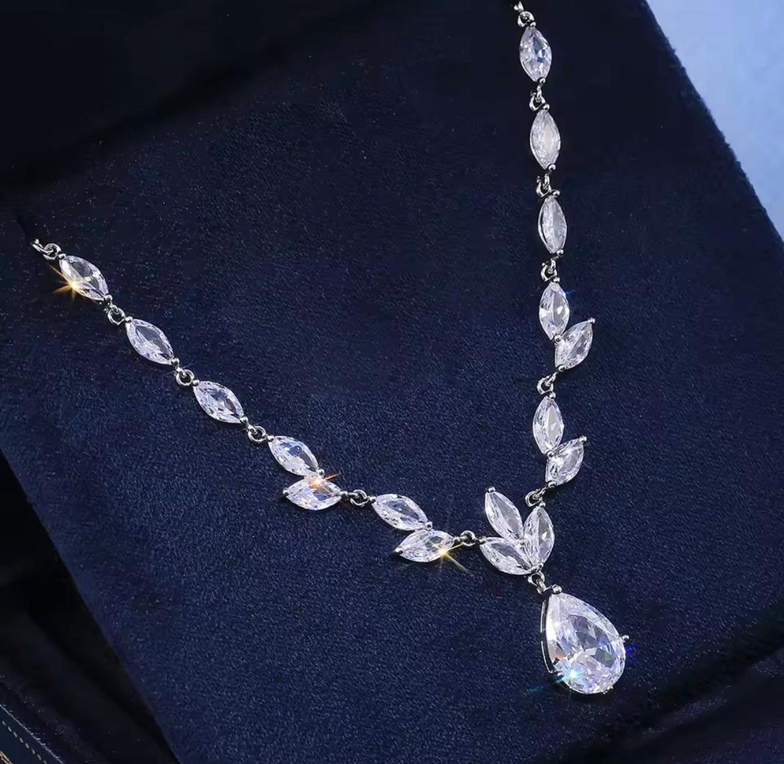This stunning silver-tone set features delicate marquise-cut accents forming a graceful vine that culminates in a brilliant pear-shaped drop pendant. The perfectly coordinated necklace and earrings create a cohesive, show-stopping look for any formal event.