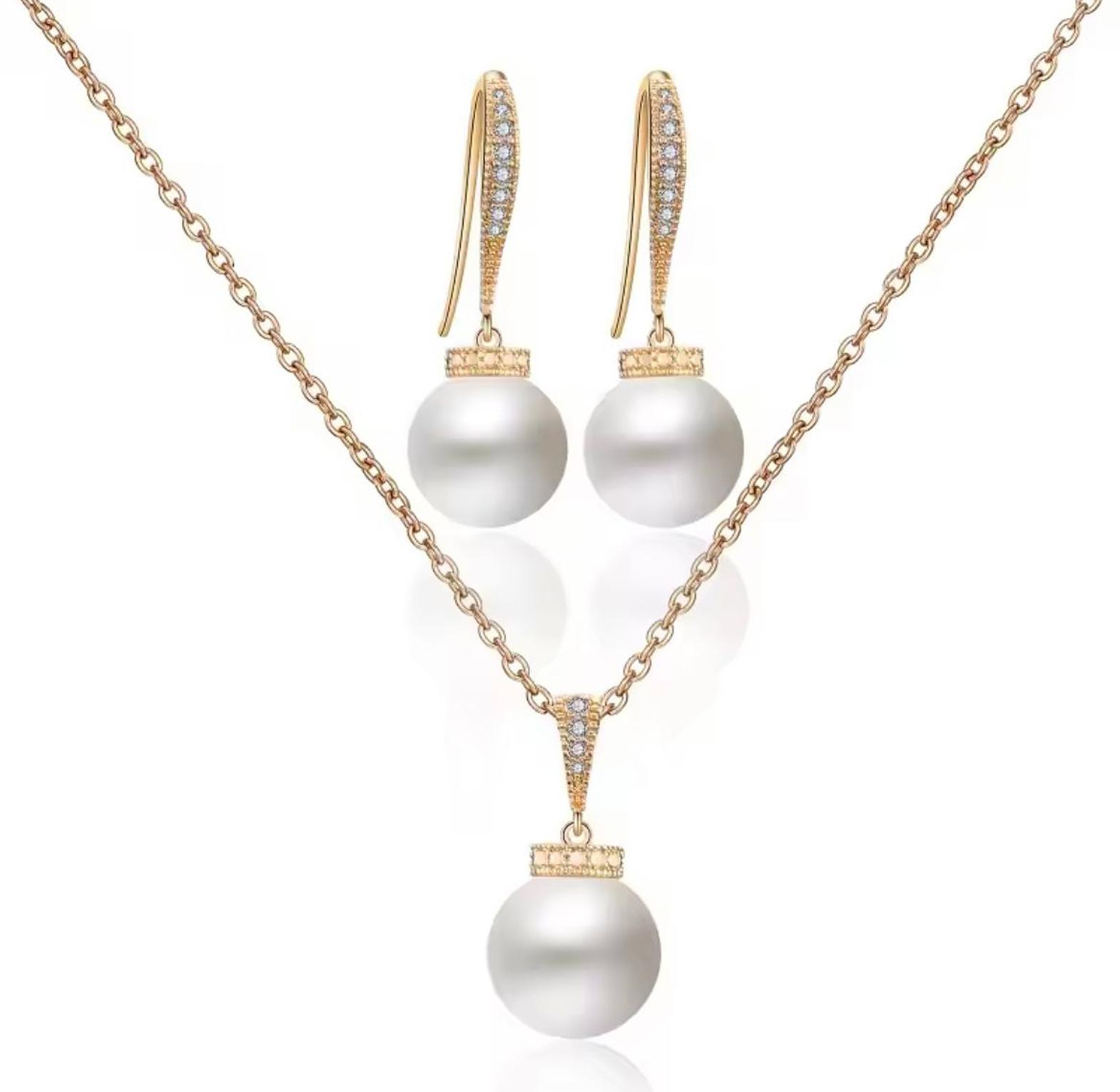 This elegant matching set features luminous simulated pearls suspended from shimmering, diamond-accented bails. The entire collection is crafted with hypoallergenic materials, ensuring comfortable, sophisticated wear for any occasion.