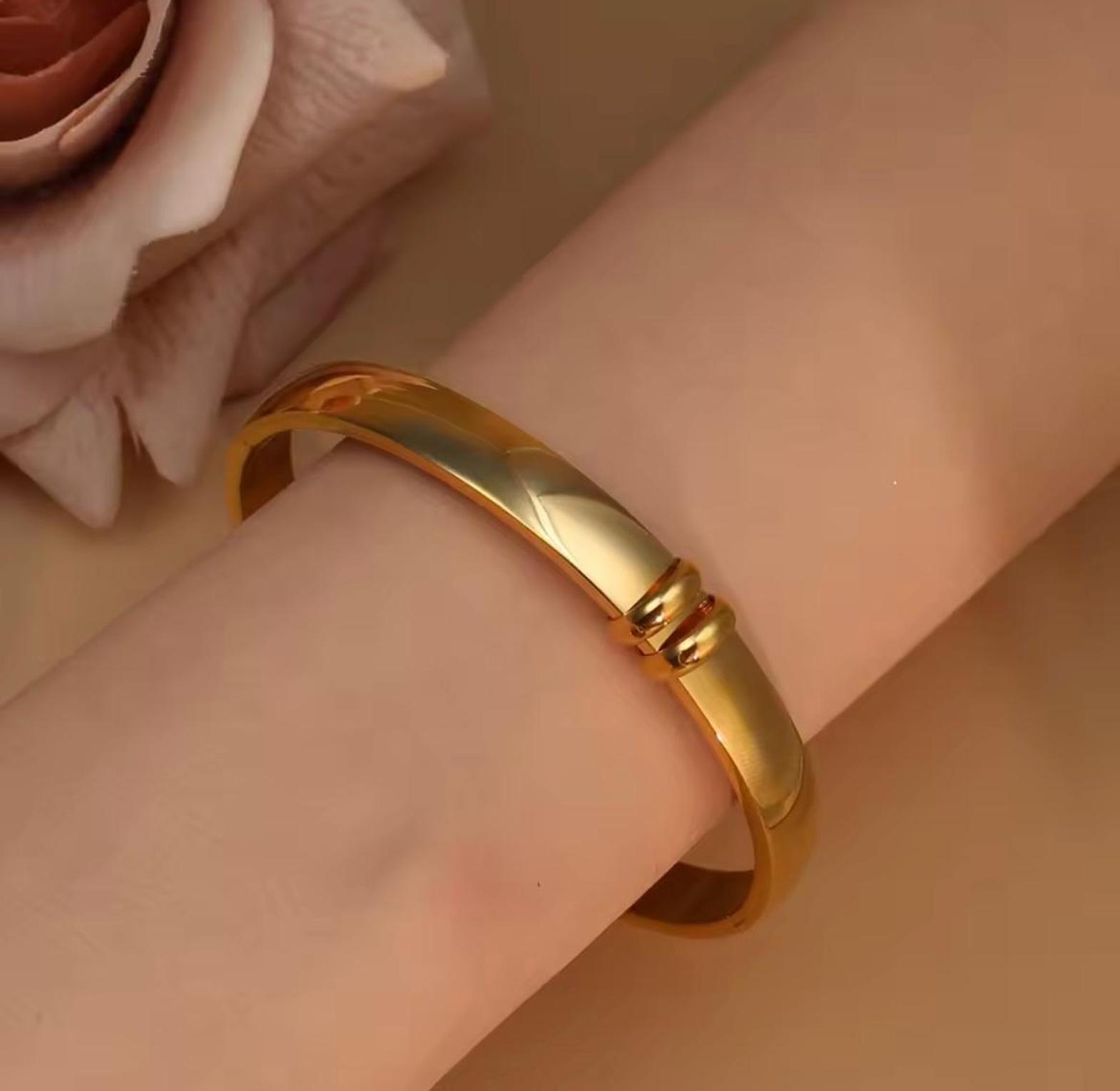 This timeless bangle features a luxurious gold plating and a polished, solid band accented by elegant etched details. Constructed with hypoallergenic properties, it offers both style and comfortable, irritation-free wear for sensitive skin.
