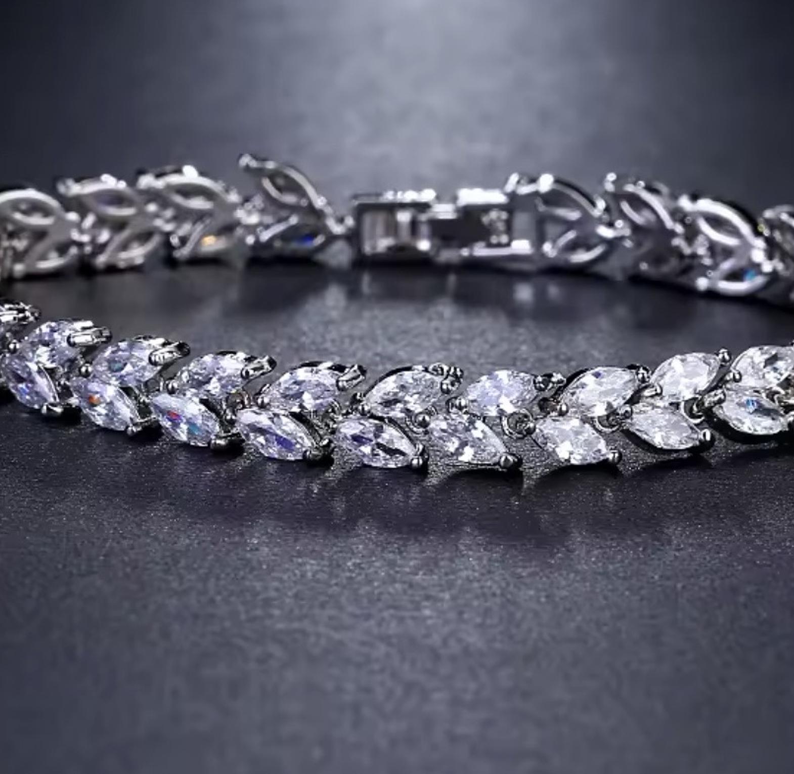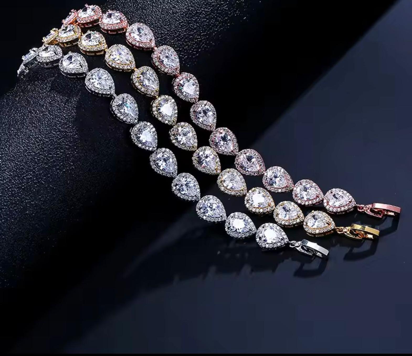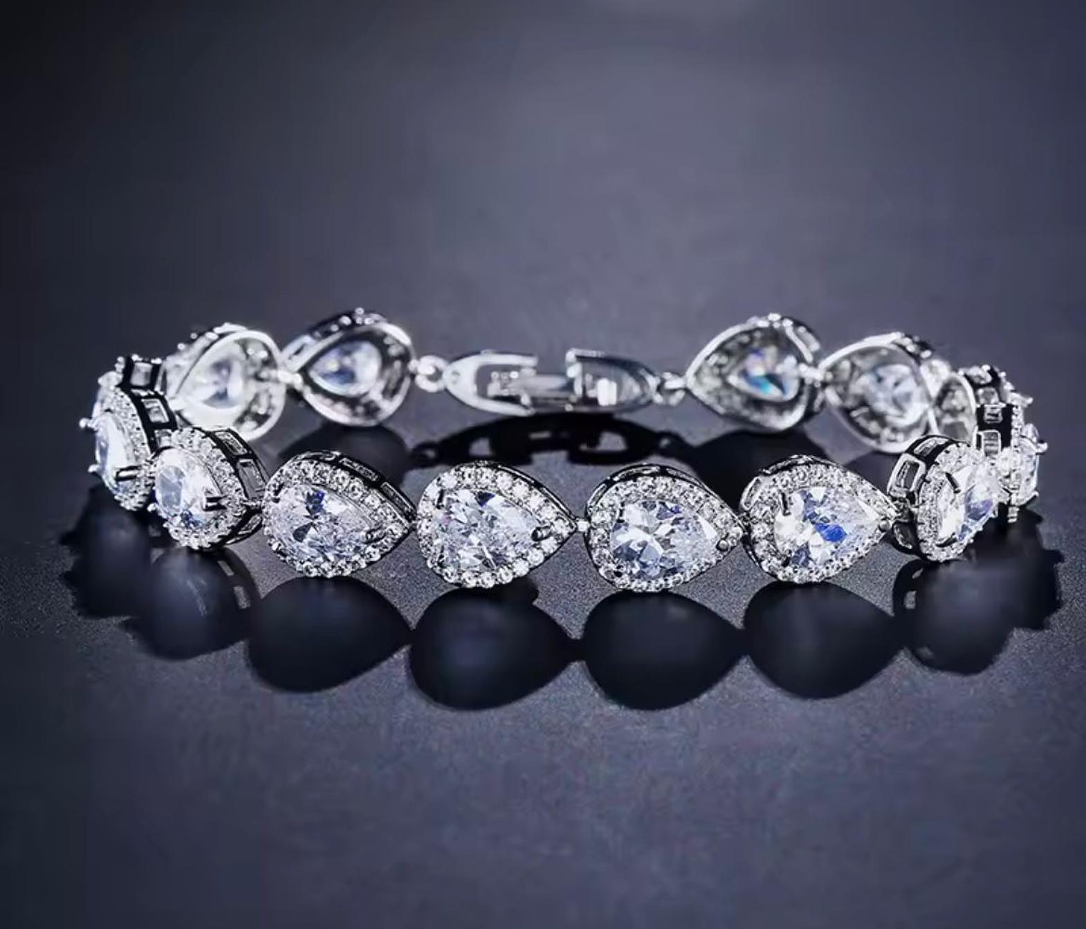 This elegant chain bracelet showcases a row of dazzling teardrop cubic zirconia stones encased in a delicate halo setting. Its superior craftsmanship ensures a comfortable, hypoallergenic fit, perfect for sensitive skin.